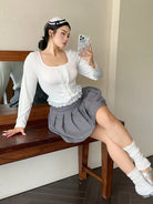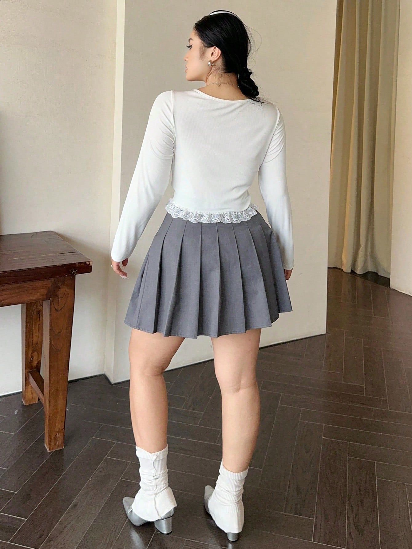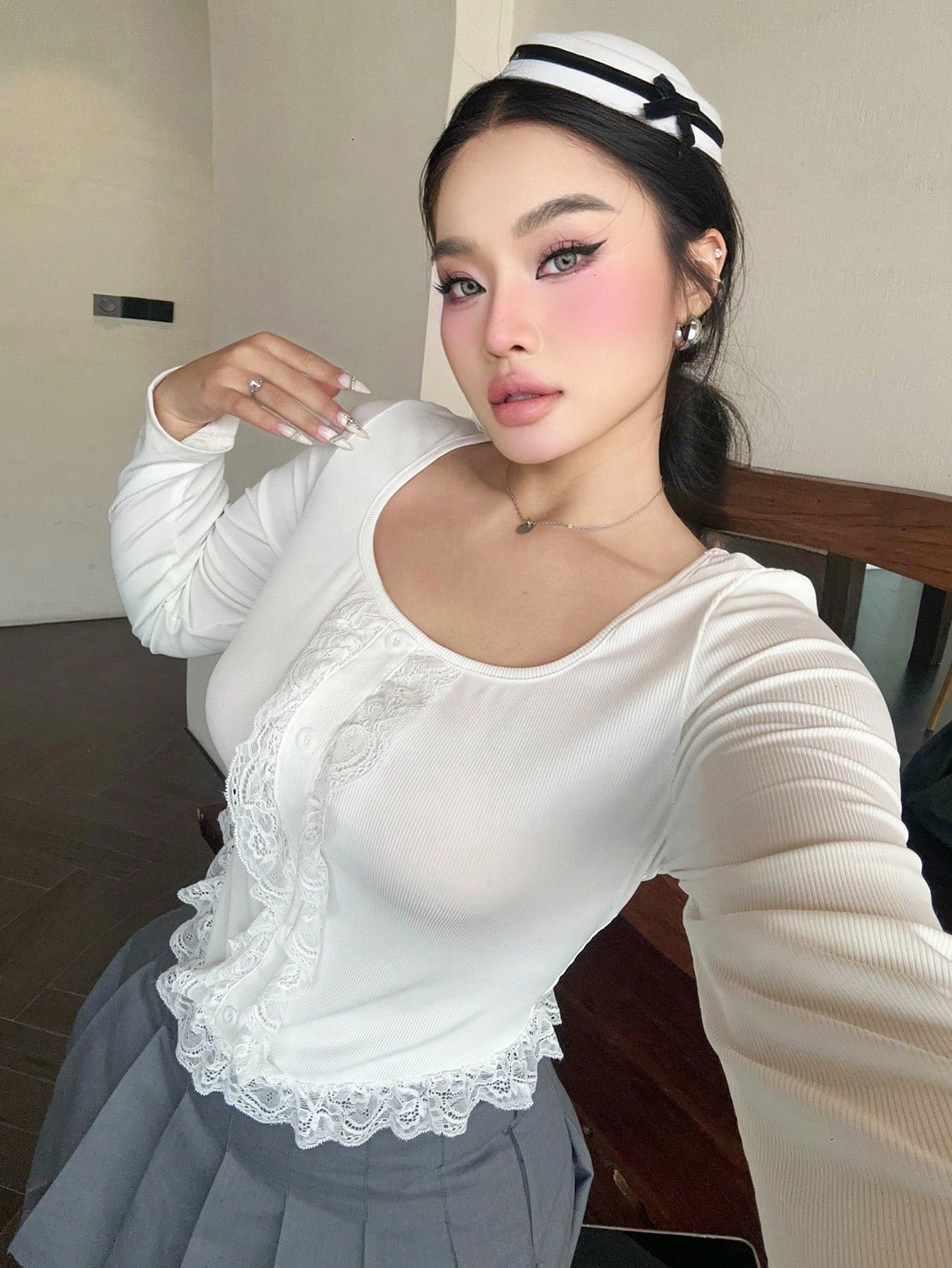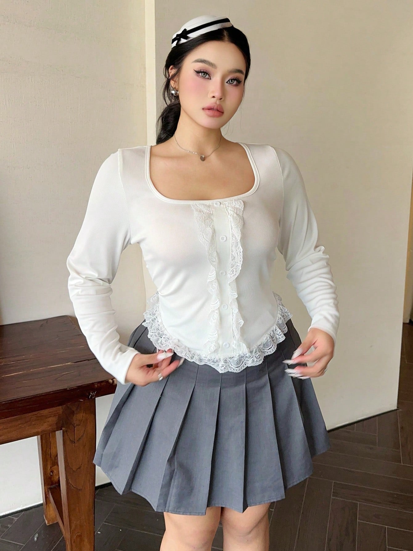 Flirla Plus Size Square Neck Romantic Floral Trim Fitted Long Sleeve T-Shirt