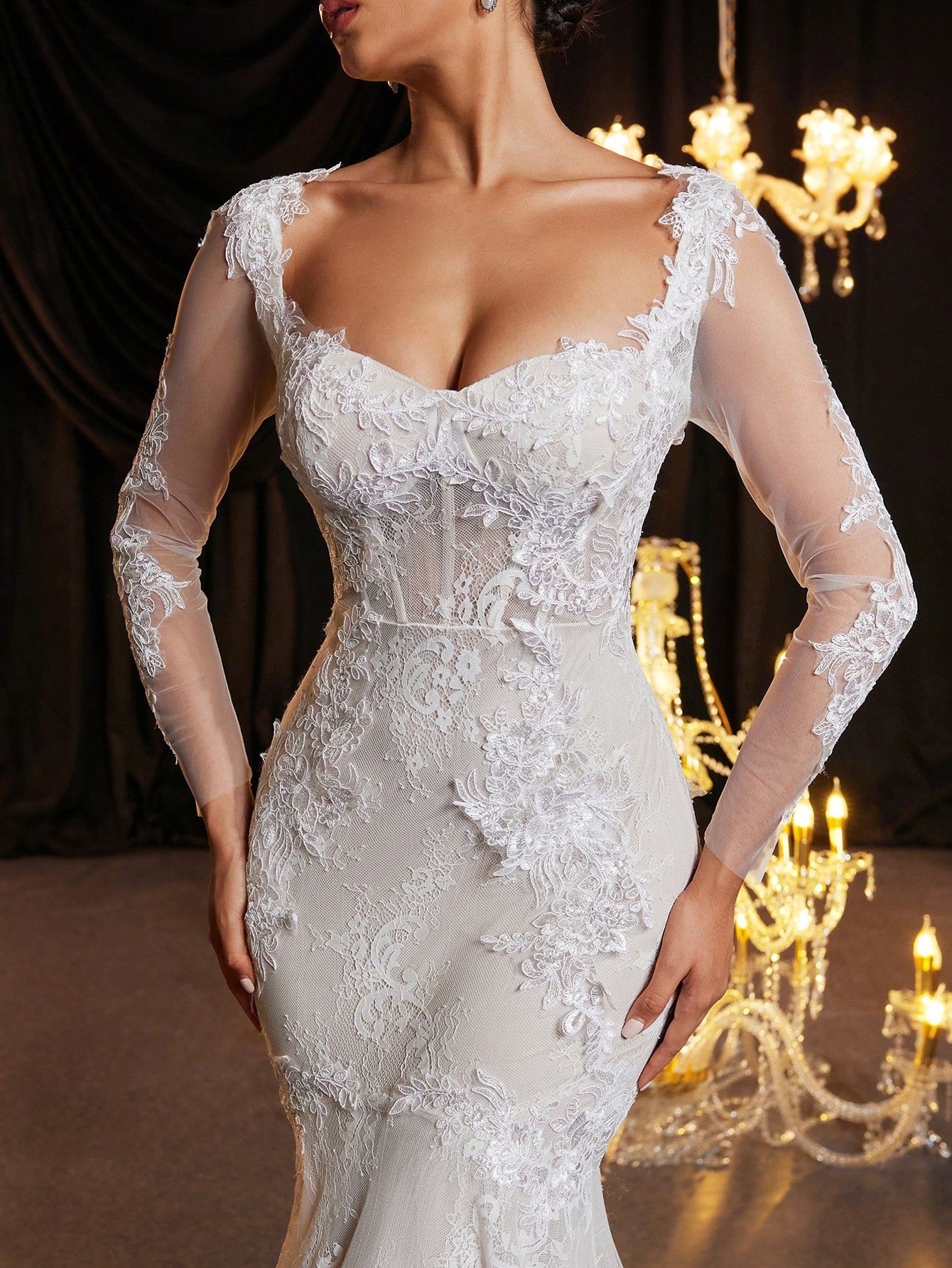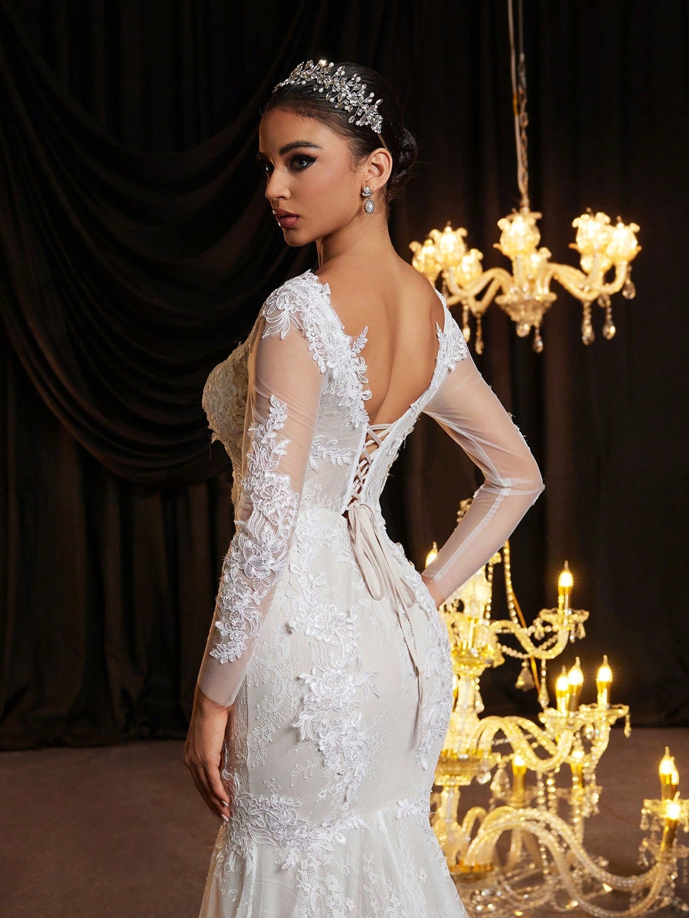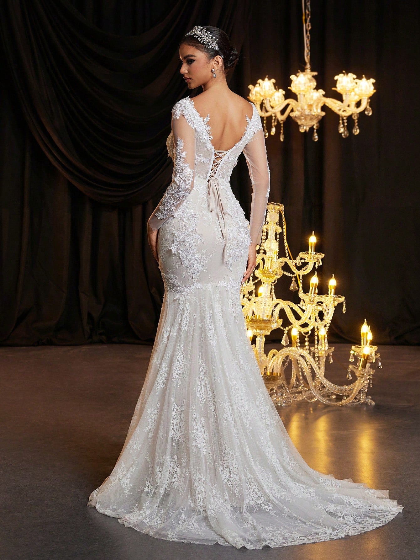 فستان سهرة أنيق وفاخر من Glamrae برقبة على شكل حرف V وظهر مكشوف ومزين بالدانتيل وشفاف من الدانتيل الفرنسي الكلاسيكي وواسع الصدر