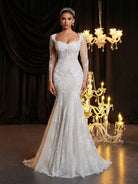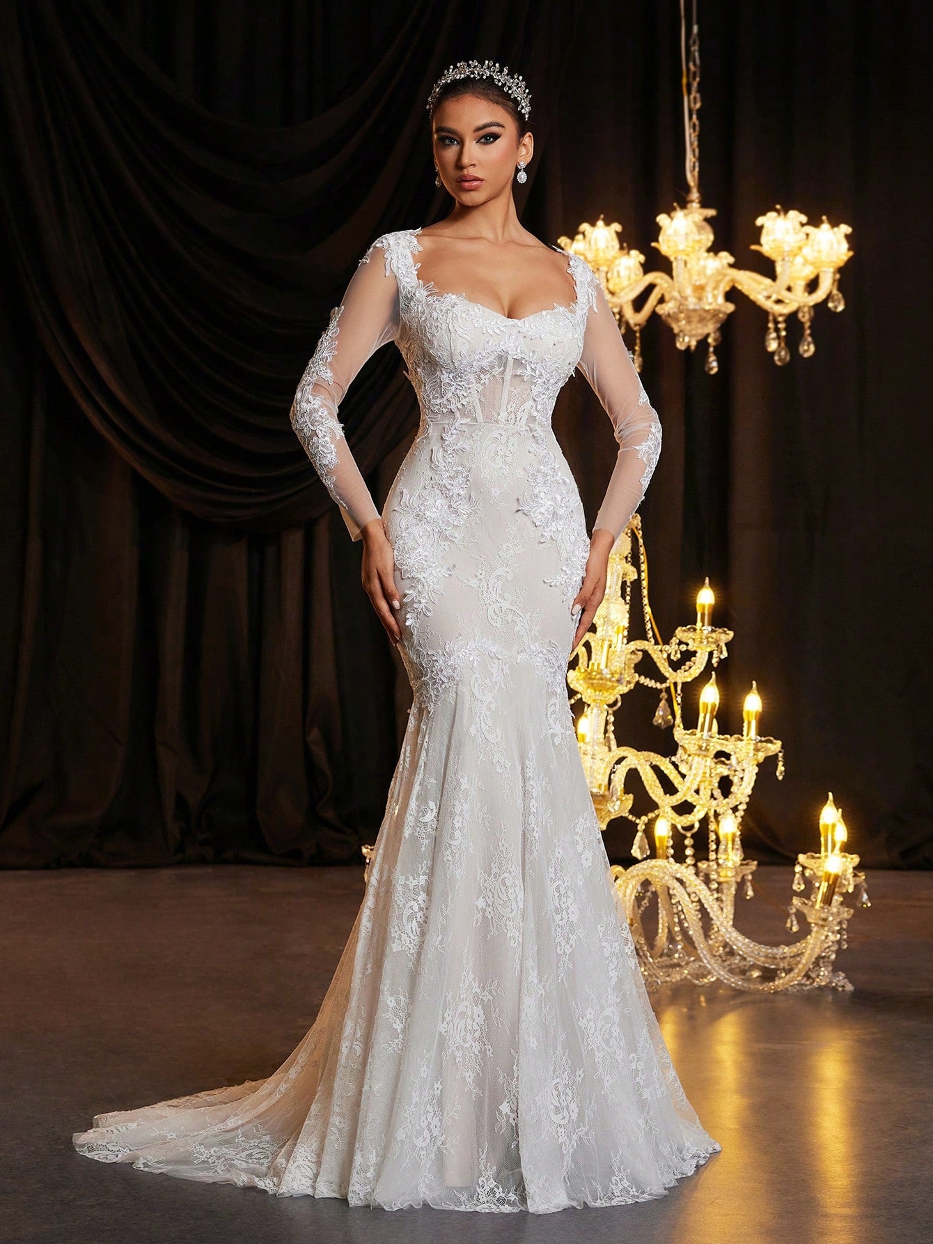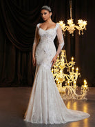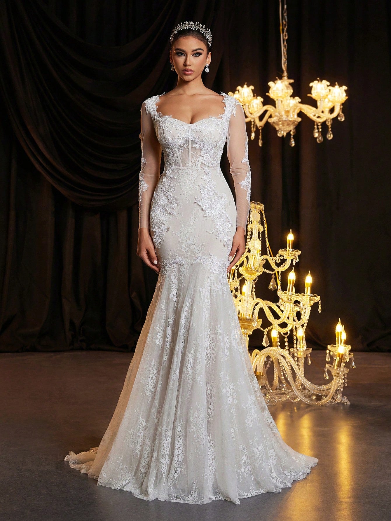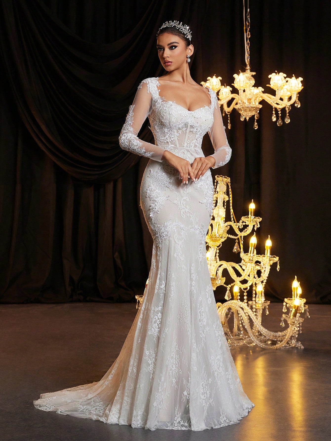 فستان سهرة أنيق وفاخر من Glamrae برقبة على شكل حرف V وظهر مكشوف ومزين بالدانتيل وشفاف من الدانتيل الفرنسي الكلاسيكي وواسع الصدر