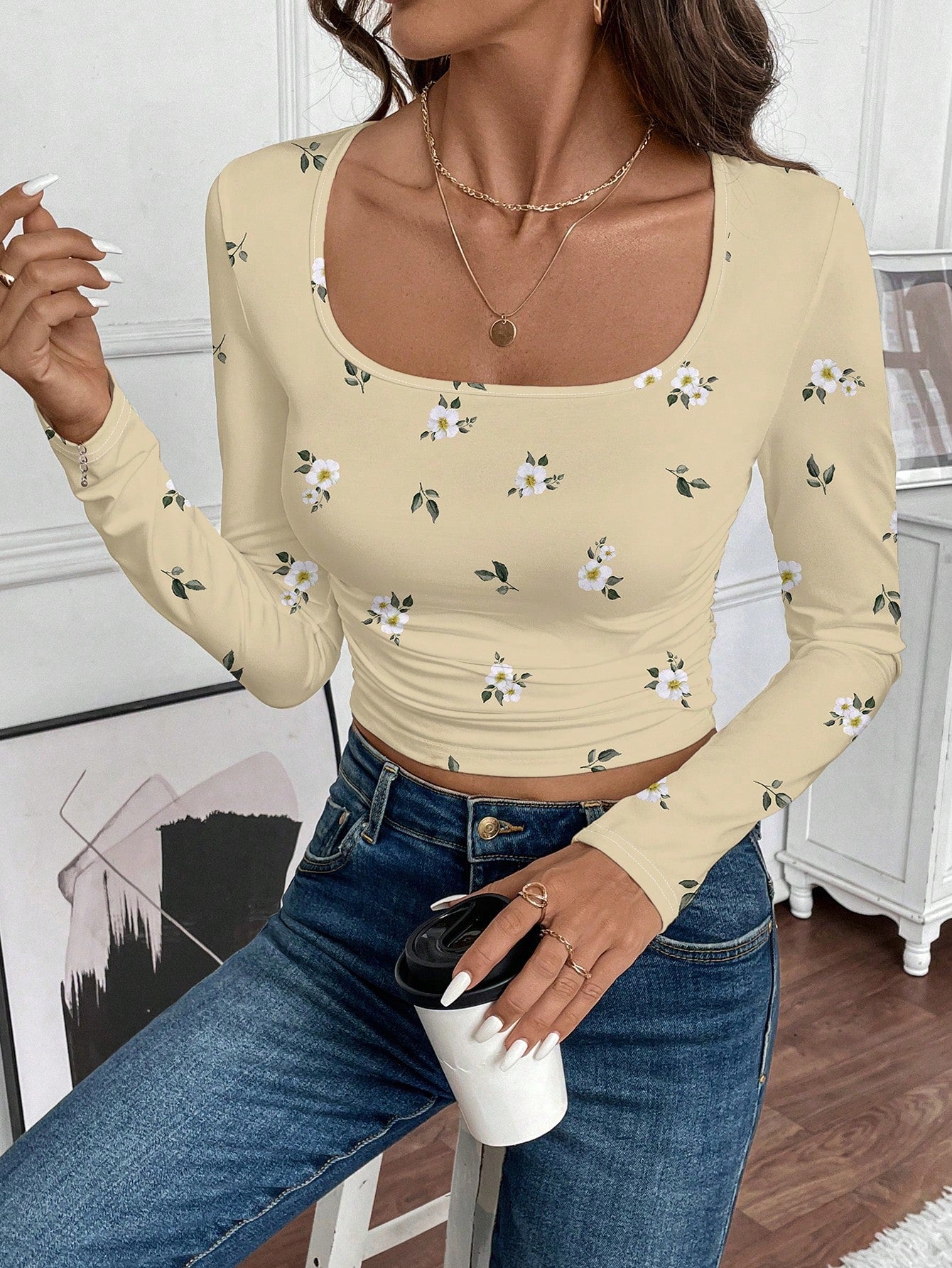 تي شيرت LUNE نسائي كاجوال مطبوع عليه زهور ورقبة مربعة وأكمام طويلة، مناسب كطبقة أساسية في الخريف/الشتاء