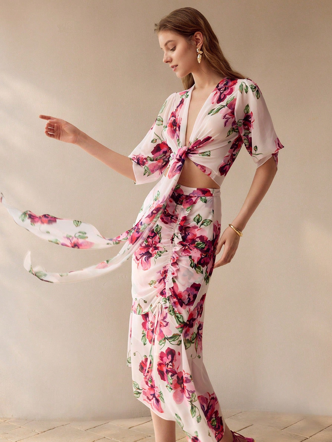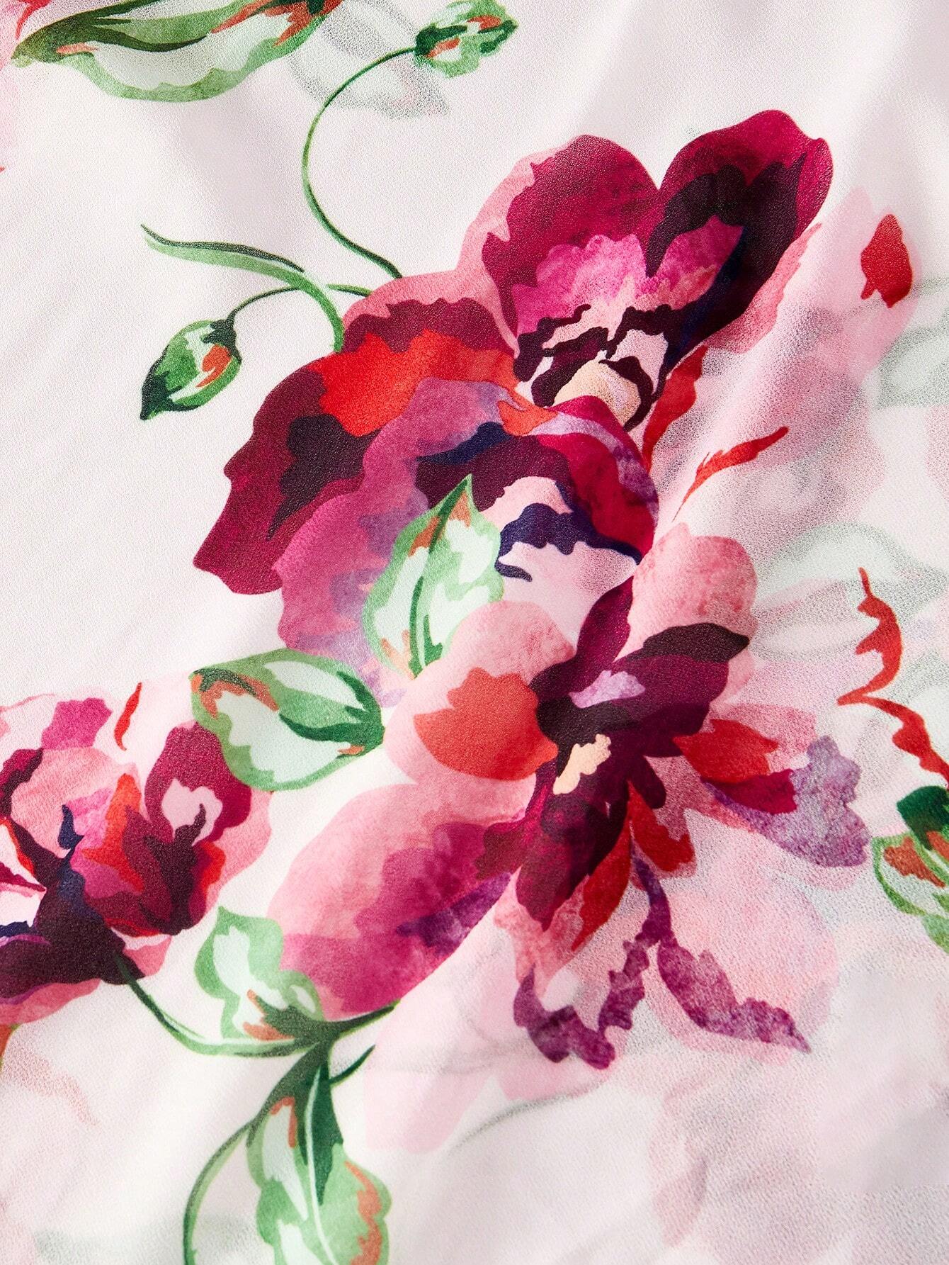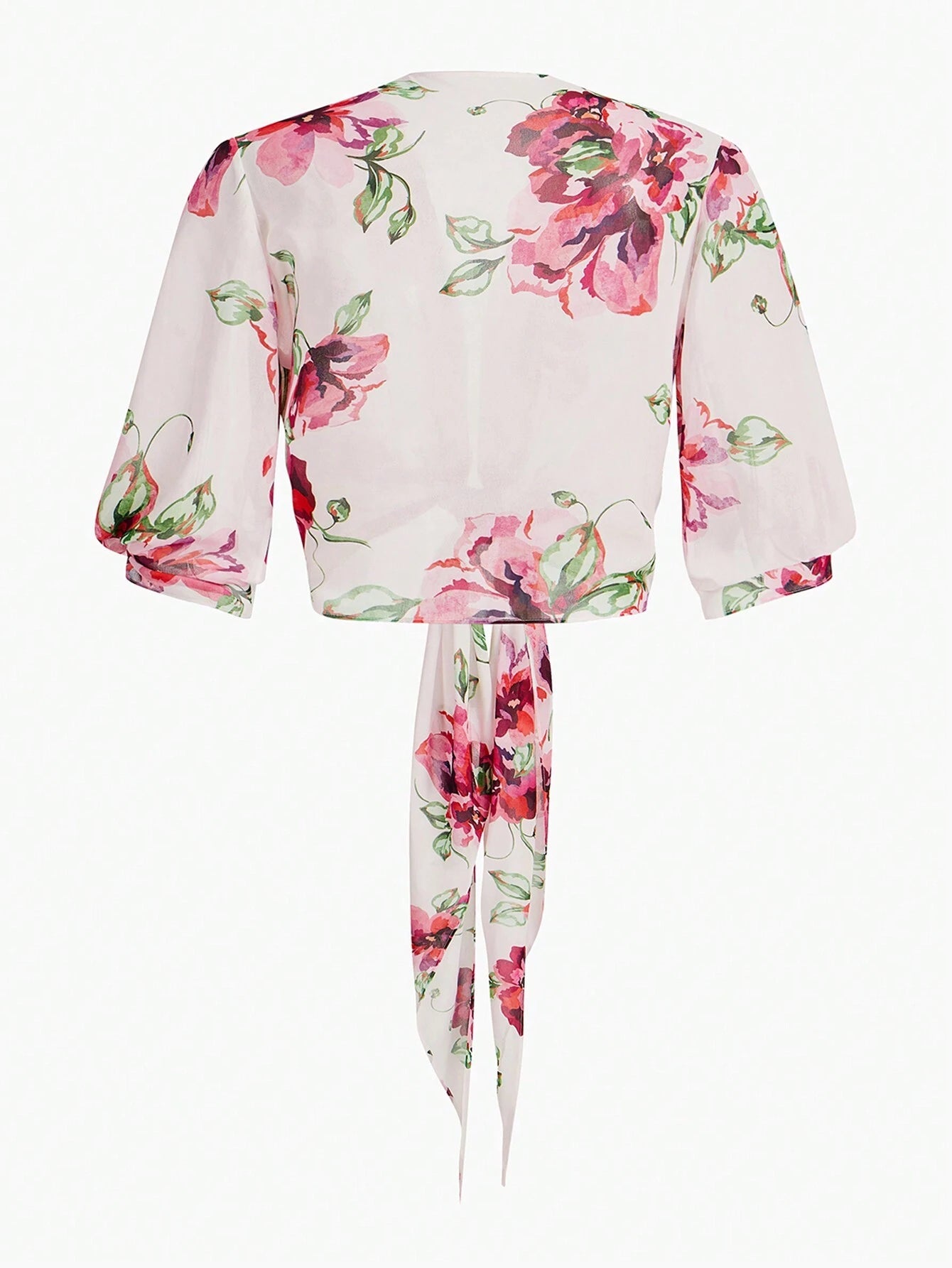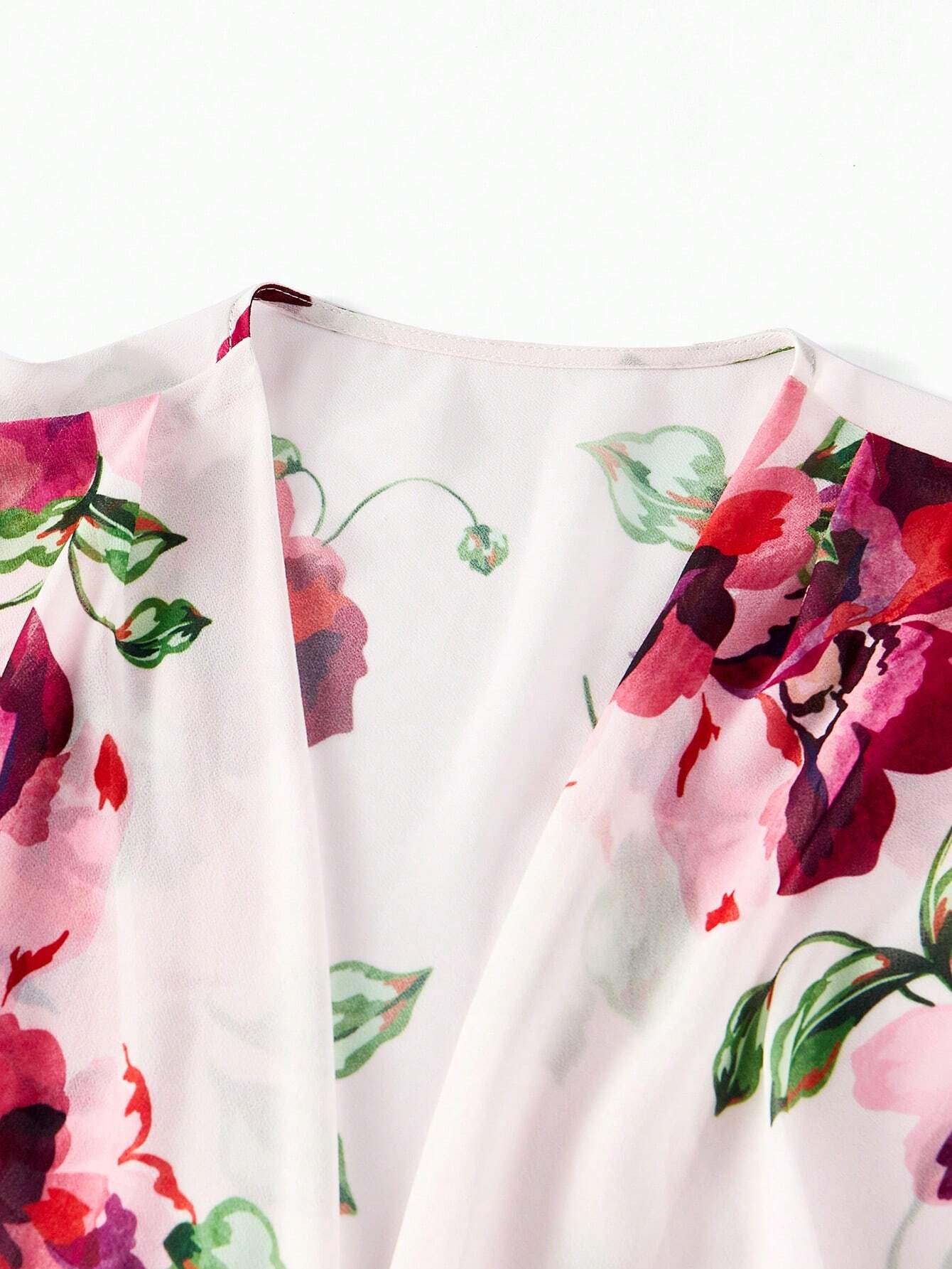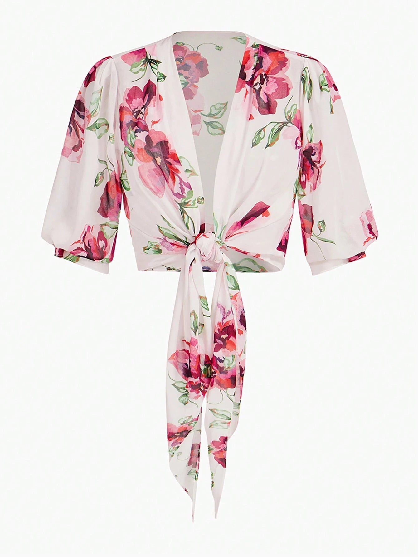 بلوزة قصيرة MOTF بطبعة زهور من الشيفون الفاخر، برقبة منخفضة وأكمام واسعة