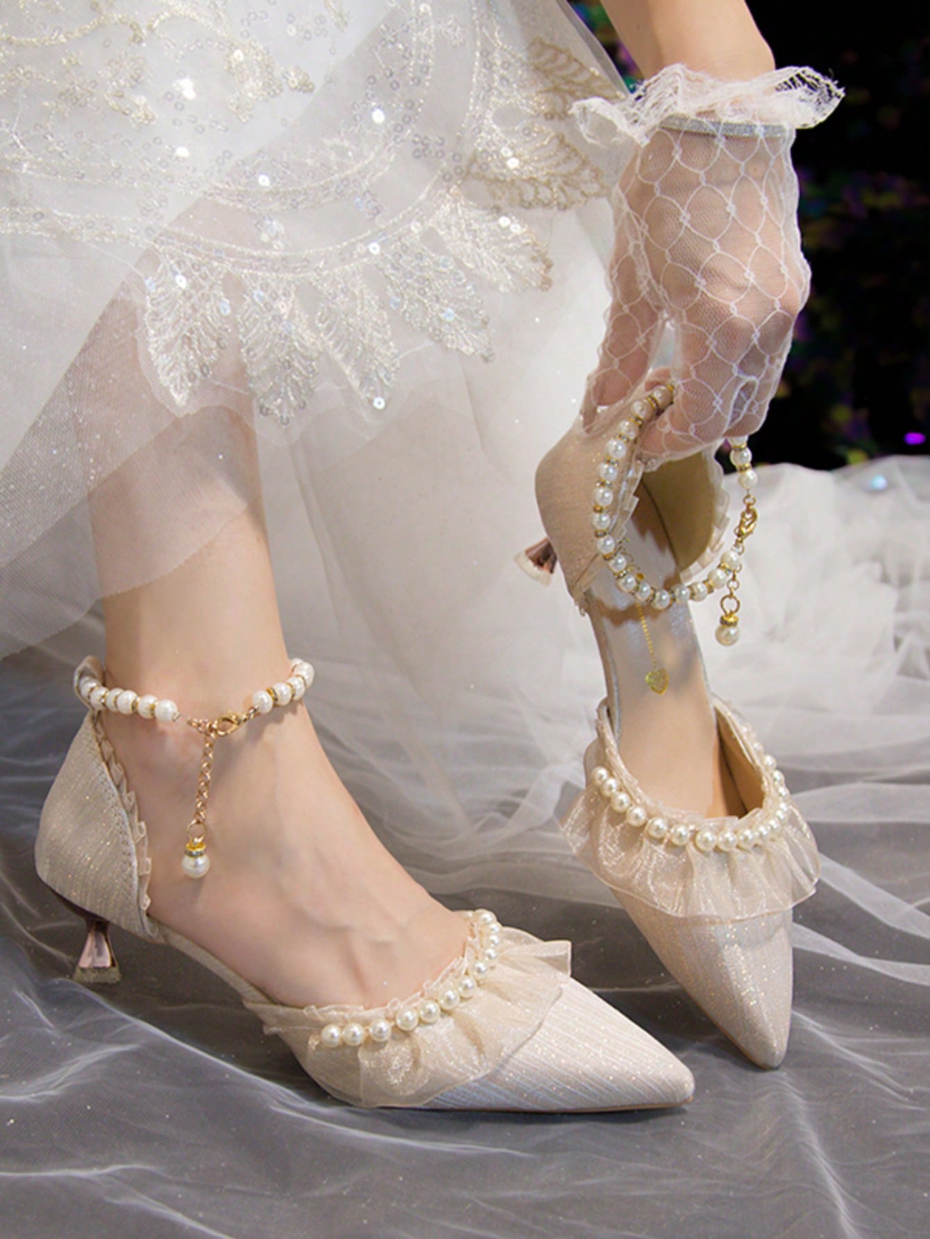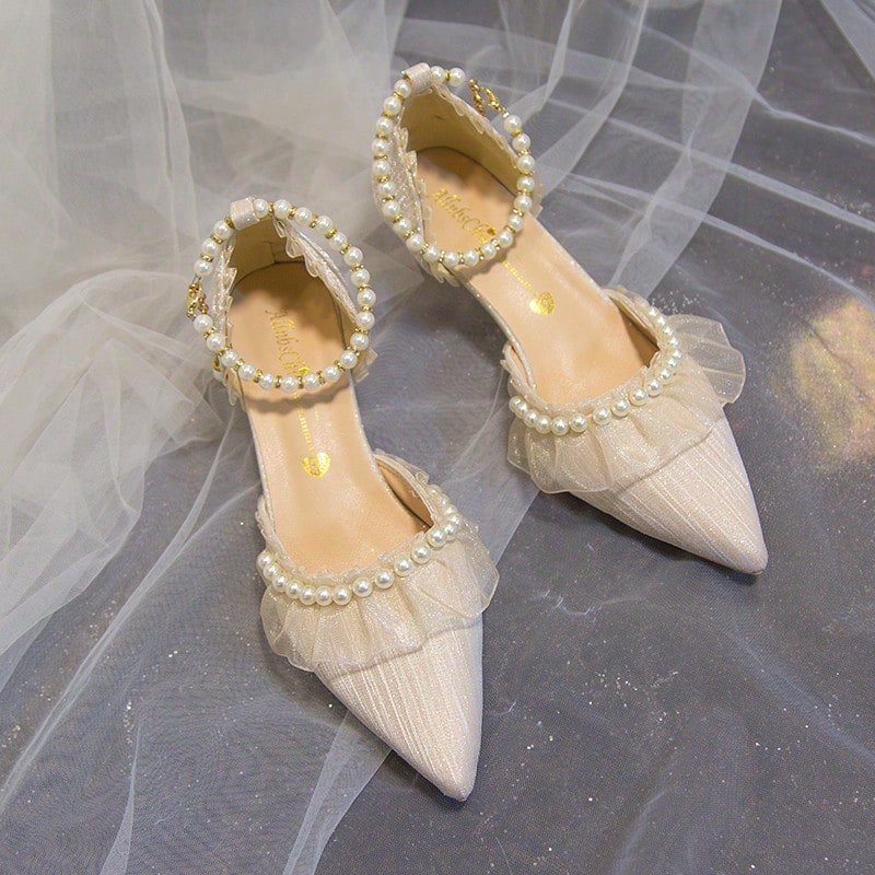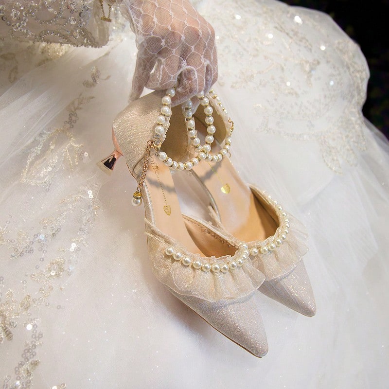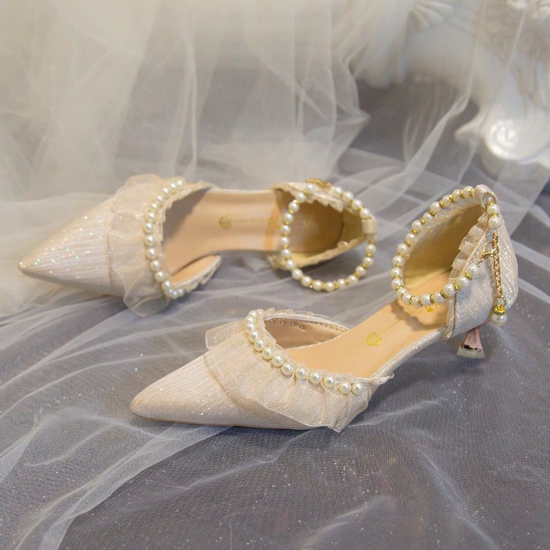 صندل بكعب رفيع ومقدمة مدببة ومزين باللؤلؤ