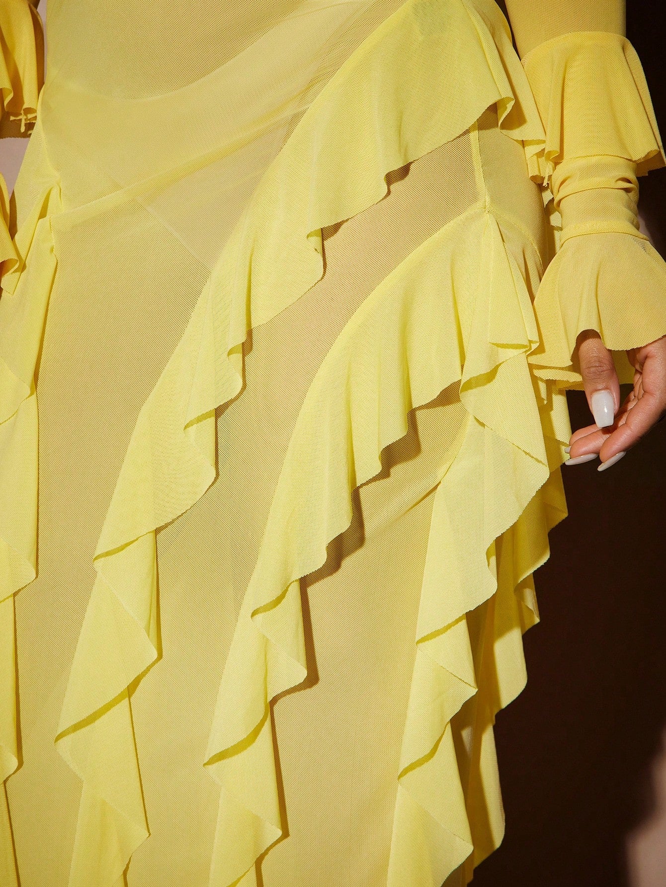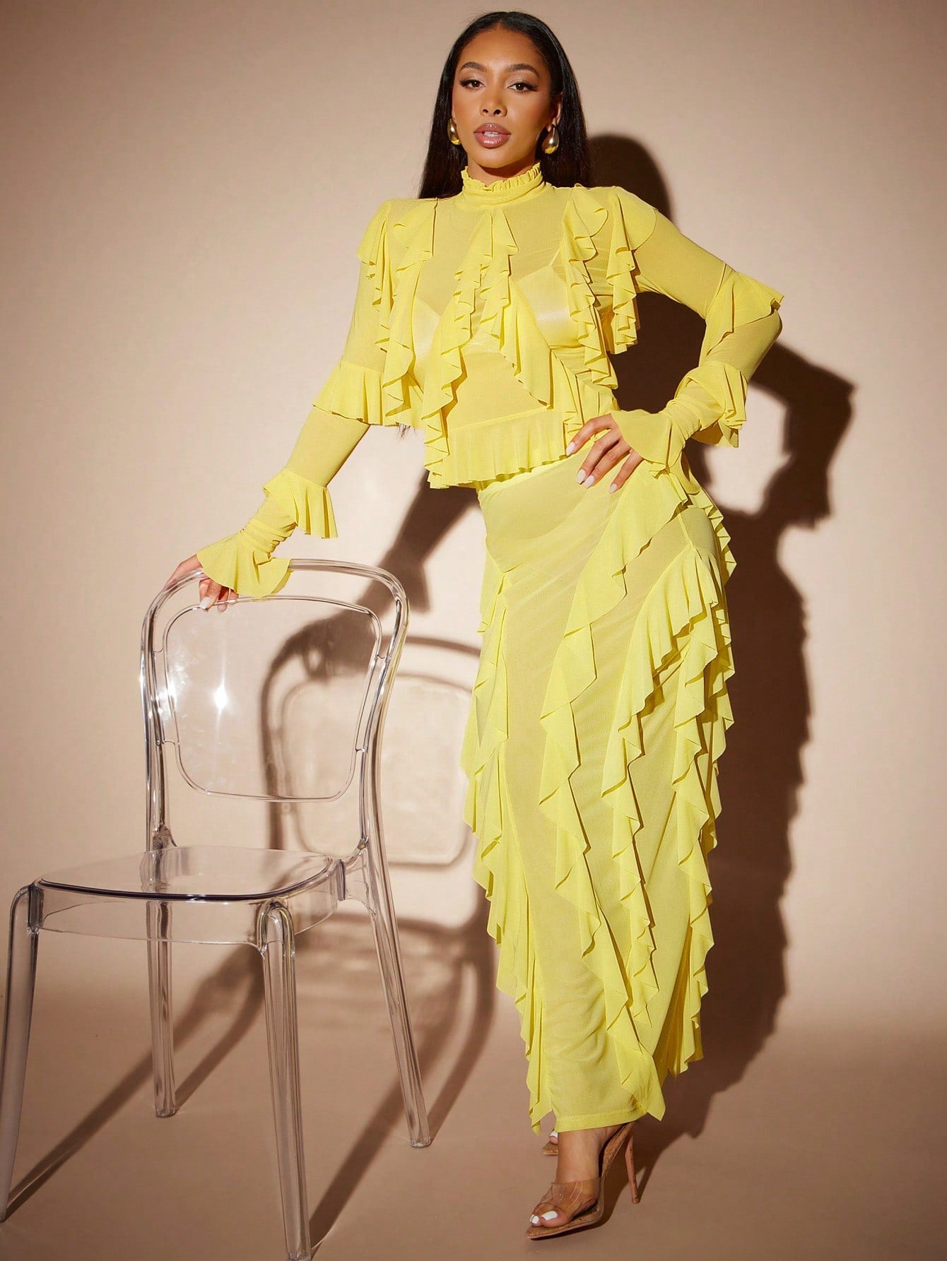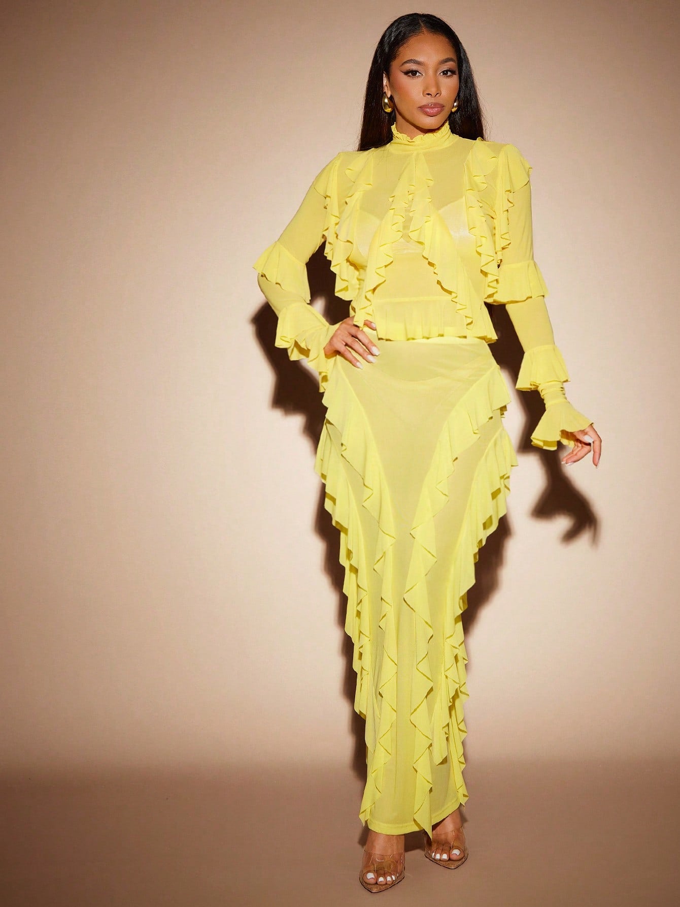 تنورة فيكسي متوسطة الطول بكشكشة شبكية شفافة، بوهو، ملابس صيفية للنساء، ملابس صيفية، فطور وغداء