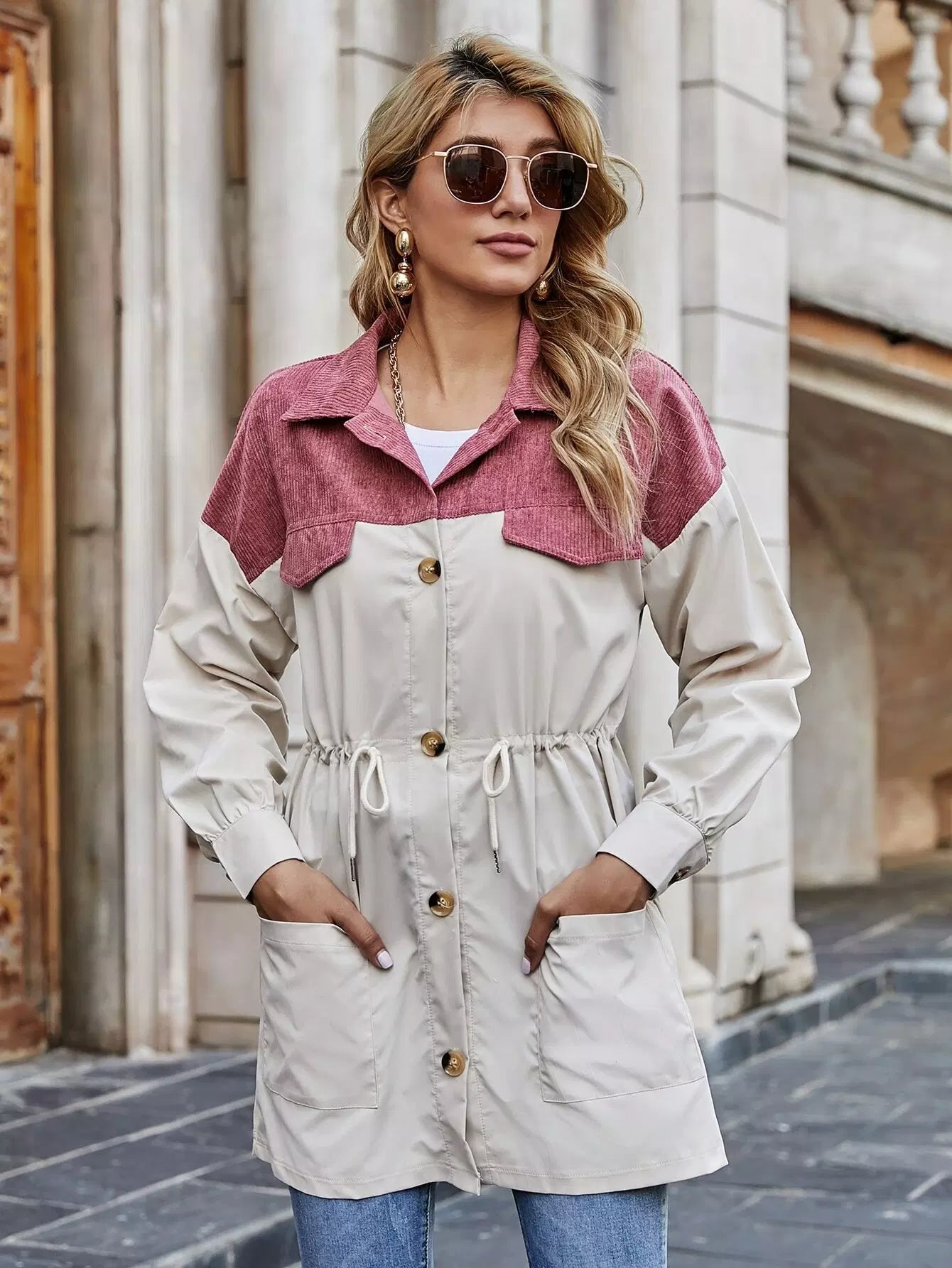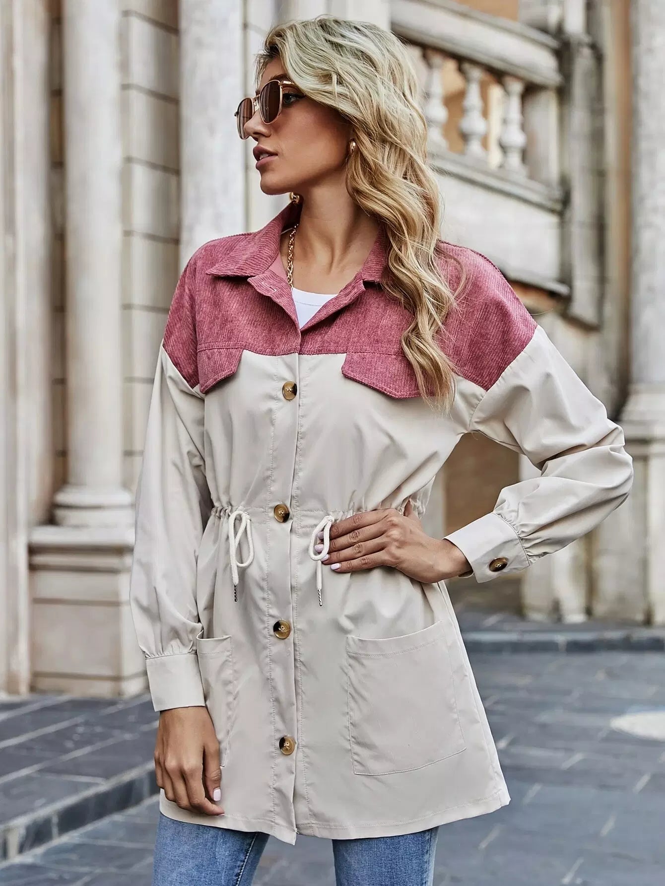 معطف ملون بعقدة ورباط على الكتف