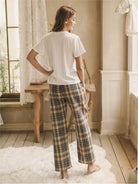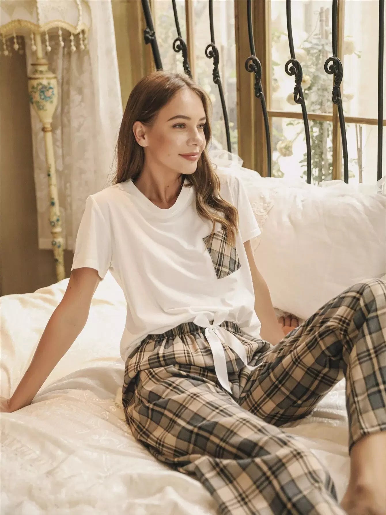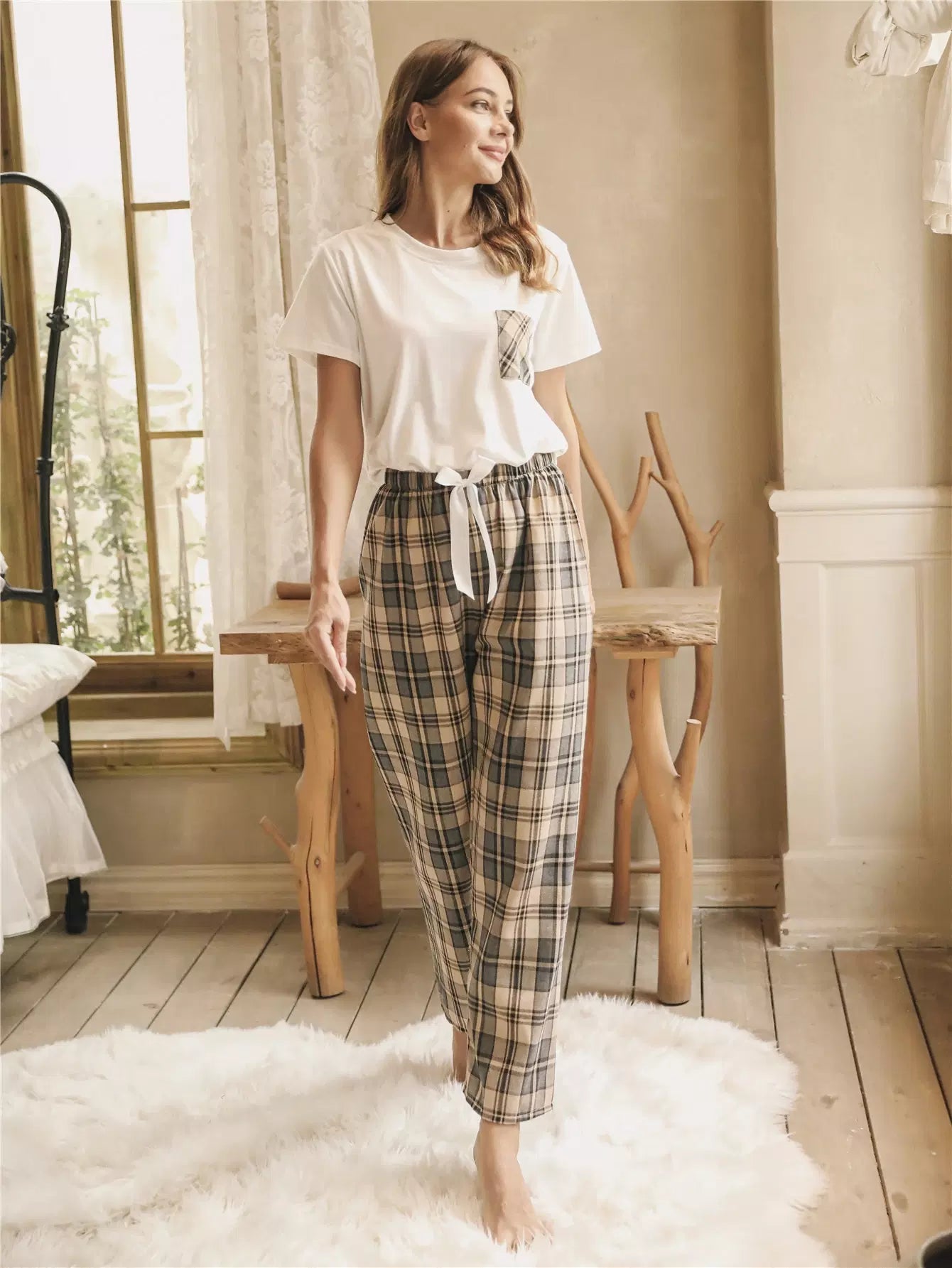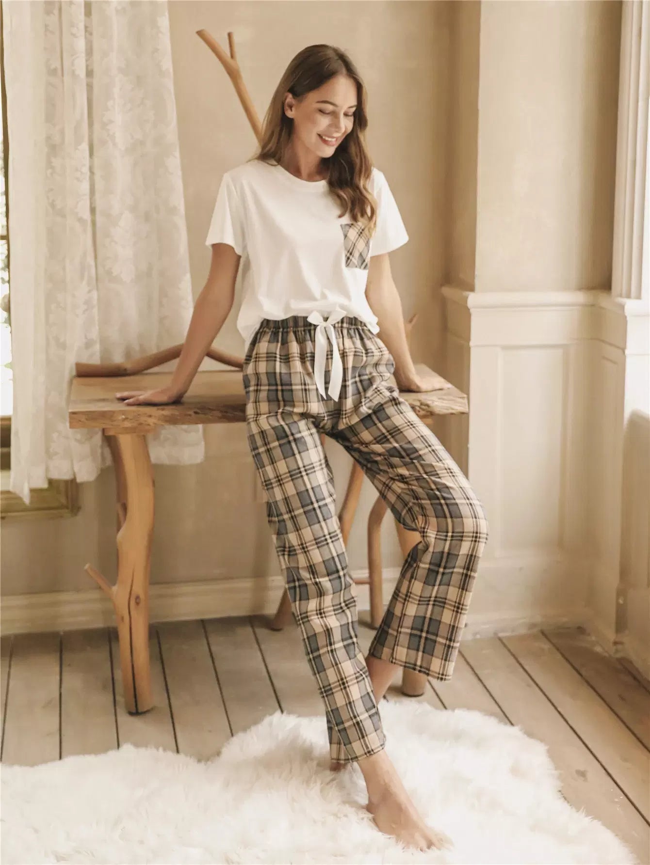 طقم بيجامة برقعة من الترتان وربطة عنق على الخصر ملونة