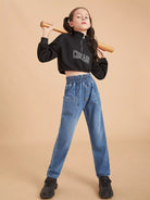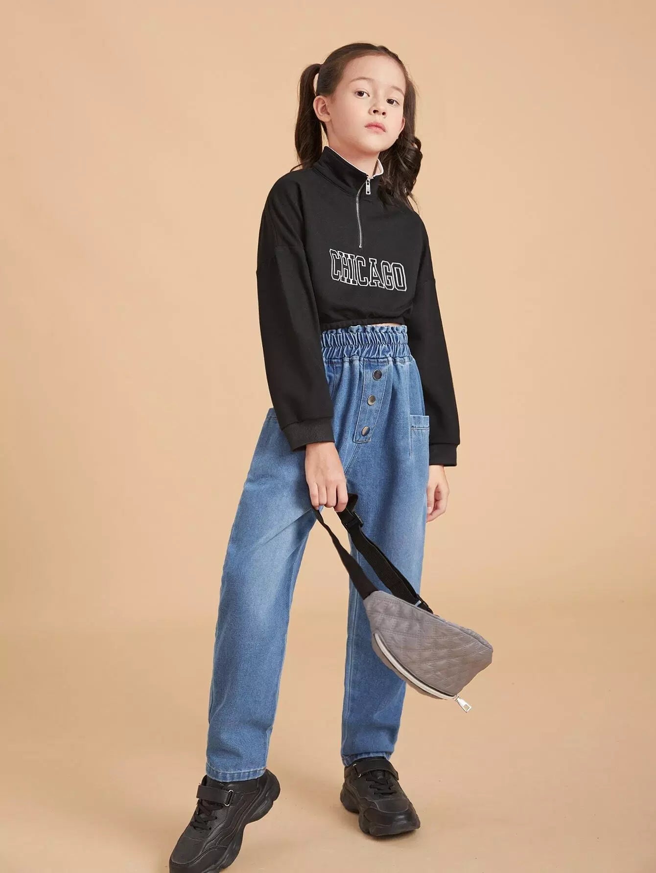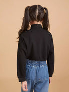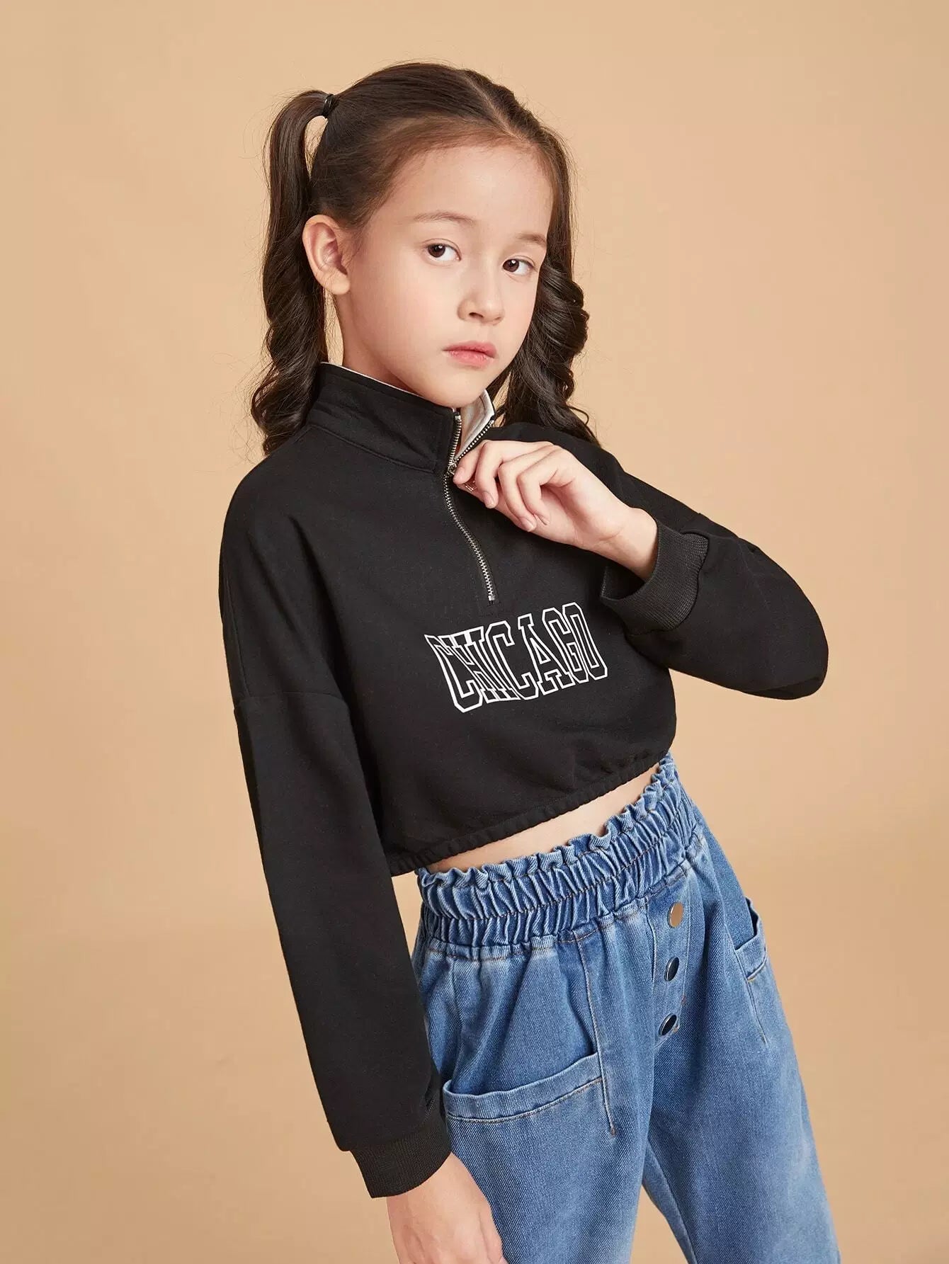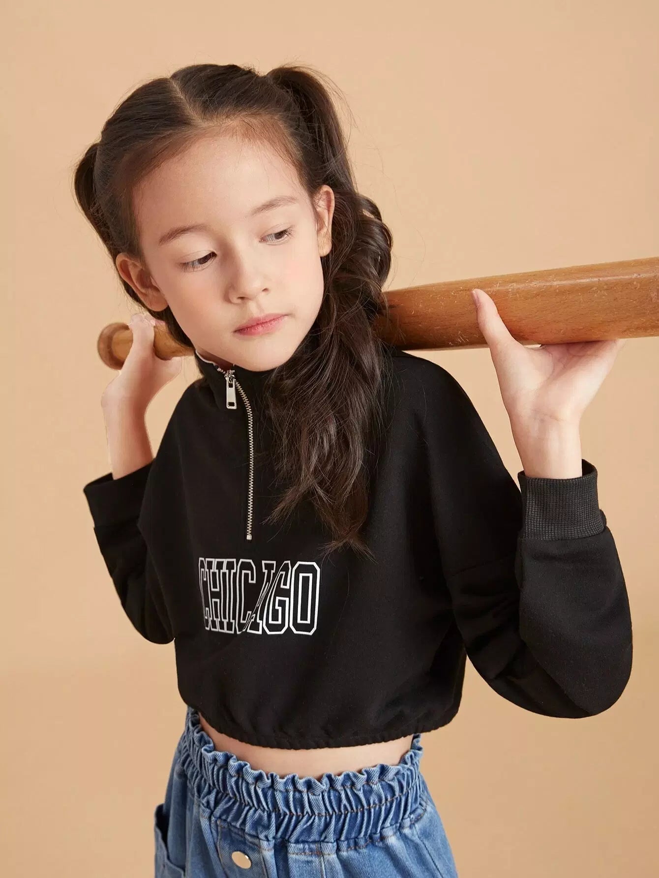 سويت شيرت بناتي بنصف سحاب مزين برسومات منسدلة الكتف بنصف زمام