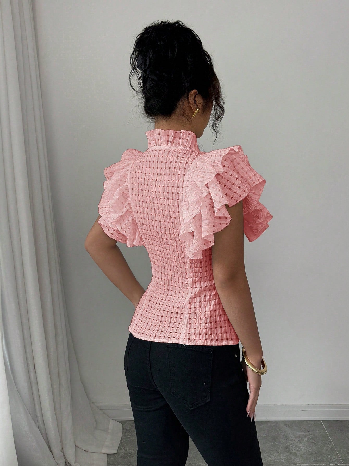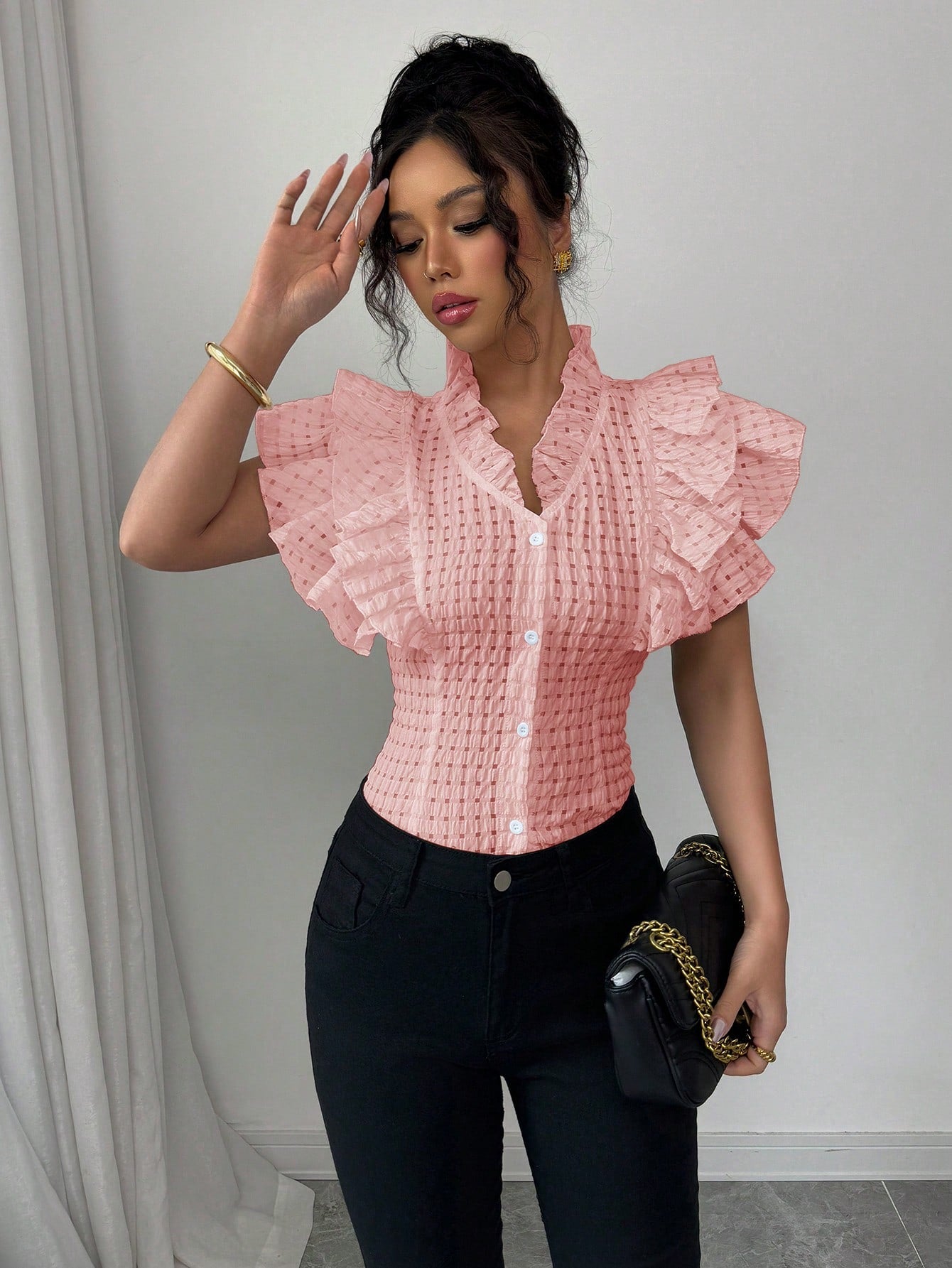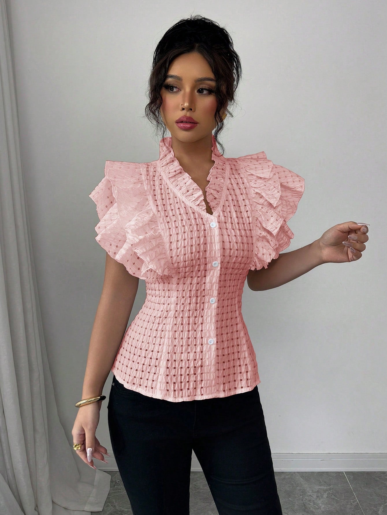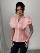 women Elenzga Elegant & Romantic Textural Plaid Ruffle Hem Women's Shirt
