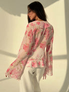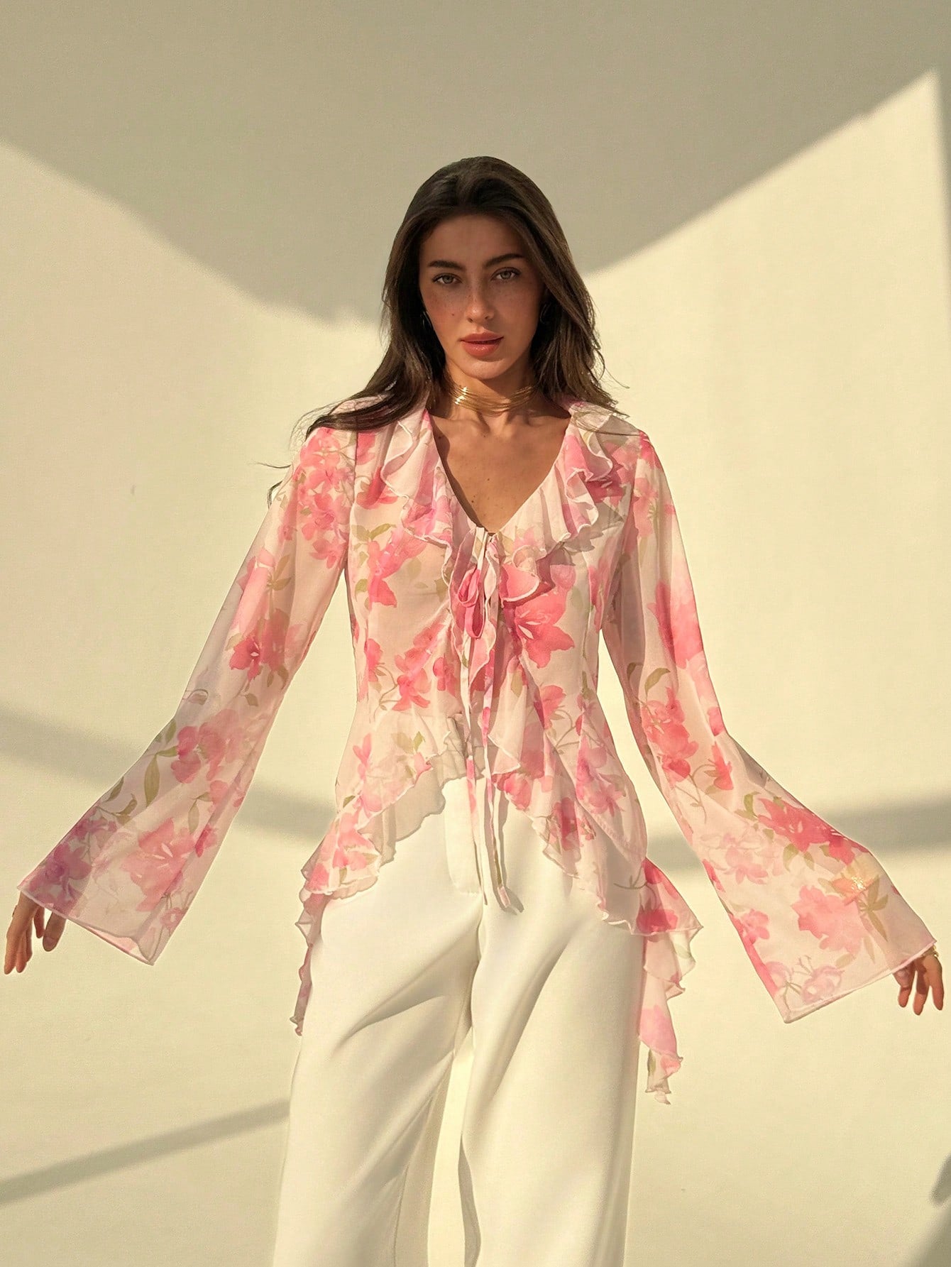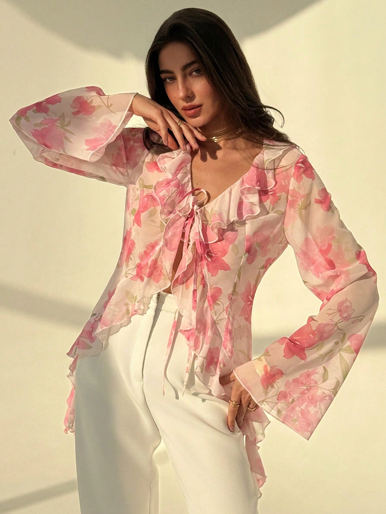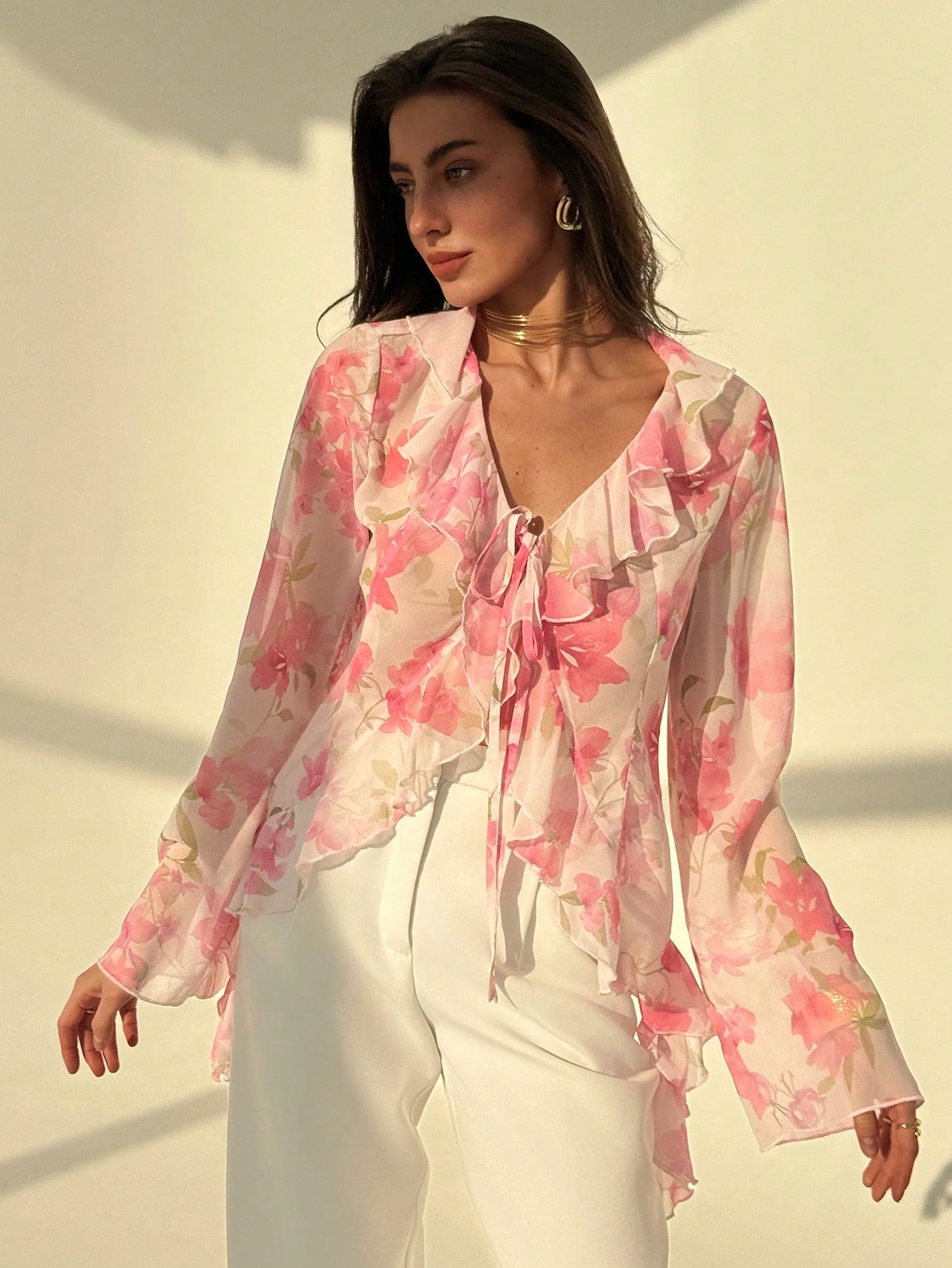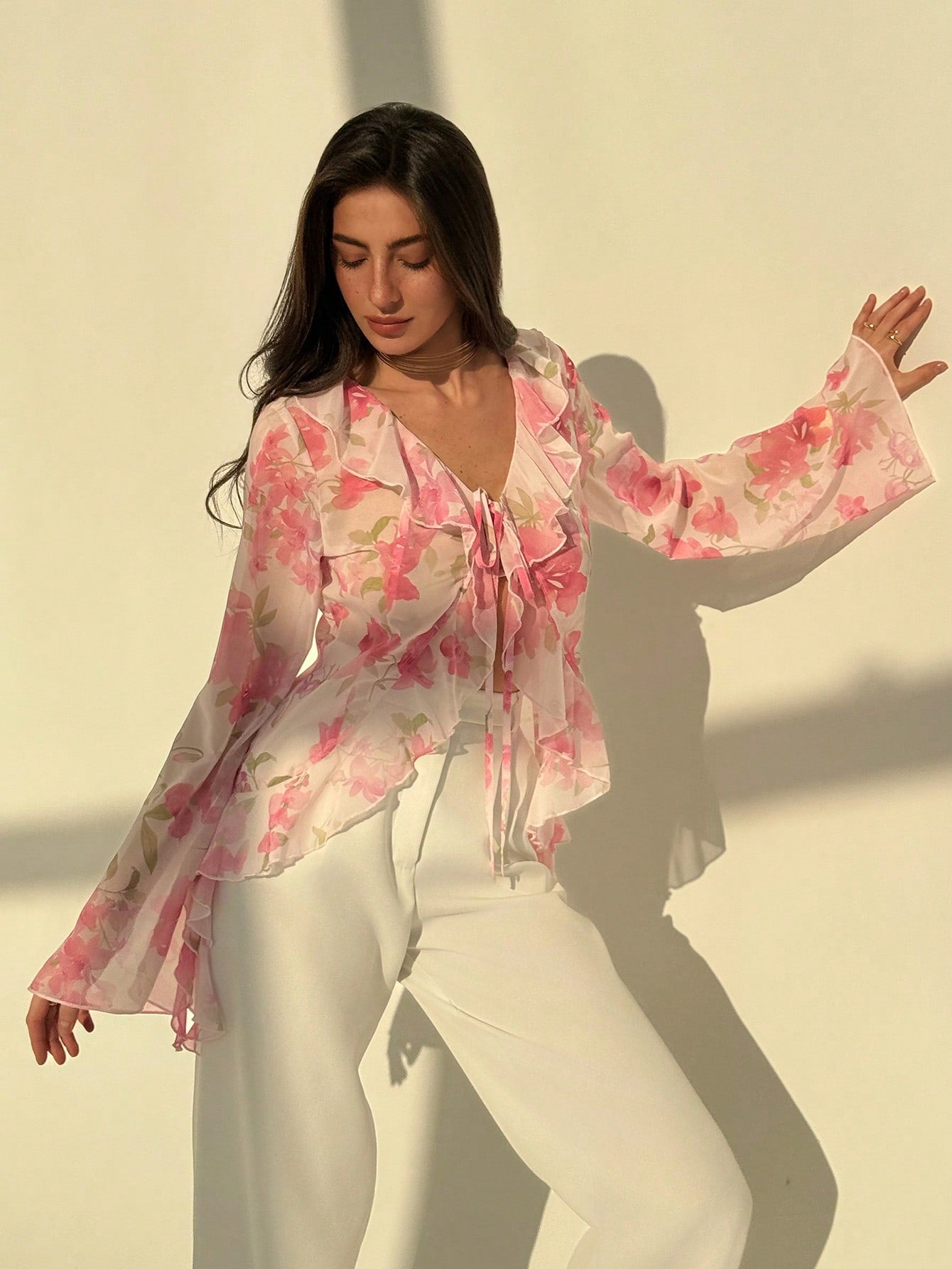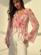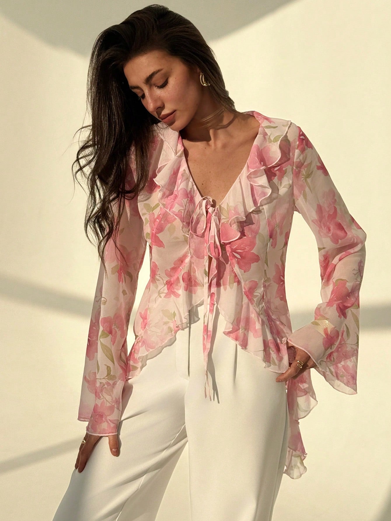 women Aloruh Romantic Floral Print Ruffle Trim Flared Sleeve Women Shirt For Holiday
