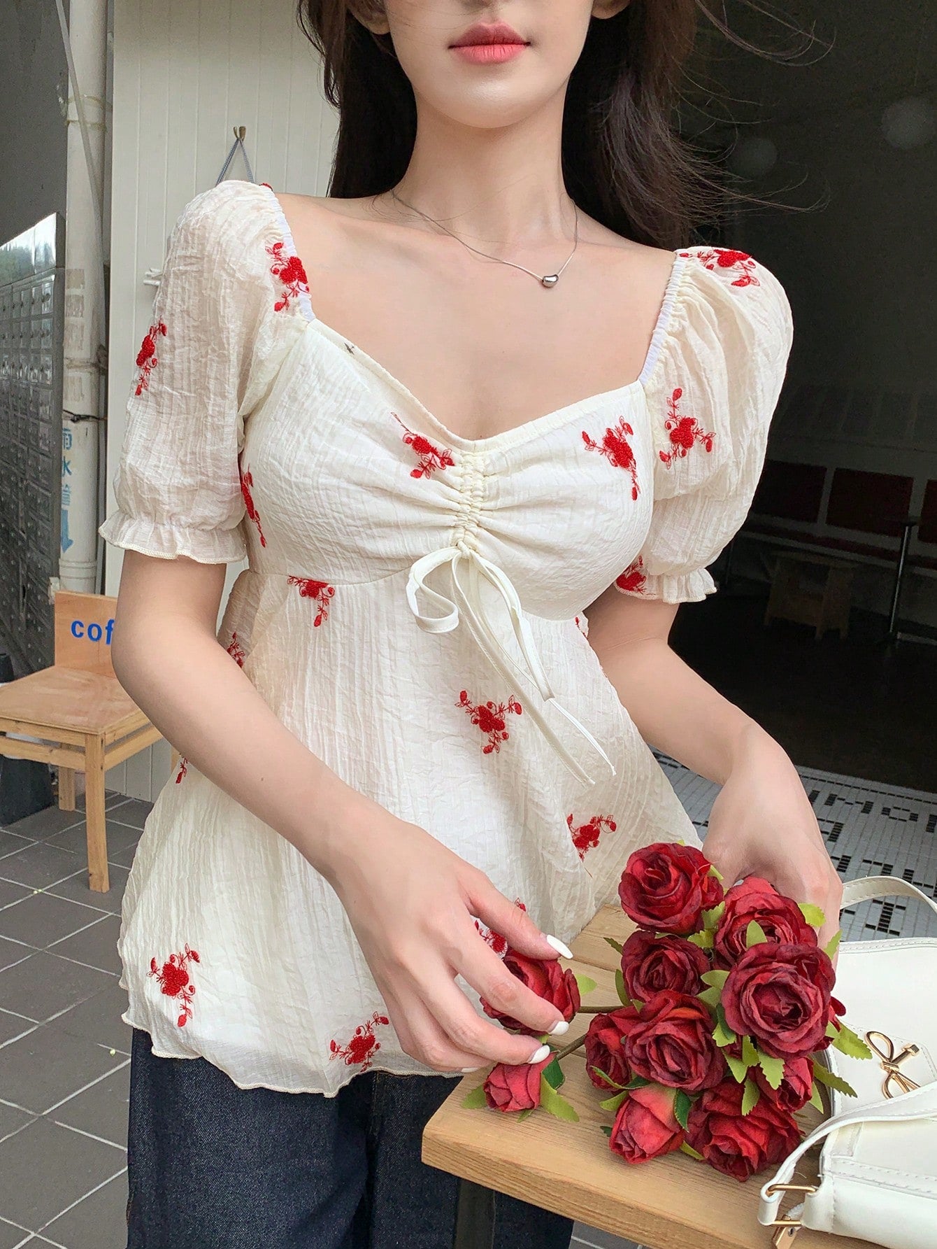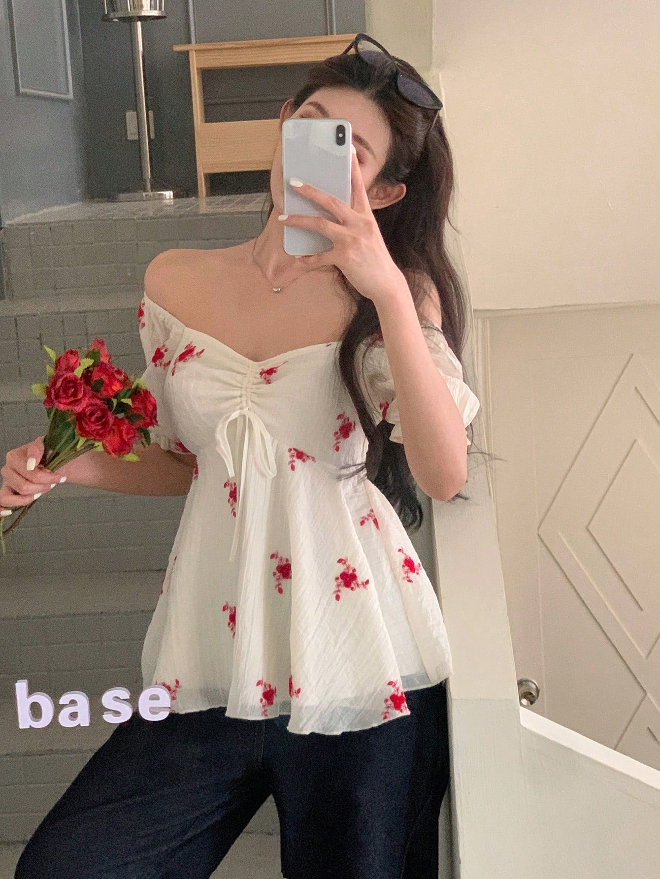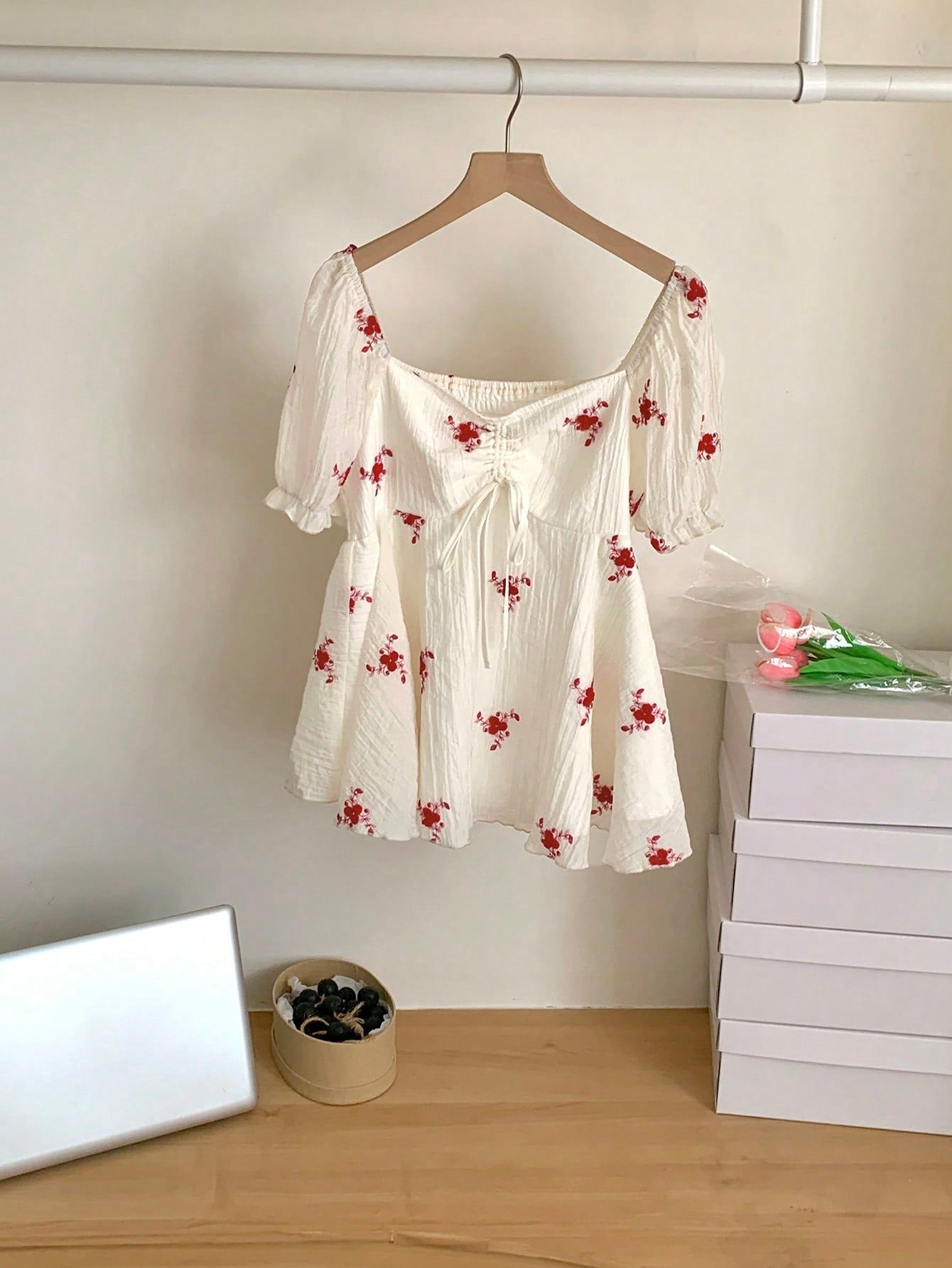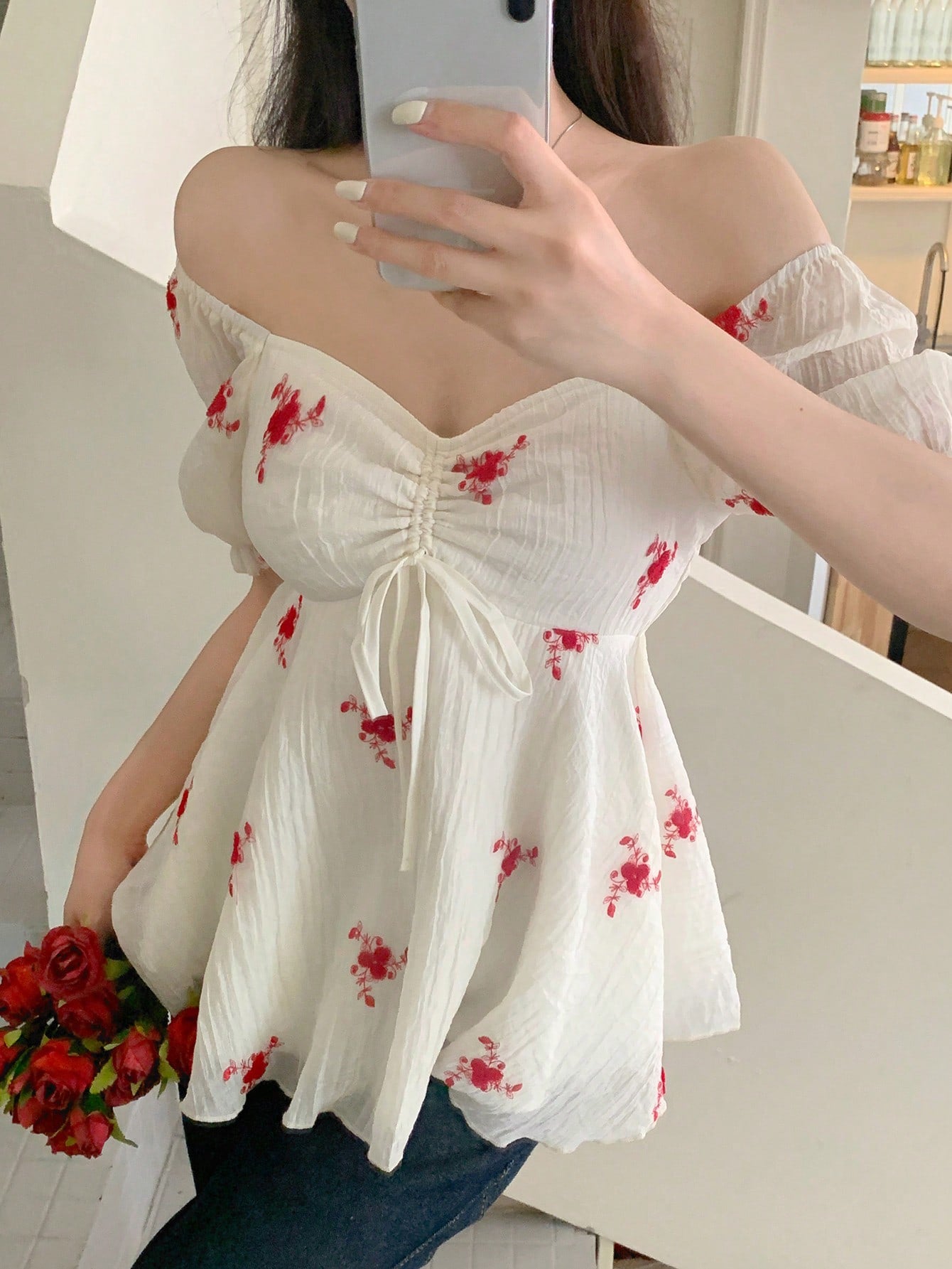 بلوزة نسائية من DAZY بكتف واحد مطبوعة بالورود مع رباط، بلوزة بيبي دول