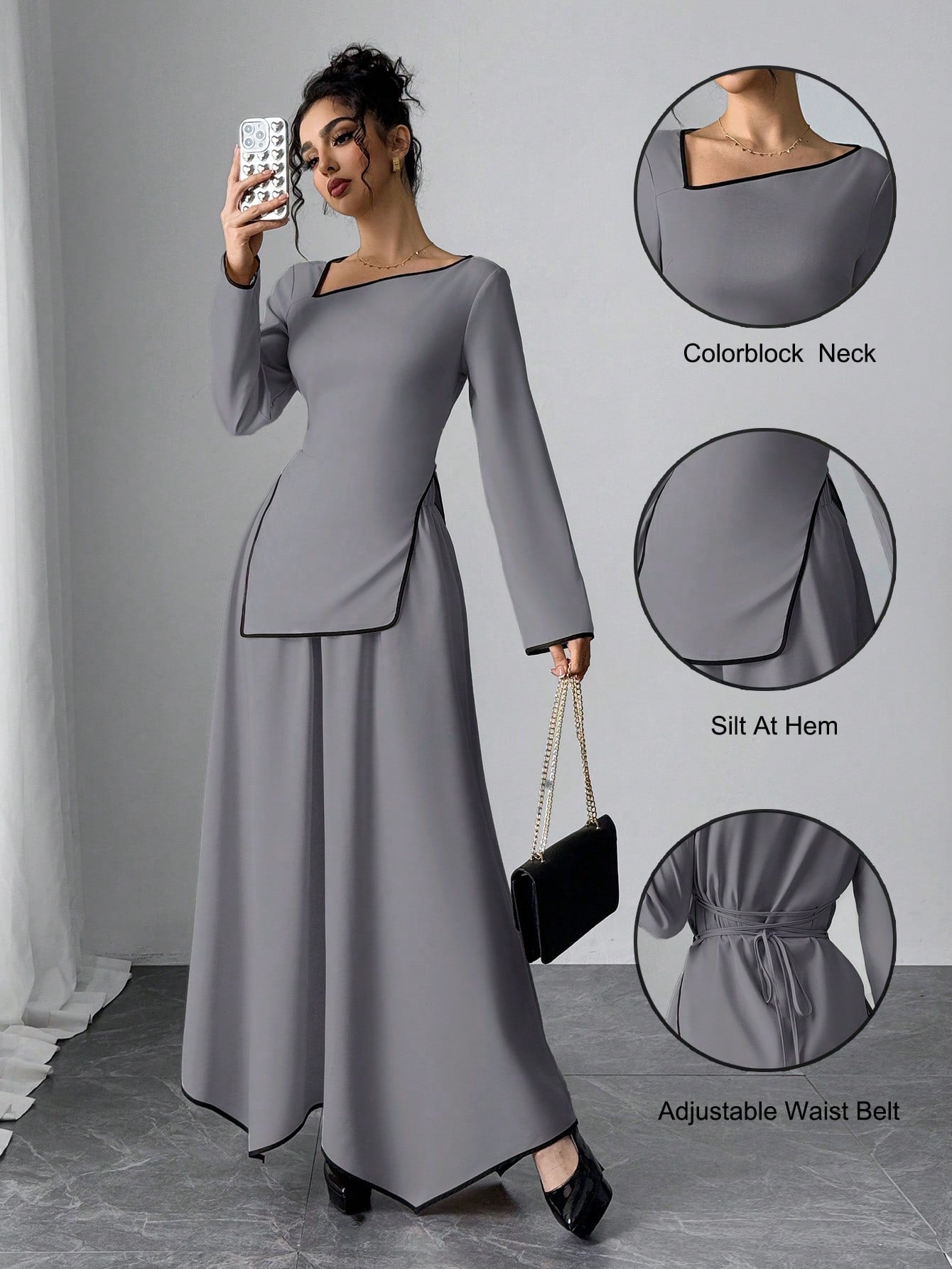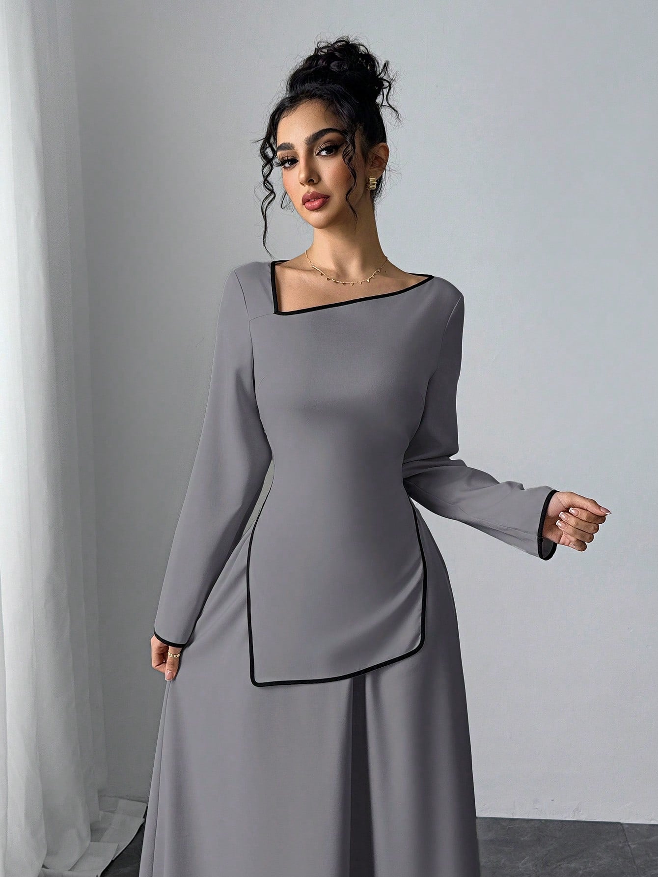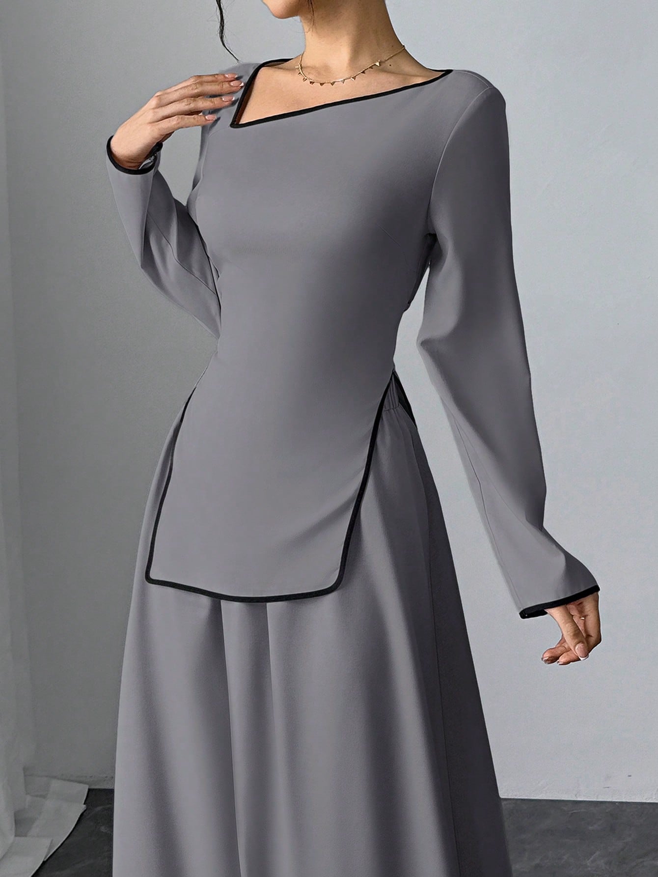 women Modelyn Modest Casual Contrast Trim Asymmetric Neck Top And Mini Skirt Set For Women 2 Pieces Set