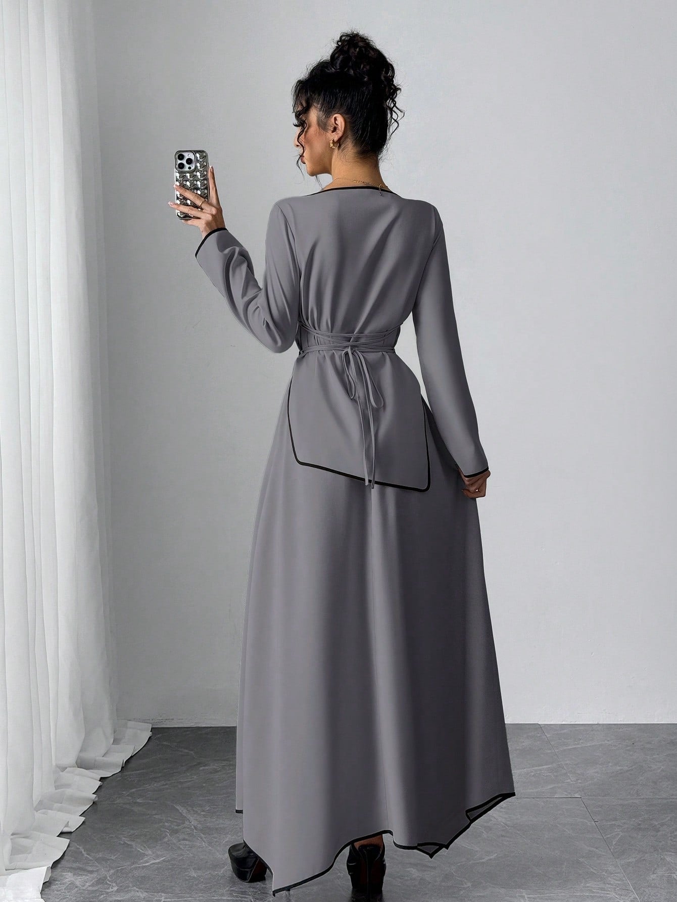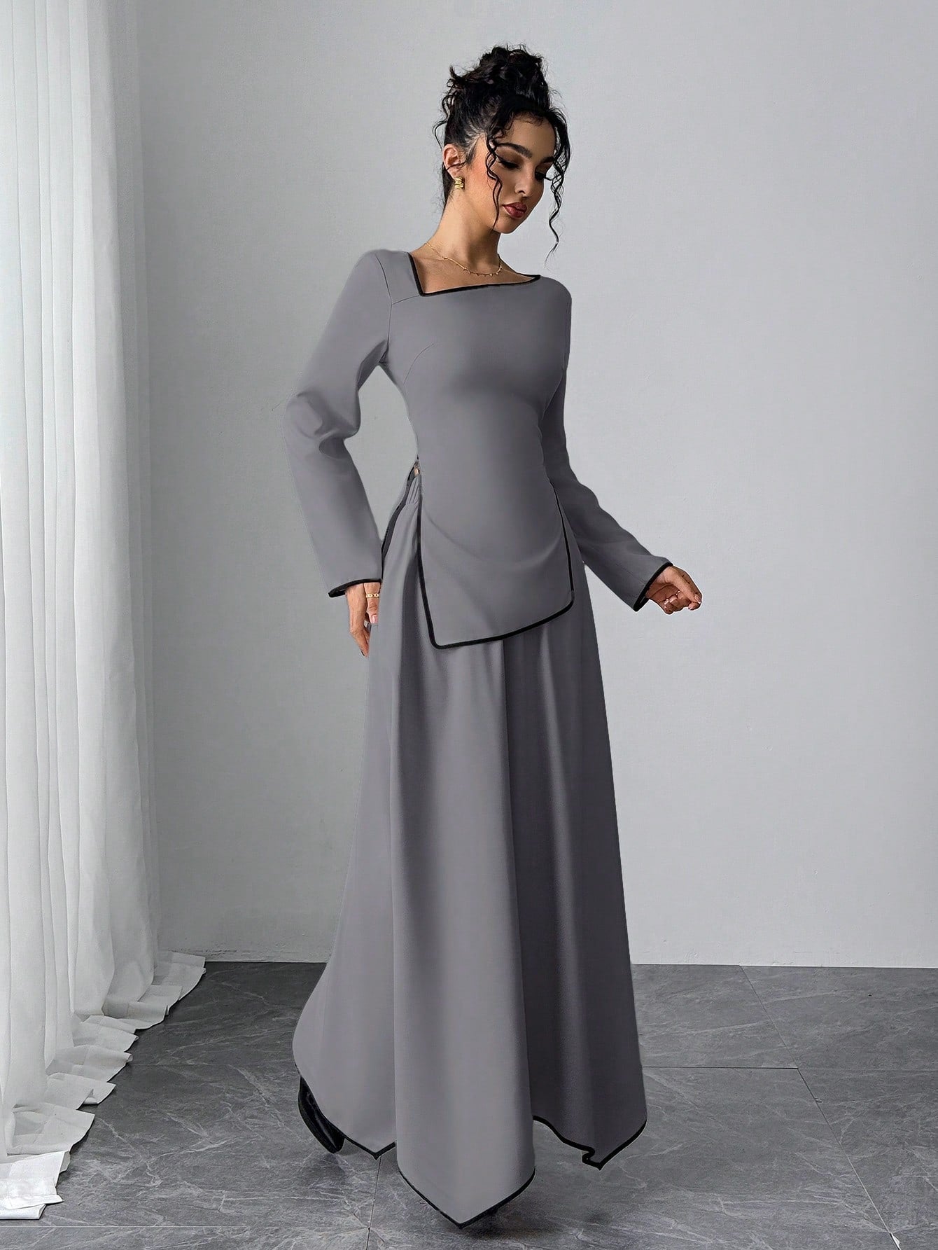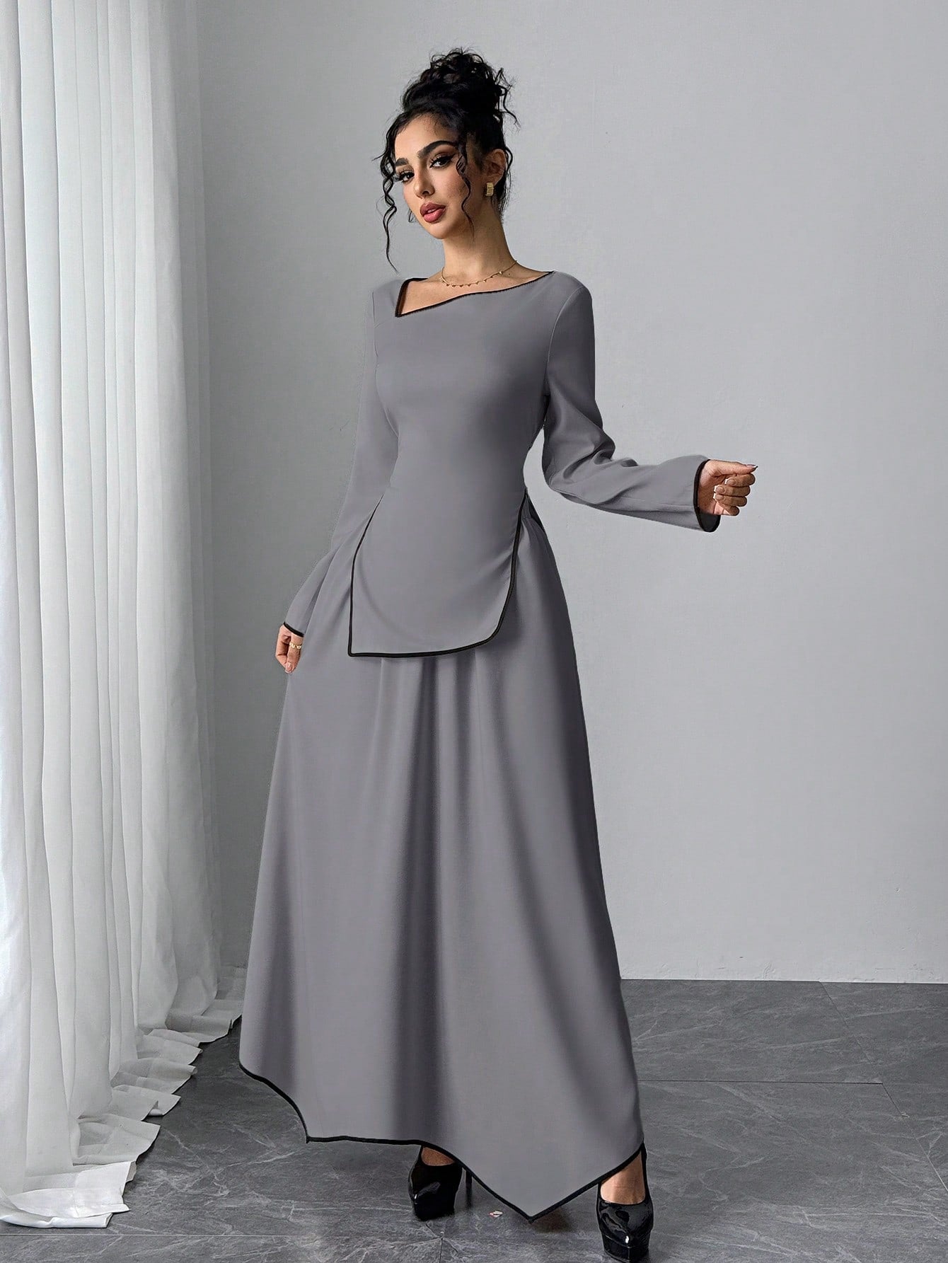 women Modelyn Modest Casual Contrast Trim Asymmetric Neck Top And Mini Skirt Set For Women 2 Pieces Set