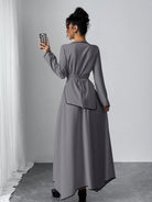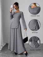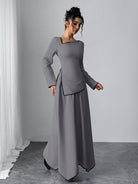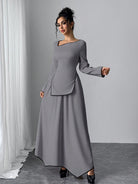 طقم موديلين نسائي مكون من قطعتين، بلوزة وتنورة قصيرة بياقة غير متماثلة وحواف متباينة
