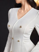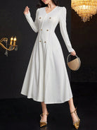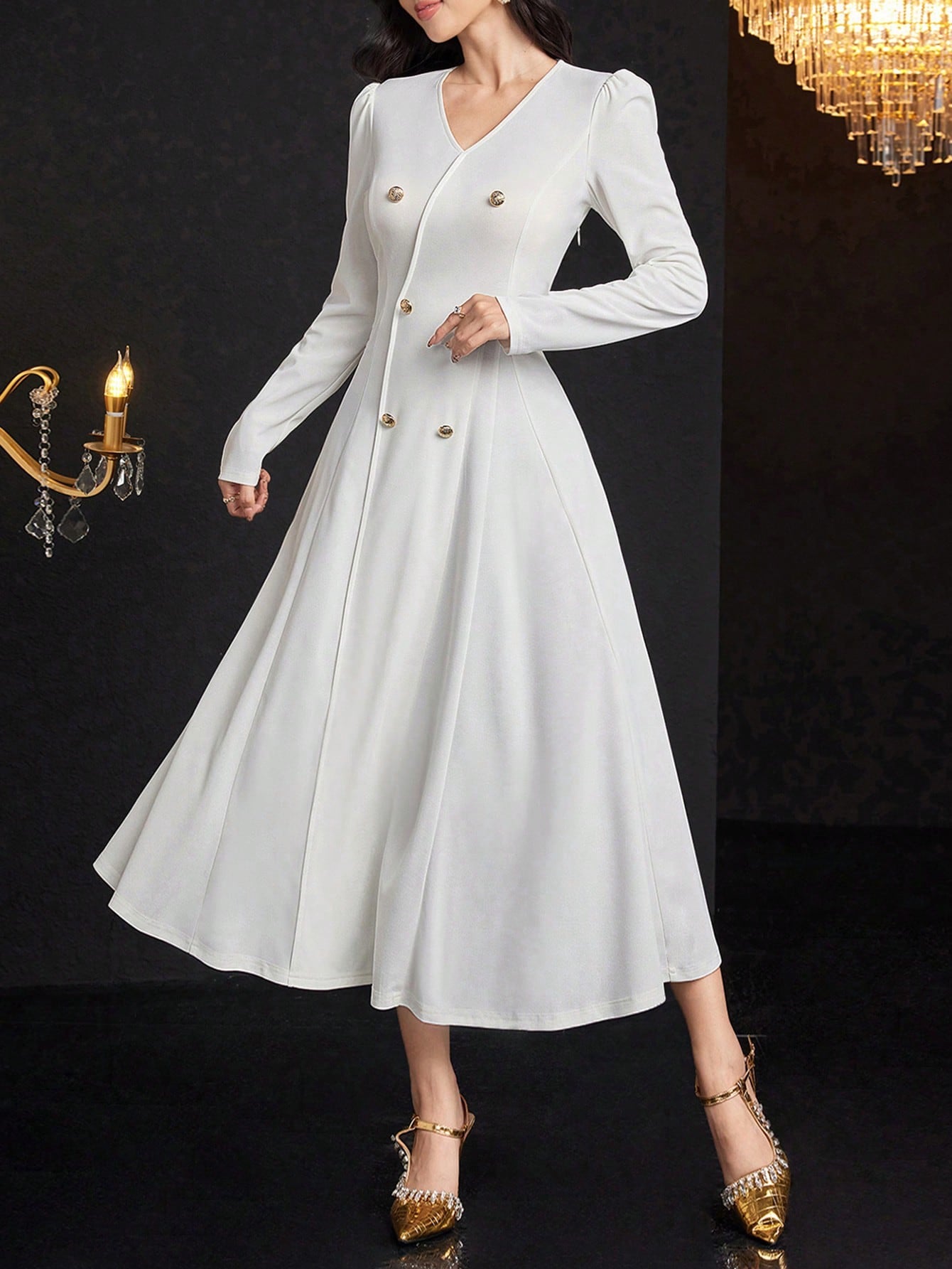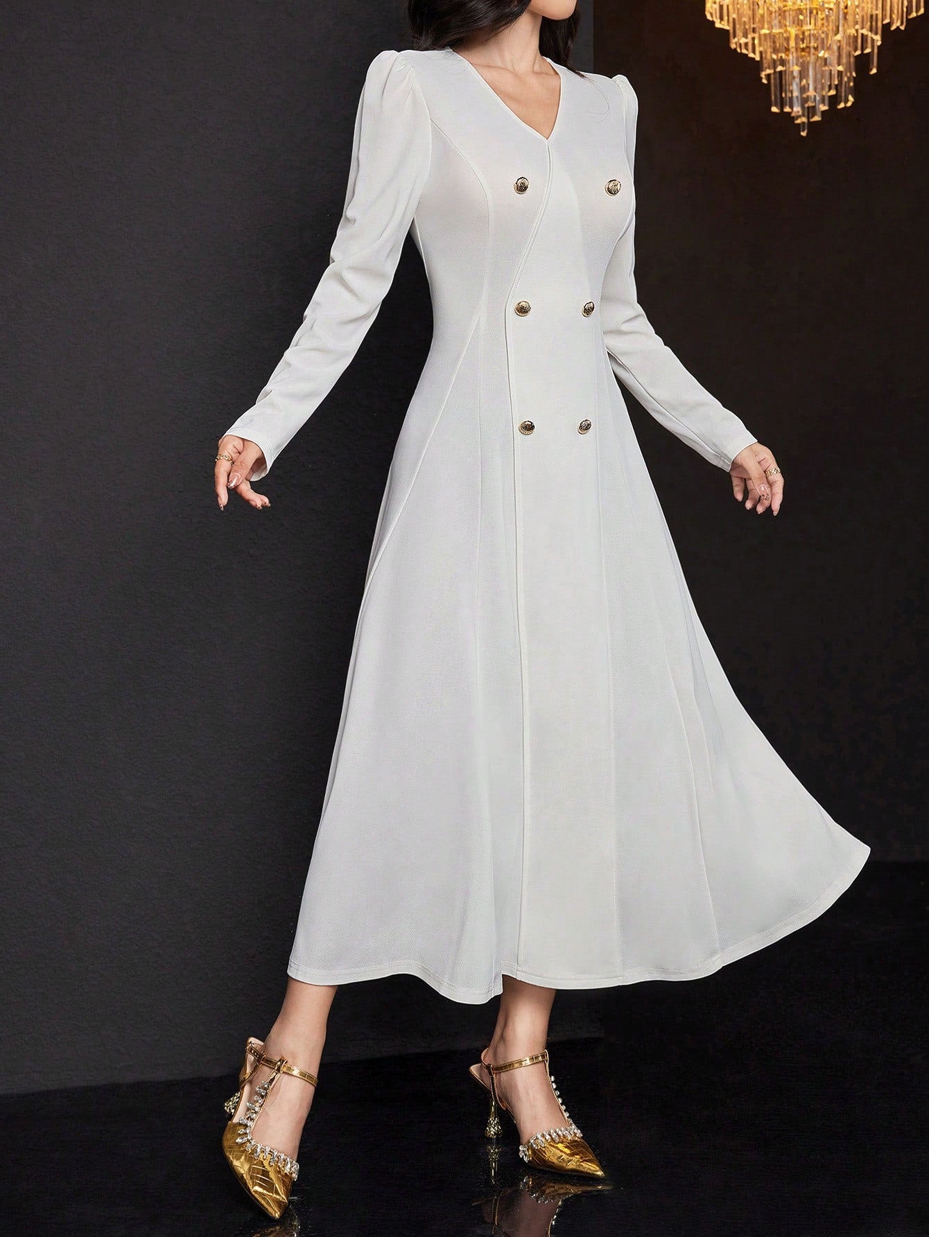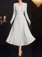 Modelyn Women V-Neck Ruched Waist A-Line Hem Button Decor Long Sleeve Mid-Length Dress Long Evening Dresses