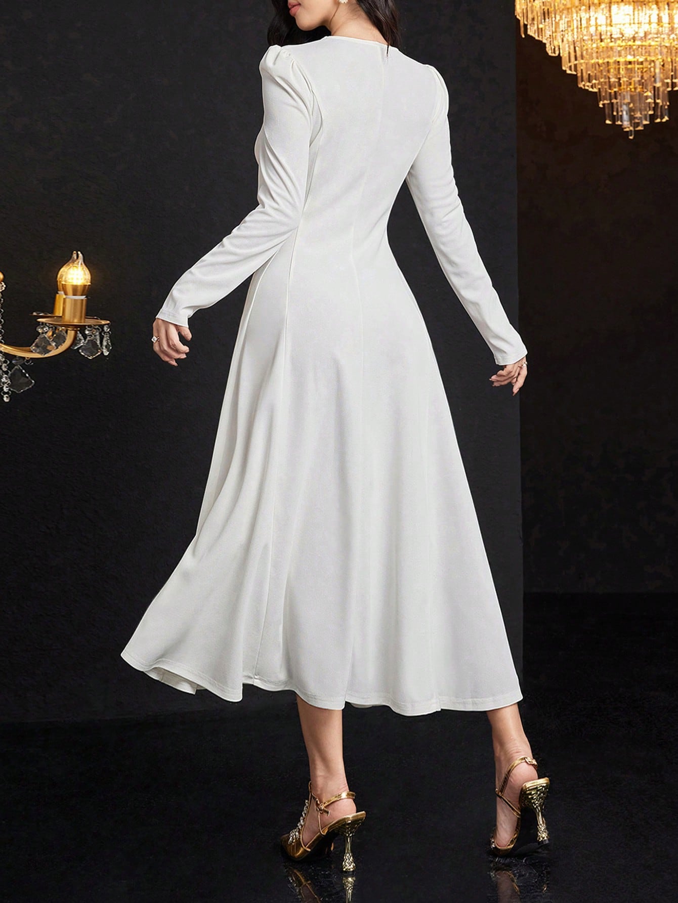 فستان موديلين نسائي برقبة على شكل حرف V وخصر مكشكش وحاشية على شكل حرف A وأكمام طويلة وطول متوسط وفساتين سهرة طويلة