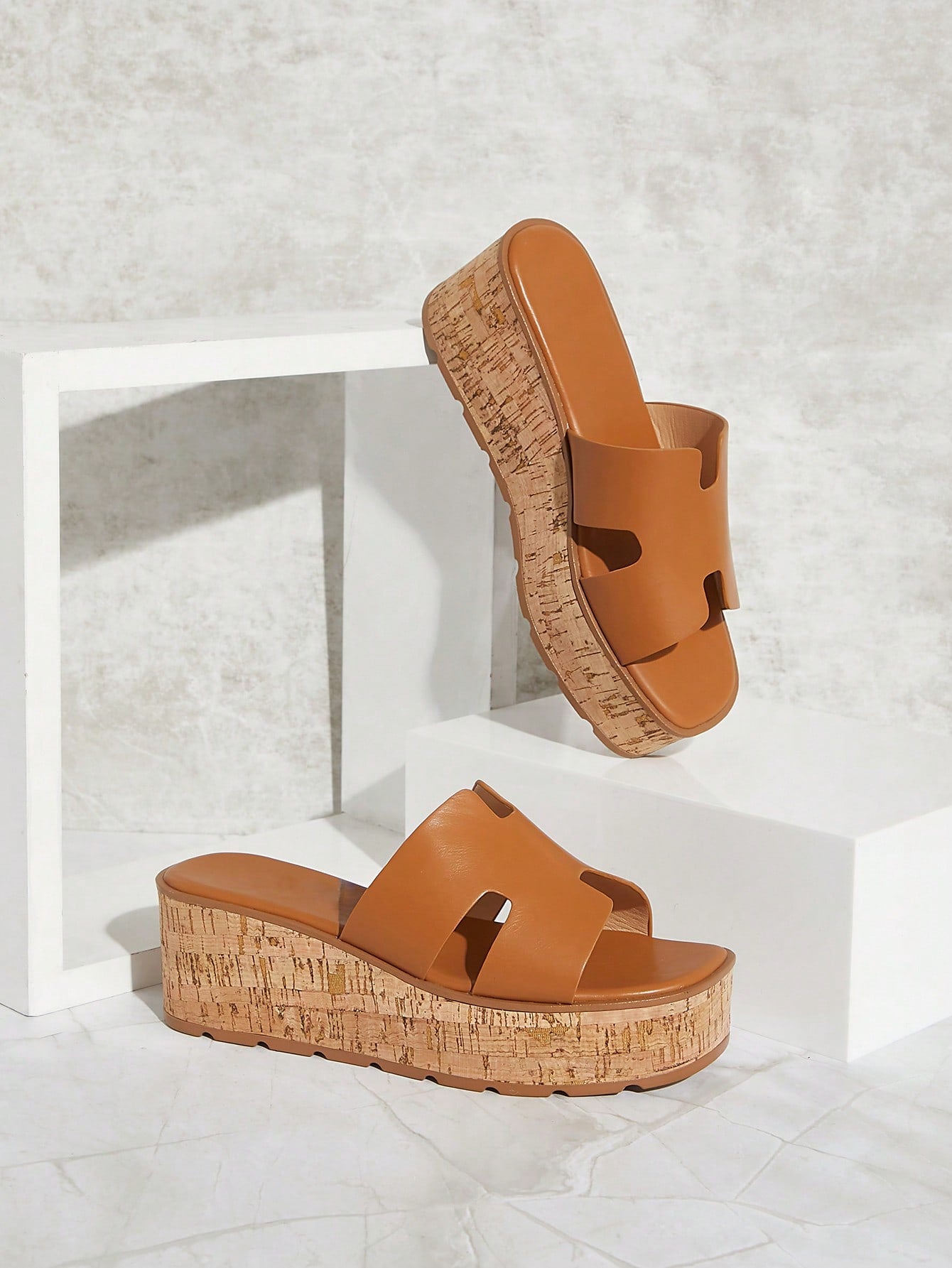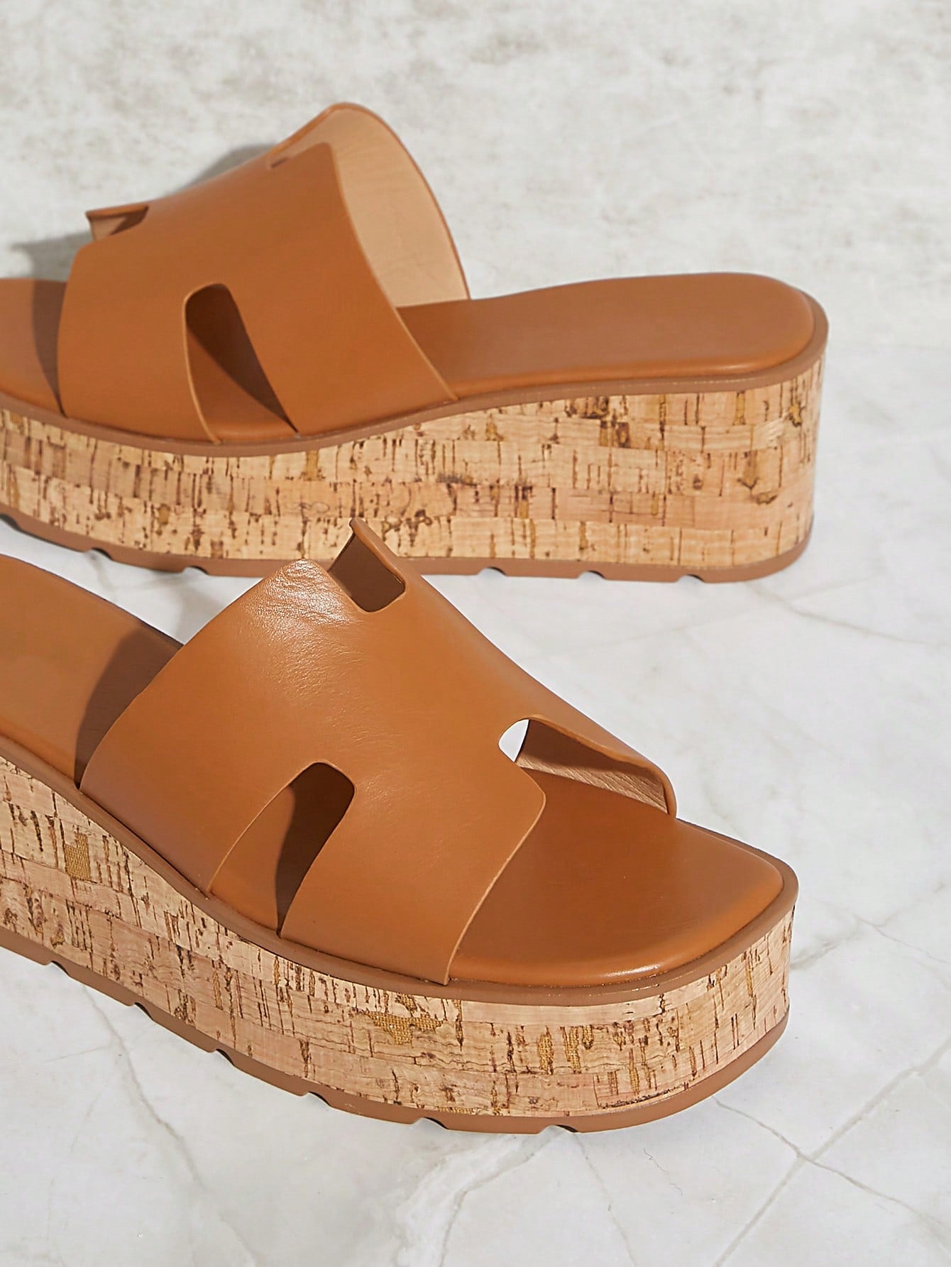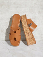 SHUZIA Luxury-Inspired Women's Harness Cut Out Square Toe Cork Platform PU Tan Wedge Slide Sandals –