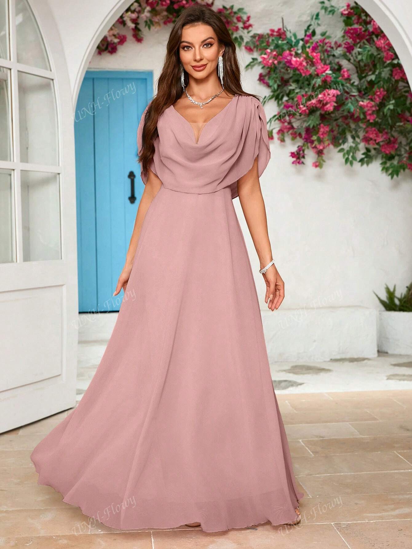 Solid Color Chiffon Draped Neck Bridesmaid Dress