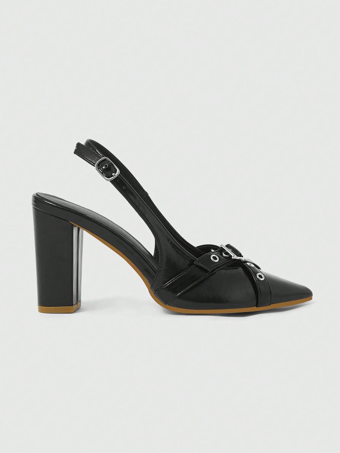 صندل ROMWE Goth نسائي أسود اللون بتصميم بانك مدبب عند الأصابع ومشبك للحزام وكعب عالٍ سهل الارتداء