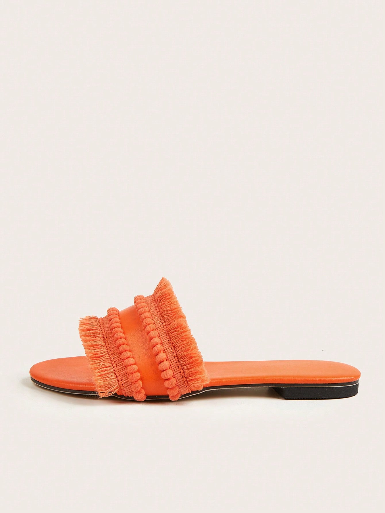 Women Orange Raw Trim Design Flat Sandals, Funky Open Toe Slide Sandals For Summer