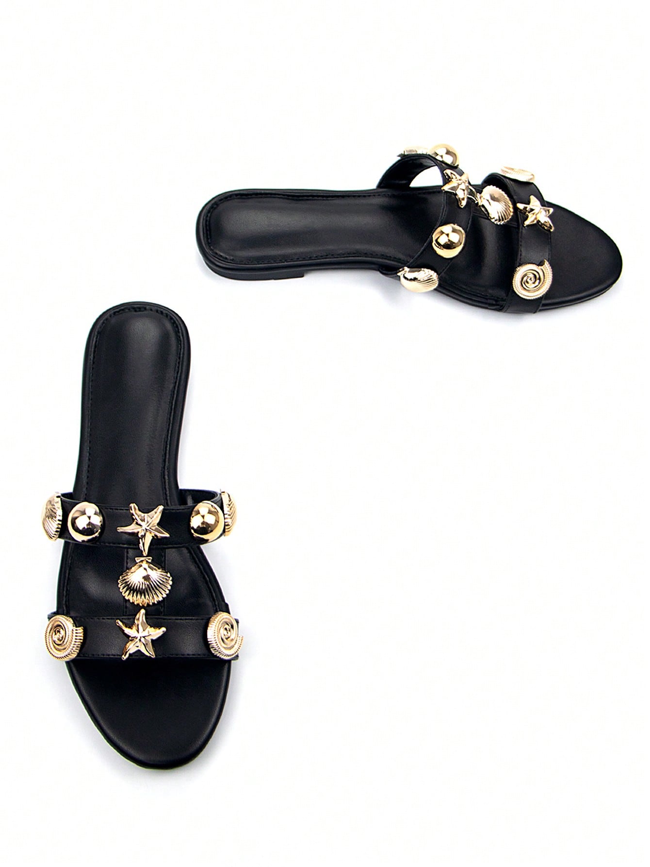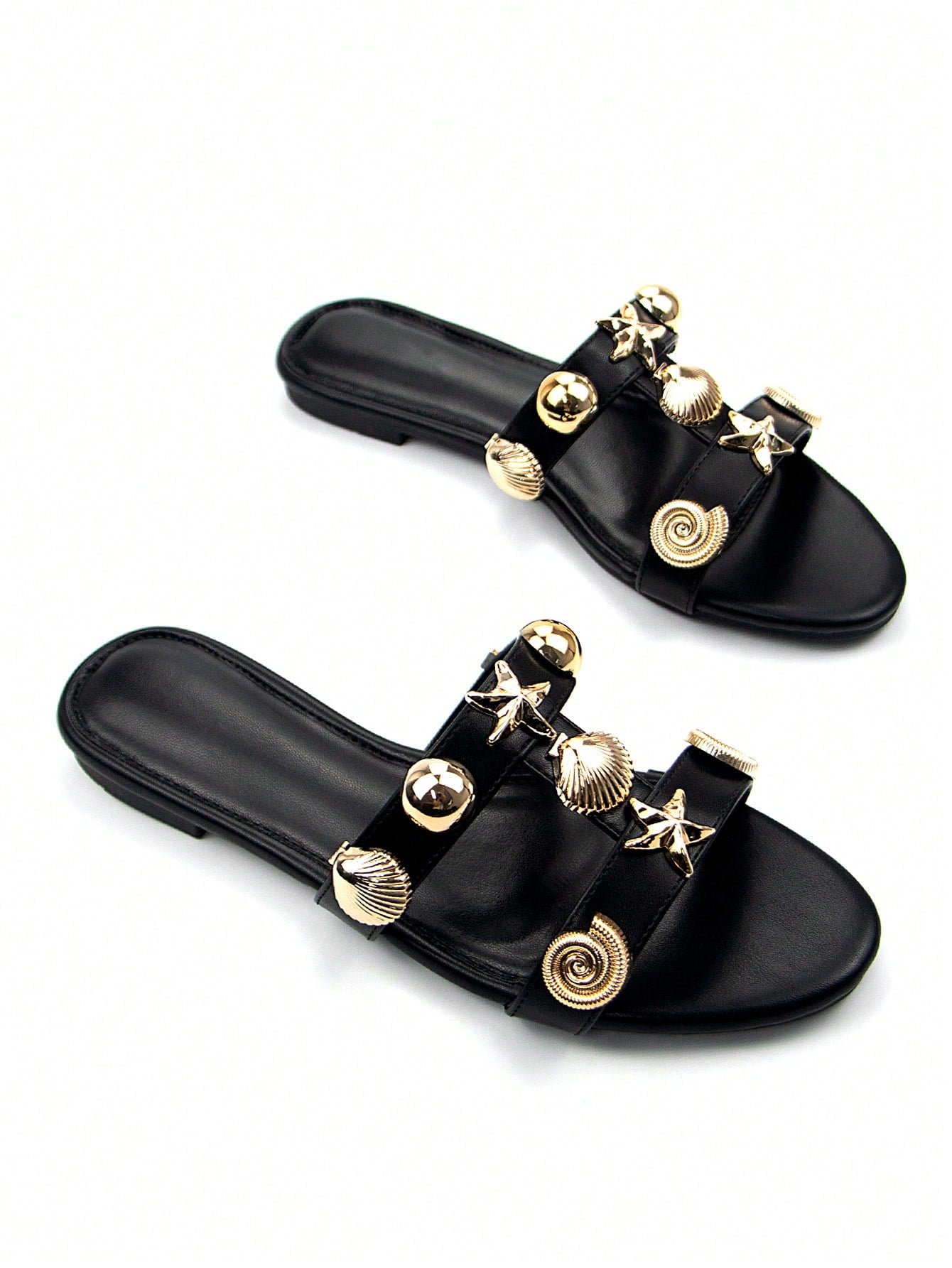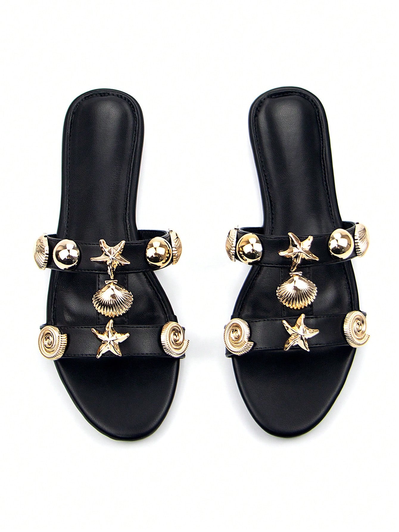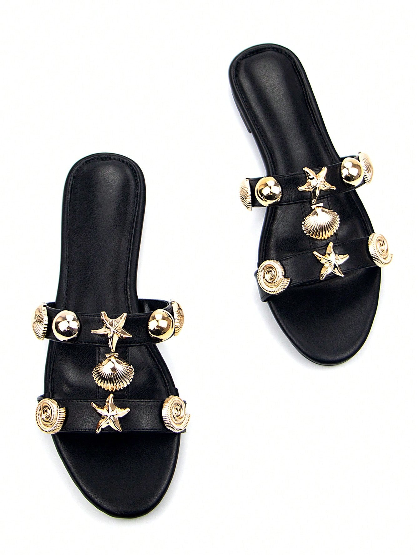 Women's Casual Stereoscopic Ocean Animal Metal Buckle Decor Black PU Fabric Fashion Comfortable Round