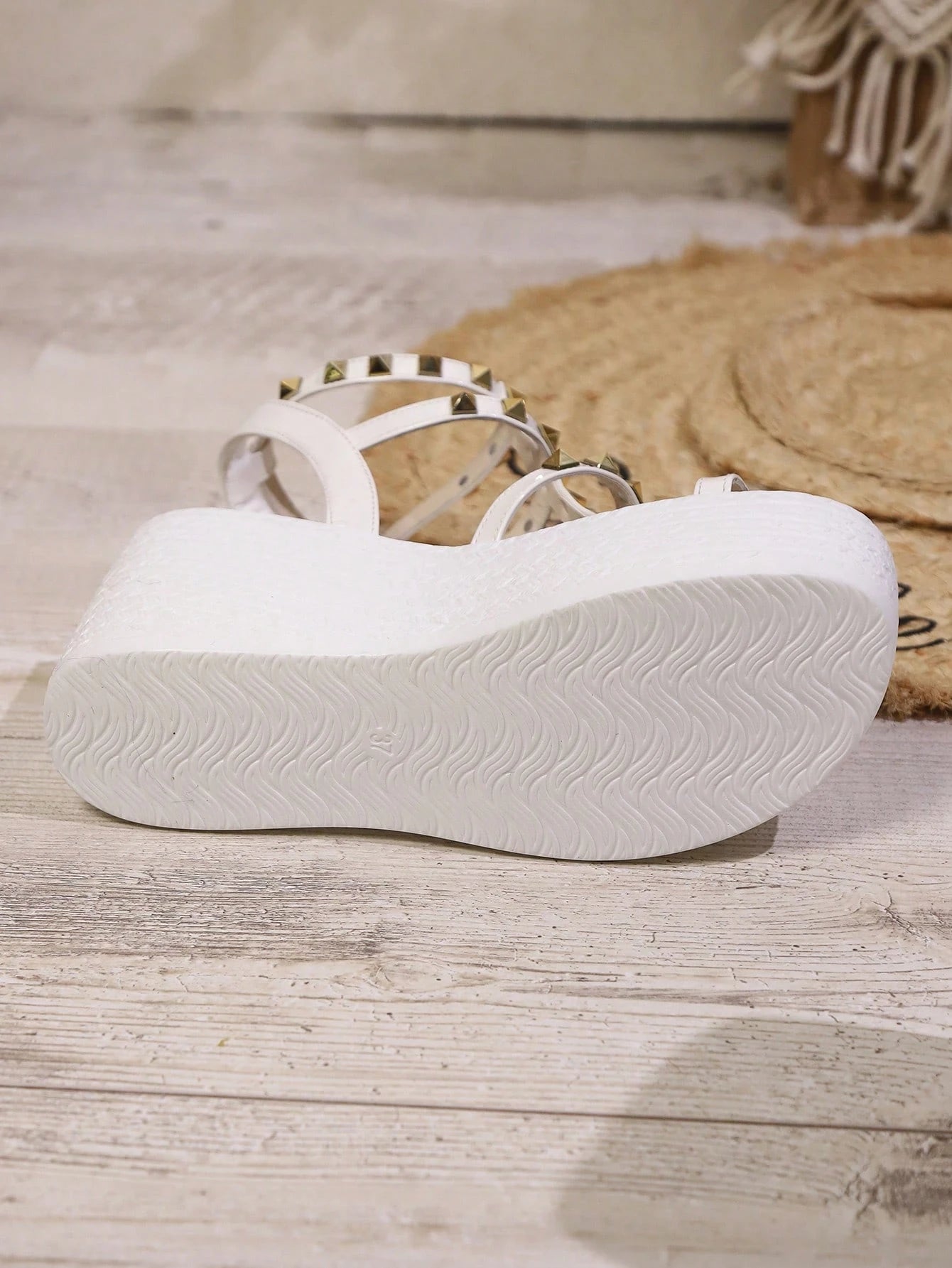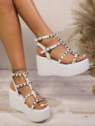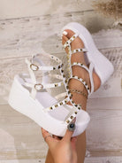 صندل نسائي ذو نعل سميك وأشرطة متقاطعة - كعب إسفيني سميك مع مسامير هرمية وإبزيم للإغلاق