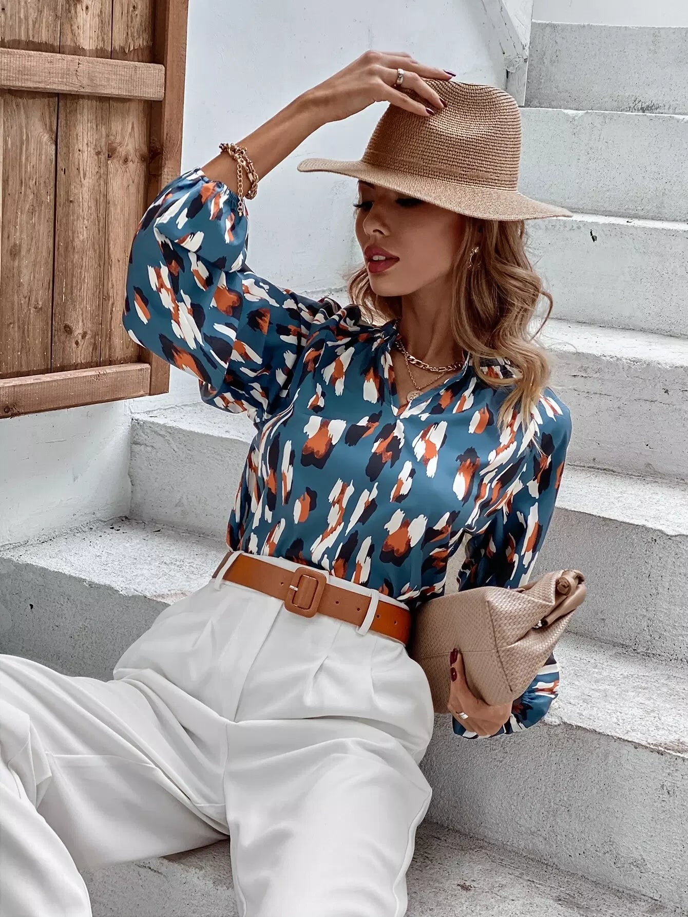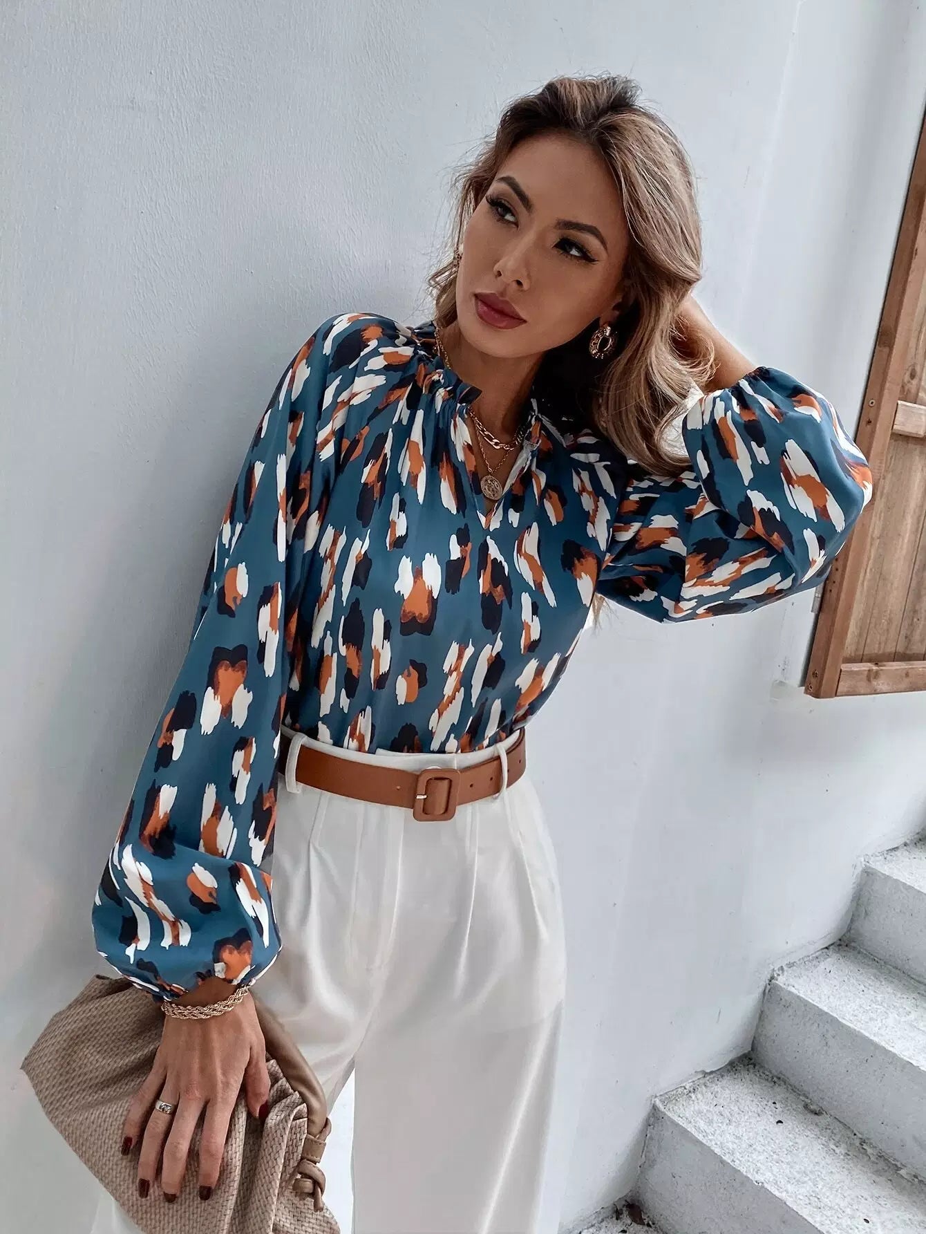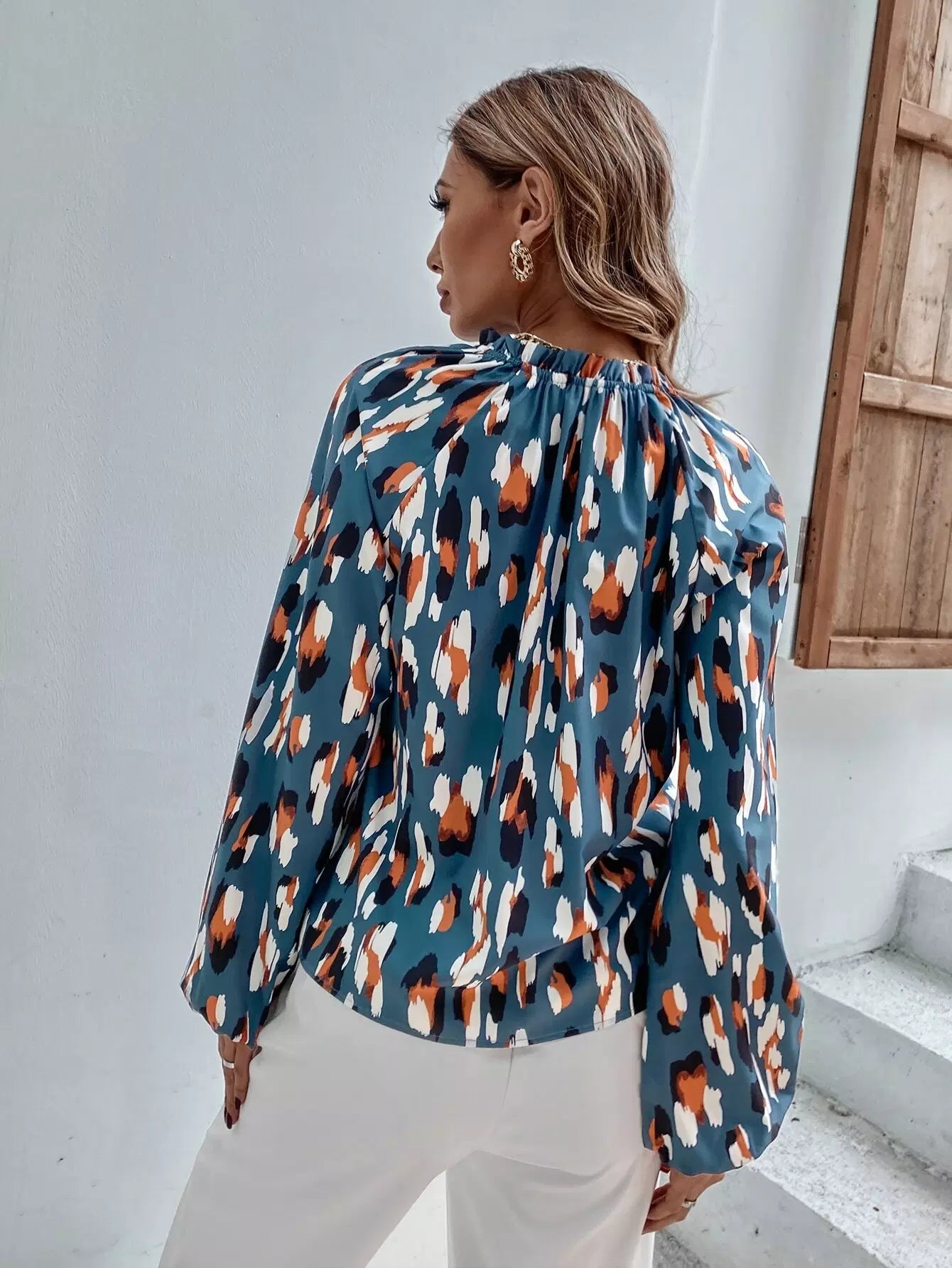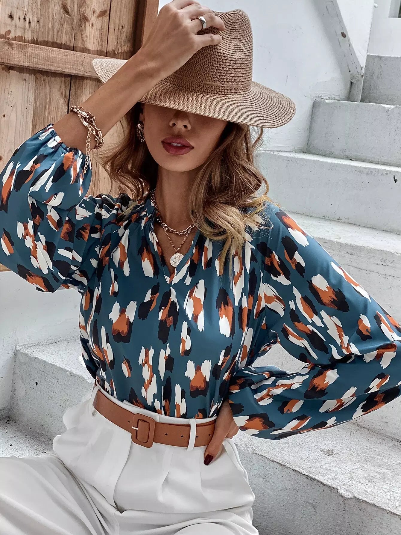 بلوزة بأكمام راجلان مطبوعة بالكامل على الرقبة بفتحة رقبة مدببة