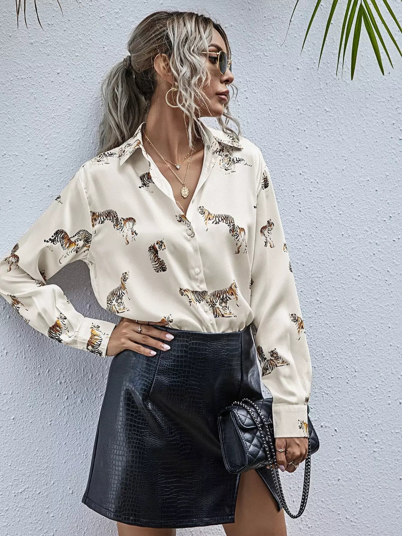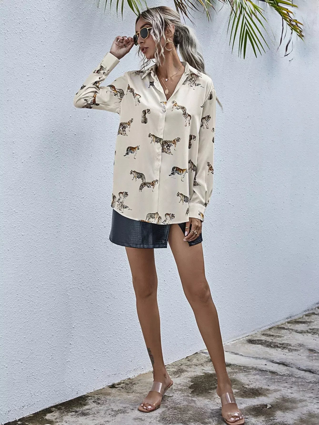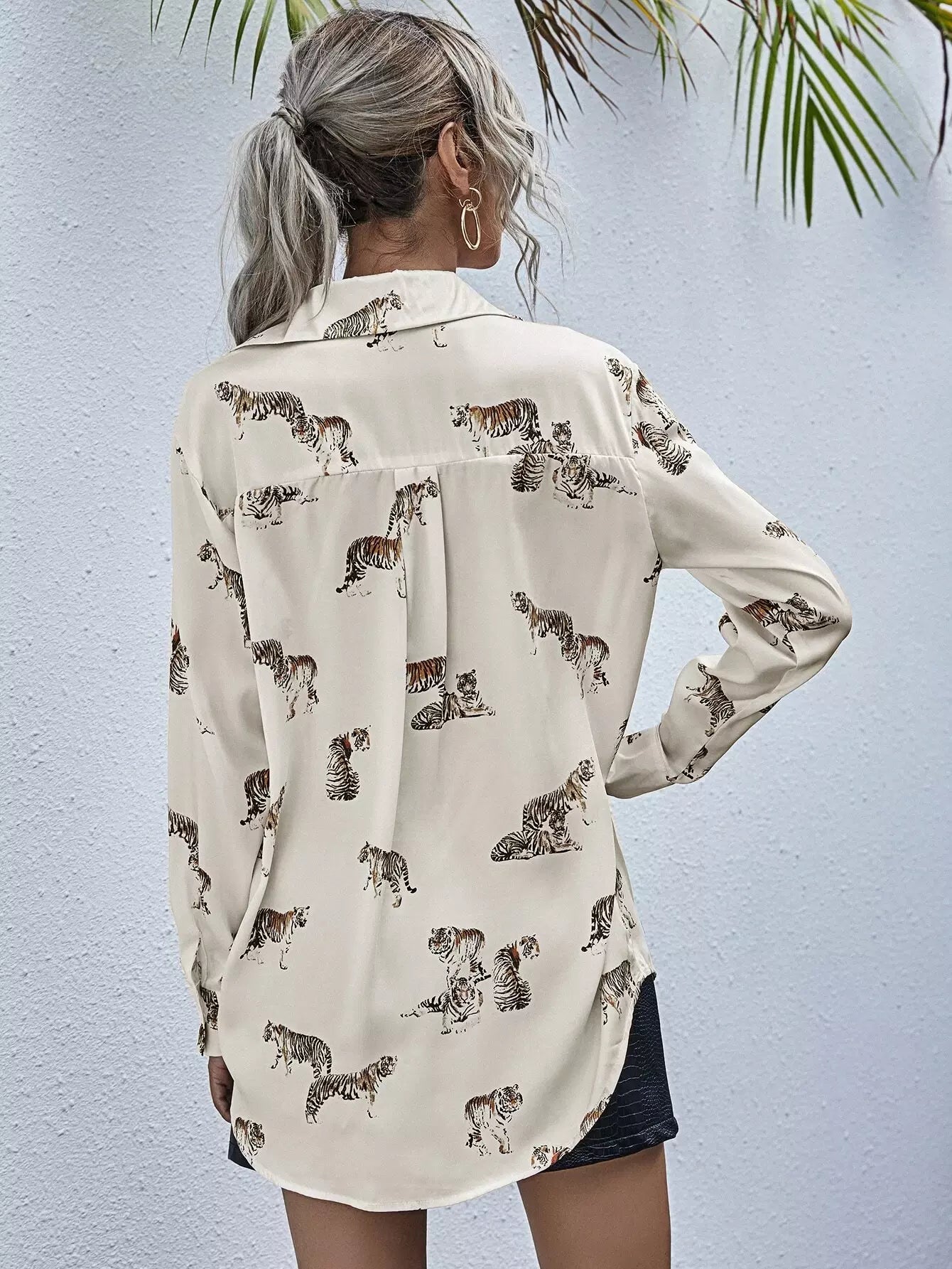 بلوزة طويلة بطبعة نمر مطبوع عليها بالكامل