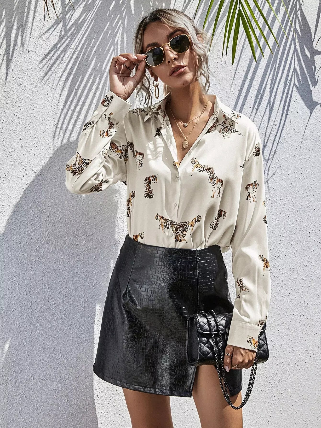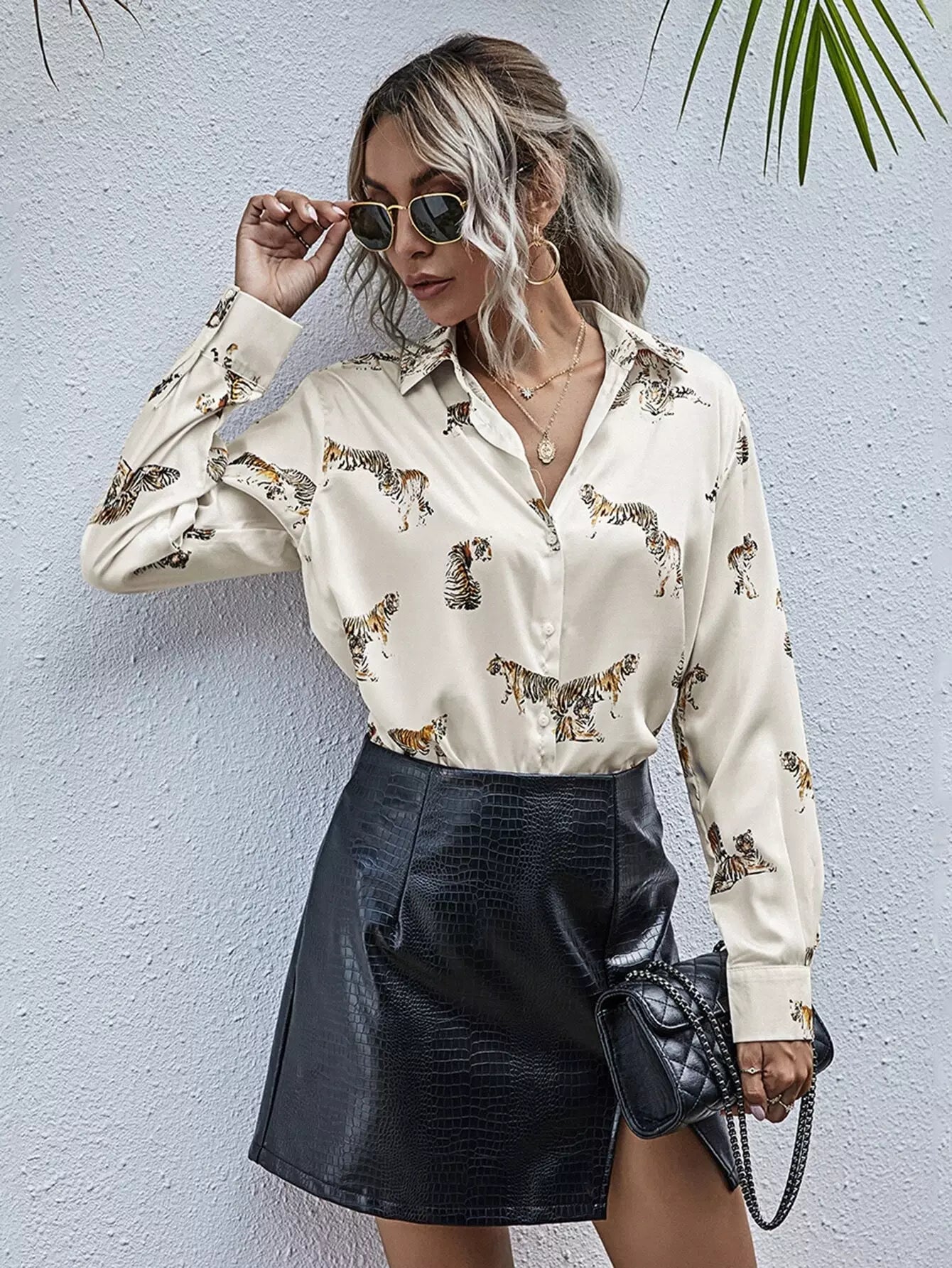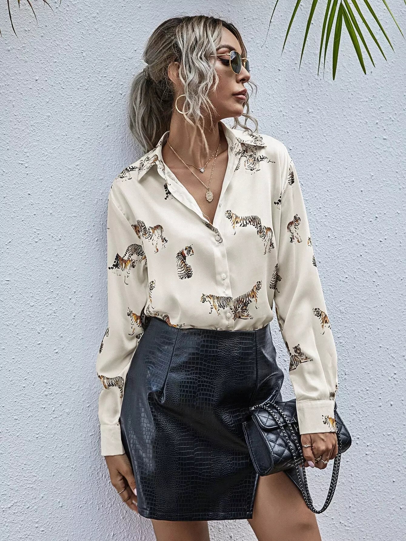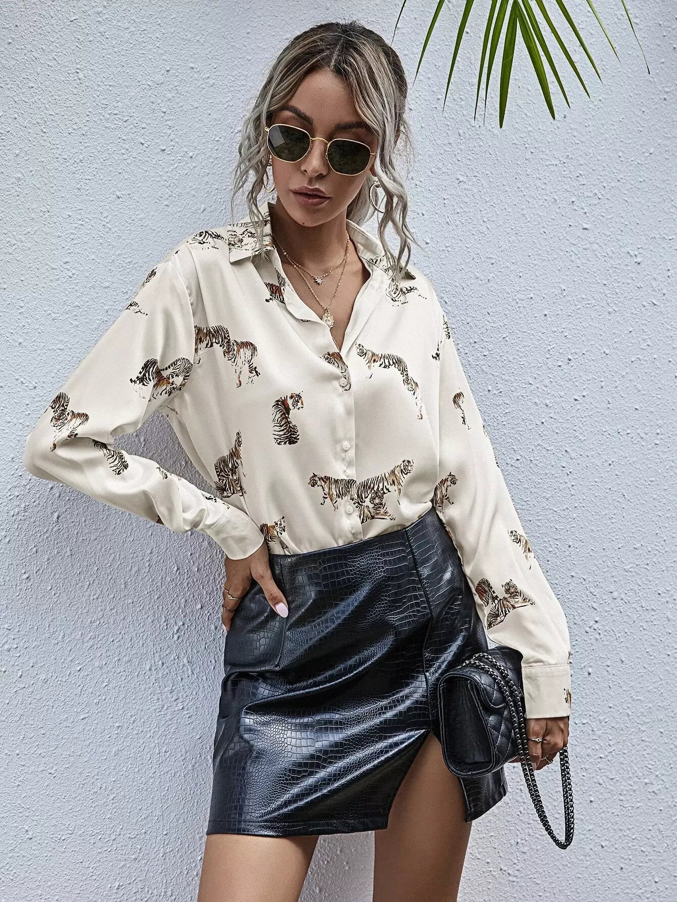 بلوزة طويلة بطبعة نمر مطبوع عليها بالكامل