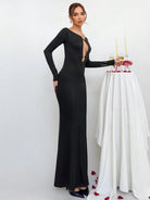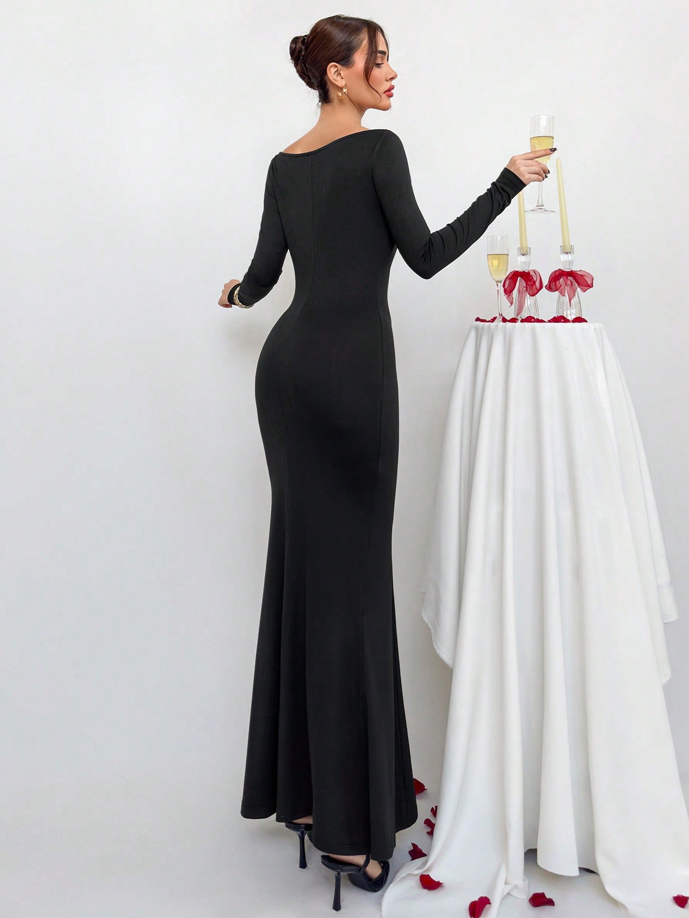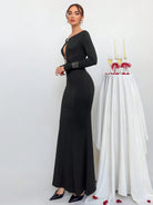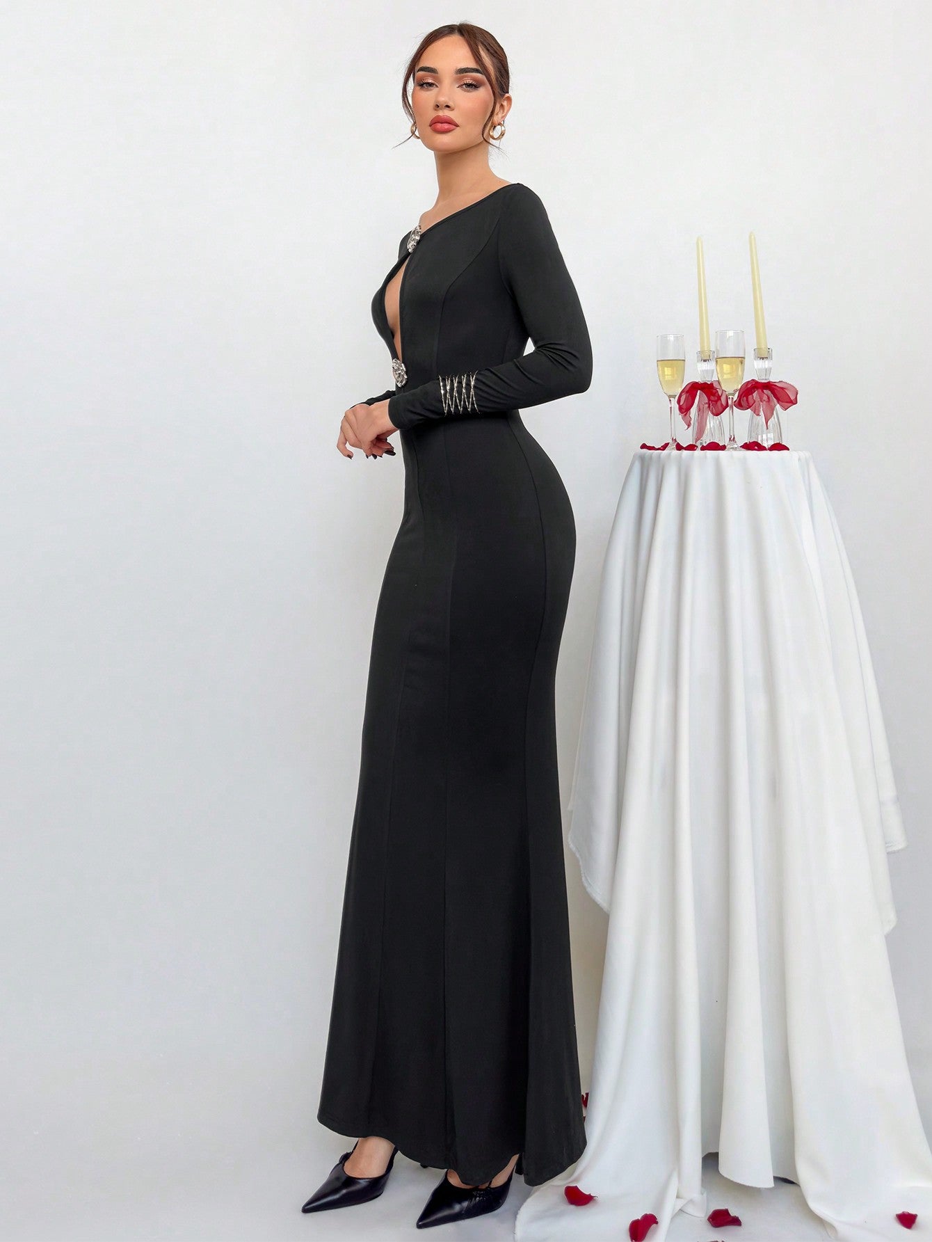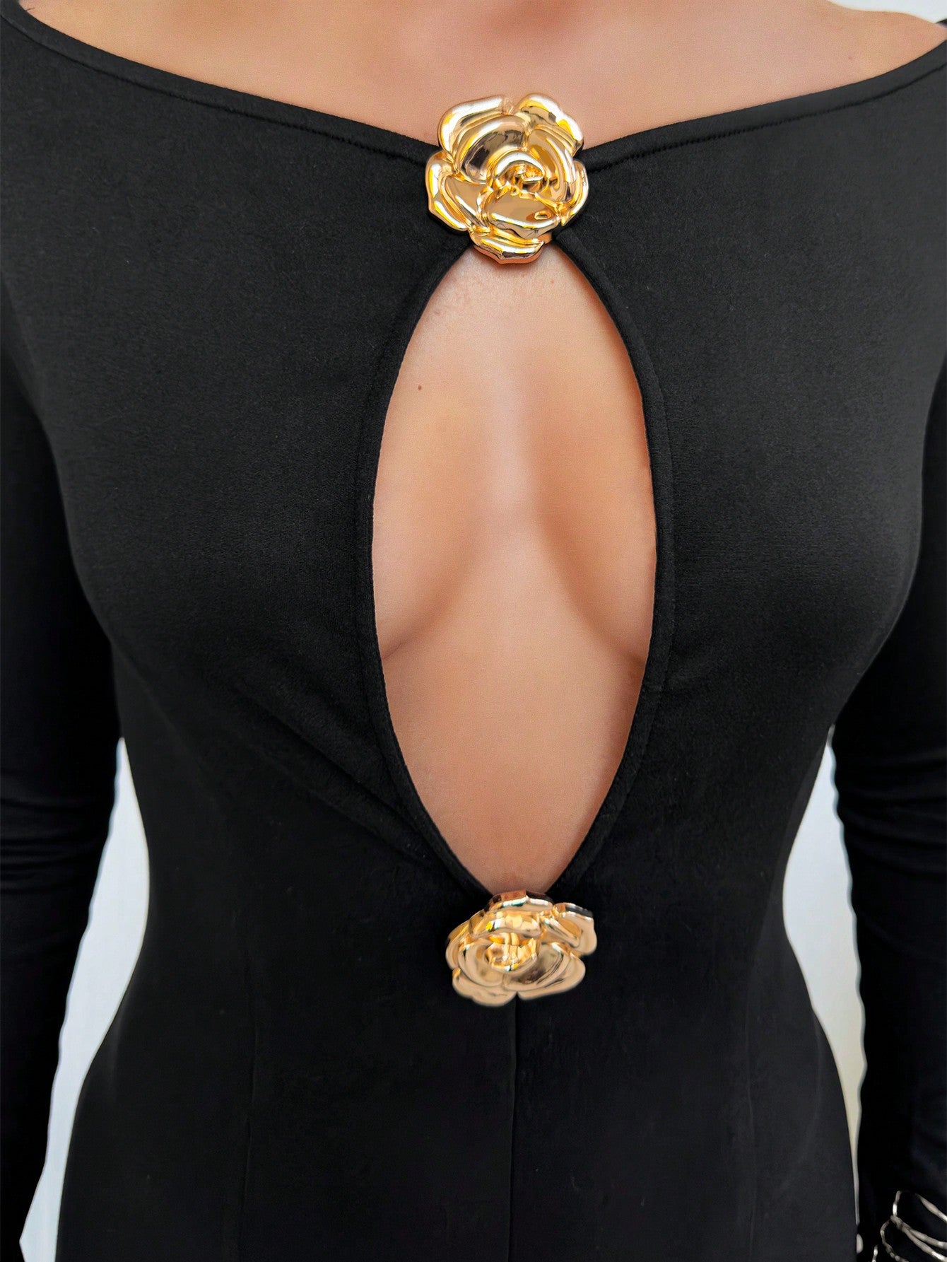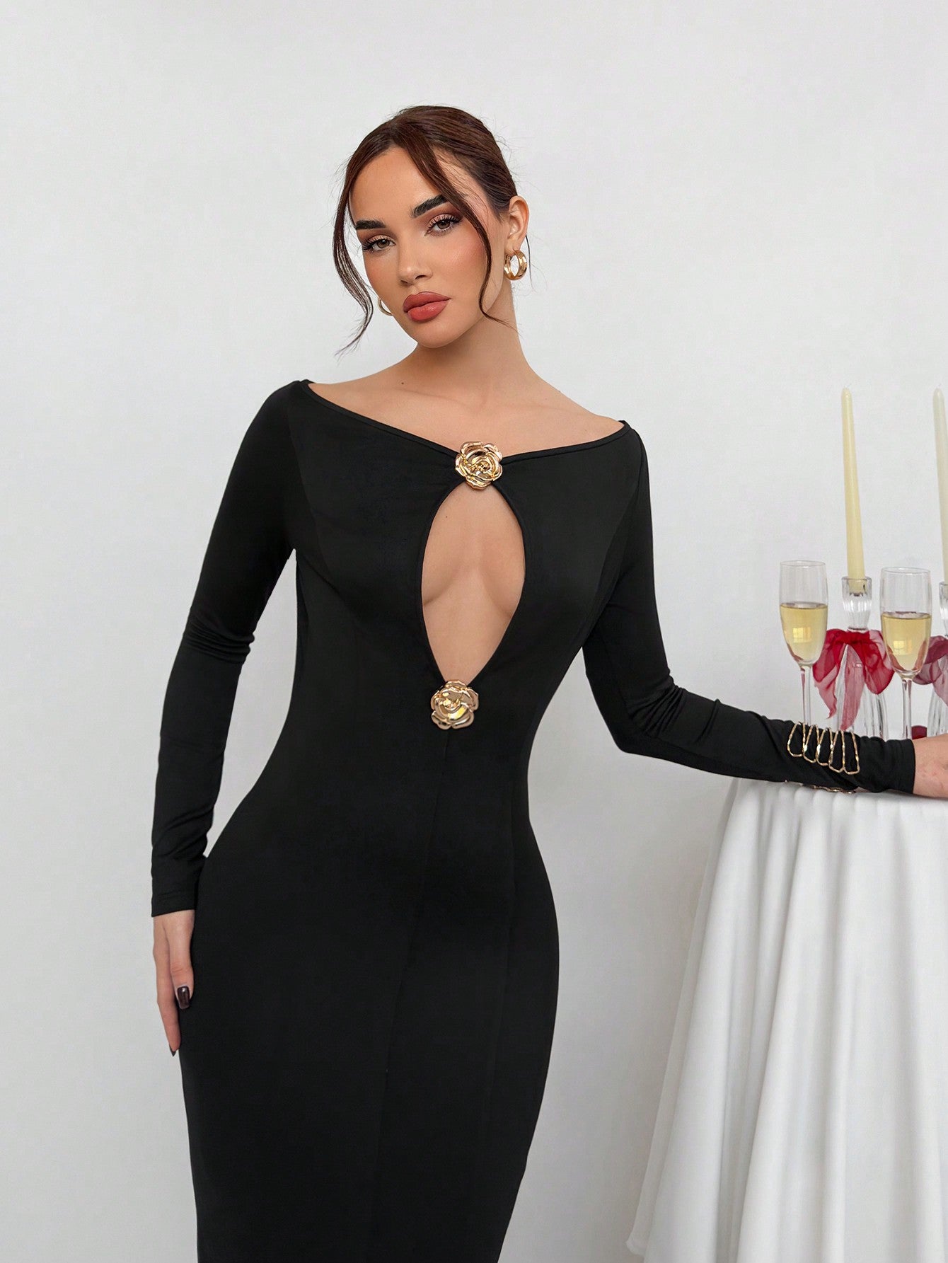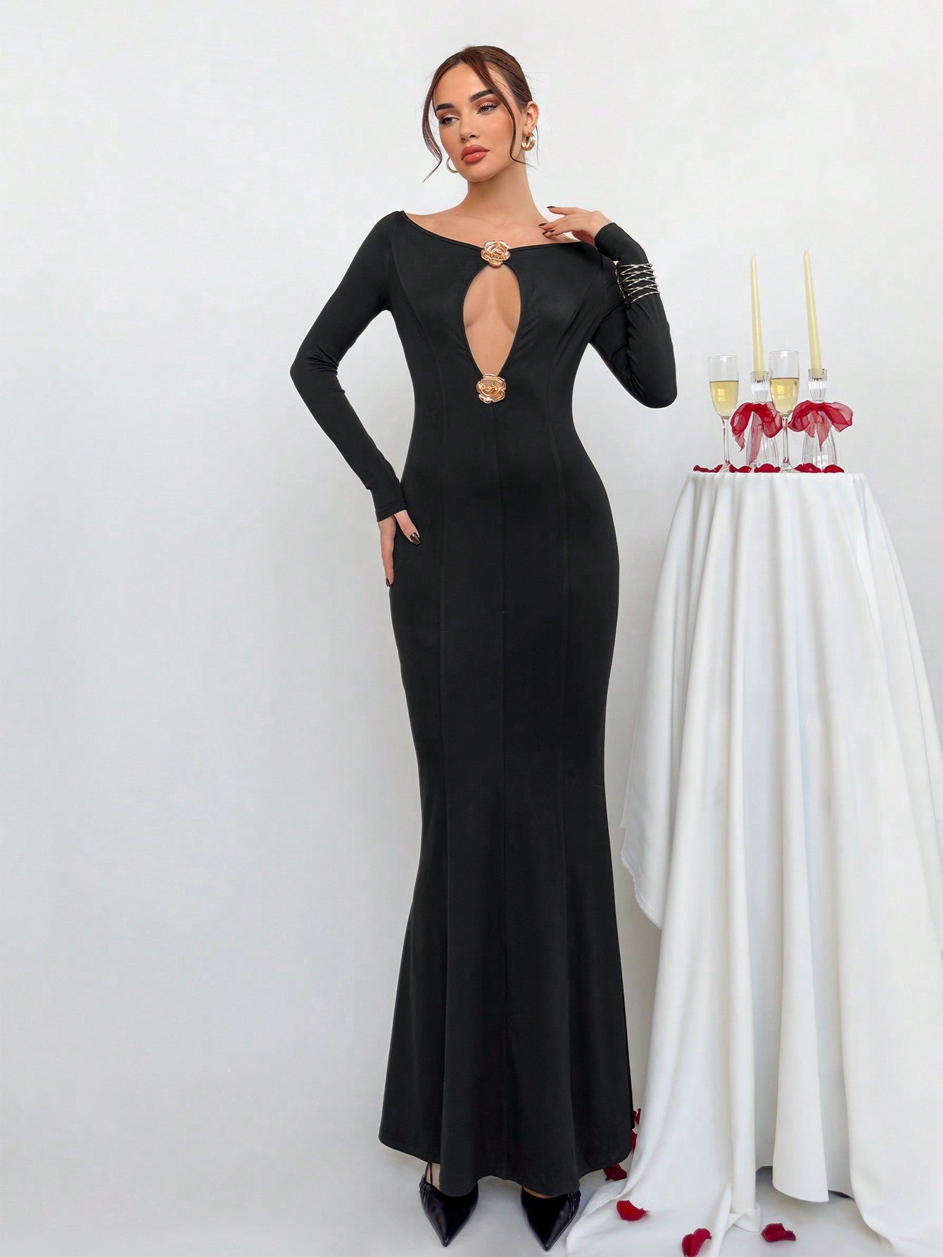 Aloruh Women's Black Cutout Metal Decor Off Shoulder Fitted Long Party Dress For Autumn/Winter