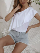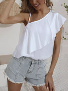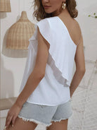 بلوزة بياقة غير متماثلة ذات حواف مكشكشة برقبة غير متماثلة