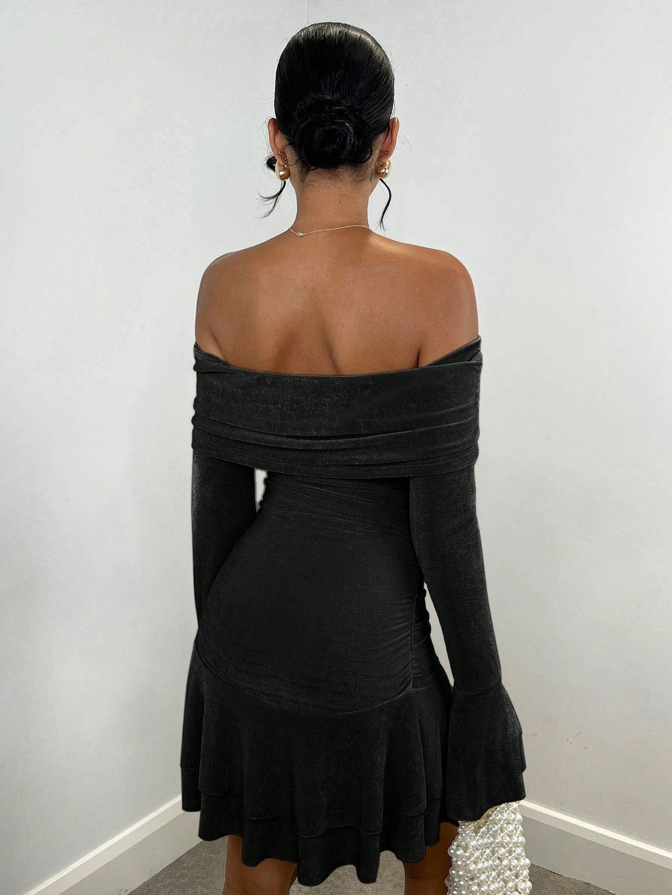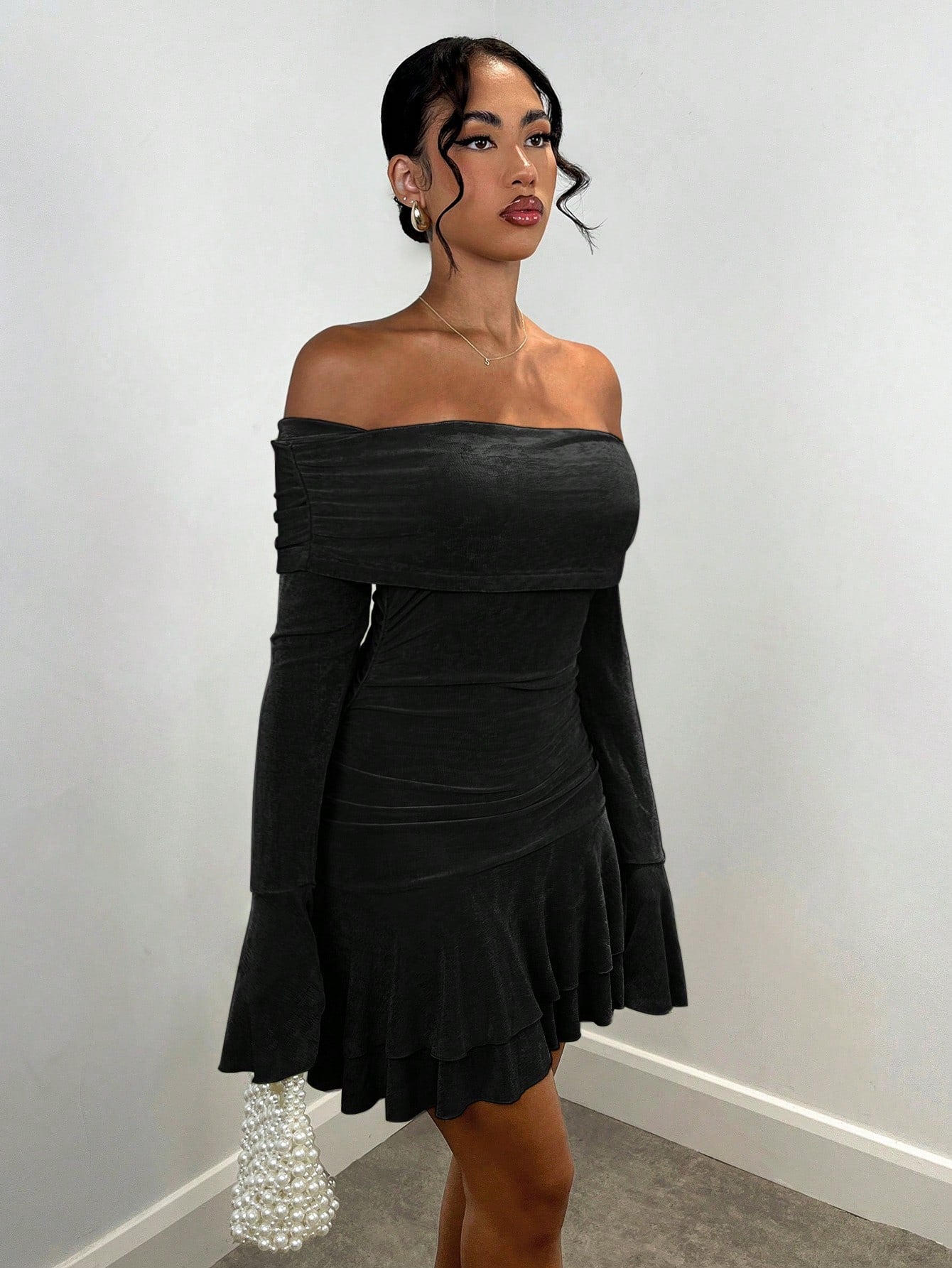 فستان نسائي أنيق من BAE بلون سادة مكشوف الكتفين بأكمام واسعة وحاشية مكشكشة، مناسب للربيع والخريف