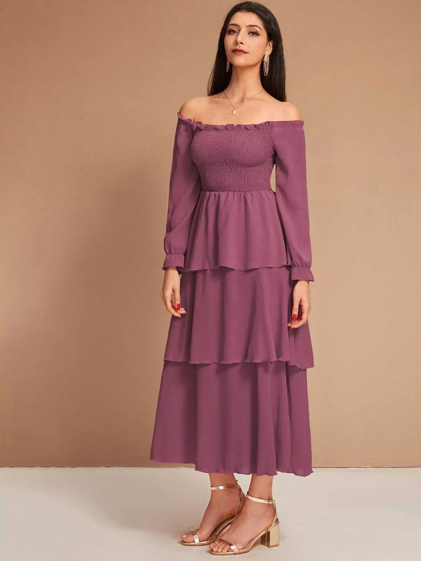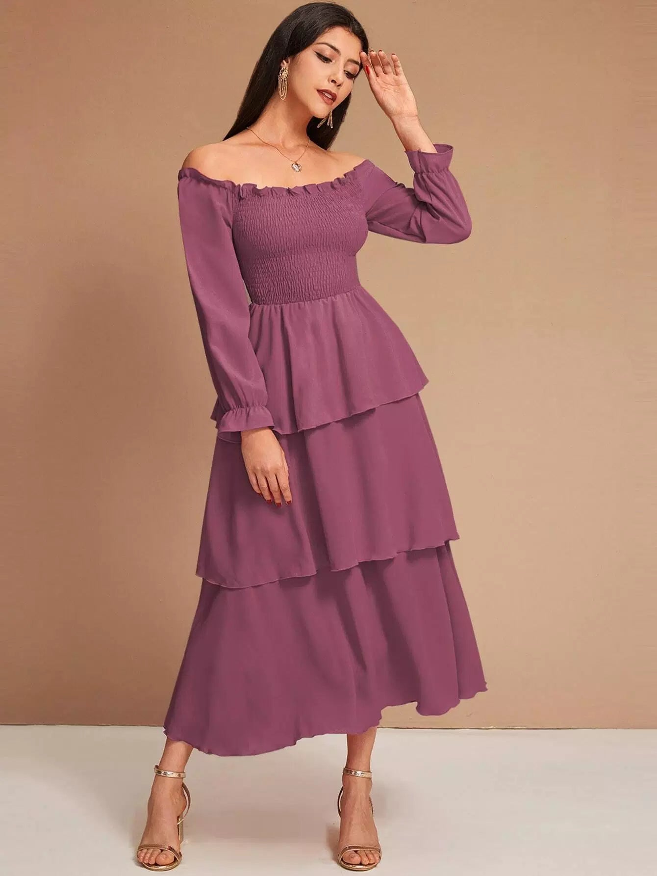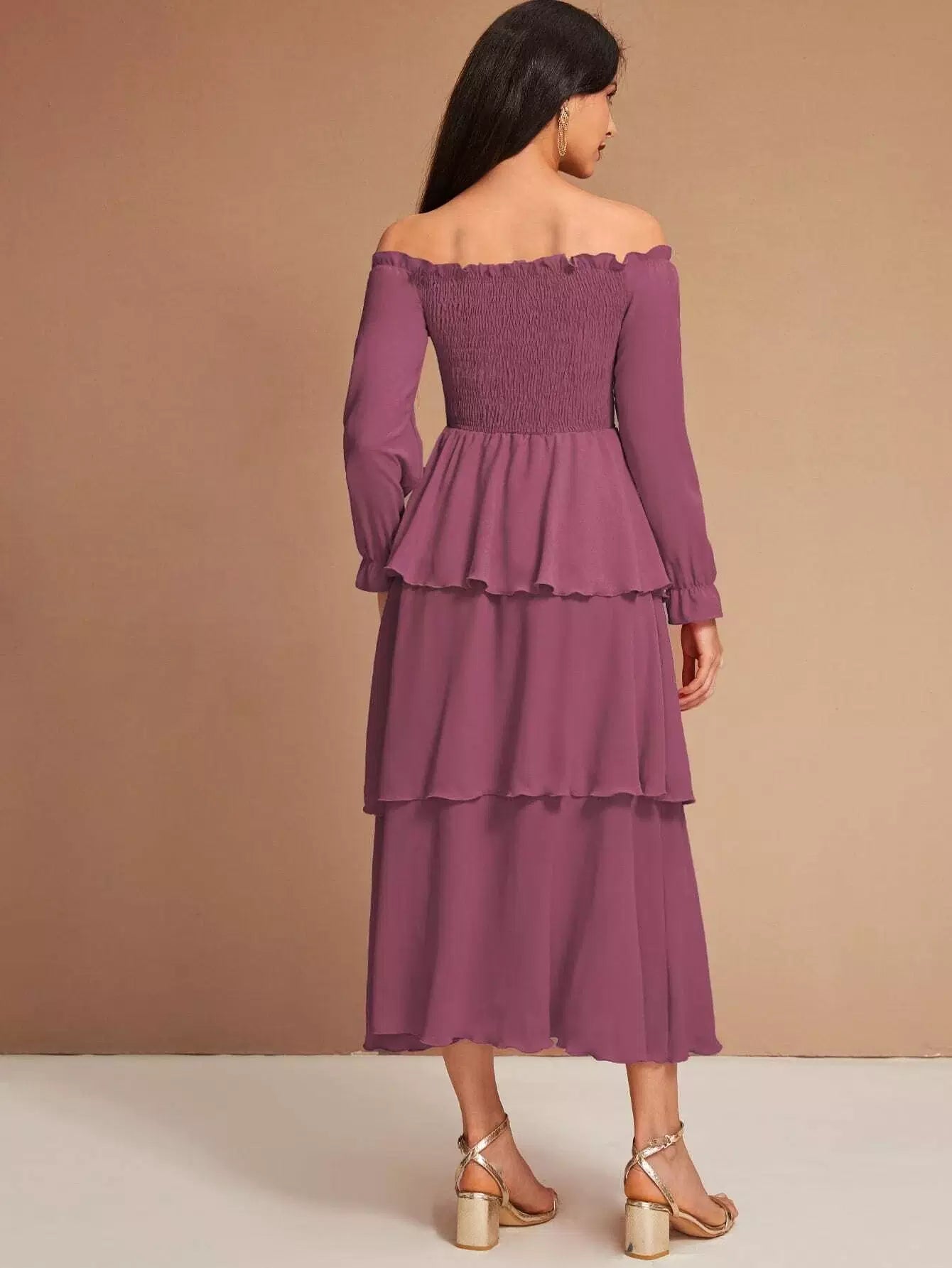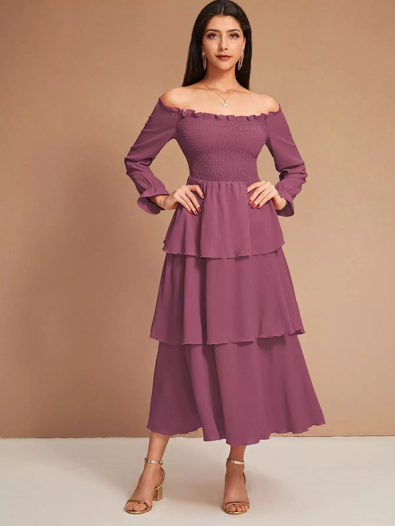 للنساء - فستان باردو على شكل حرف A بحاشية ذات طبقات ومكشكش