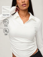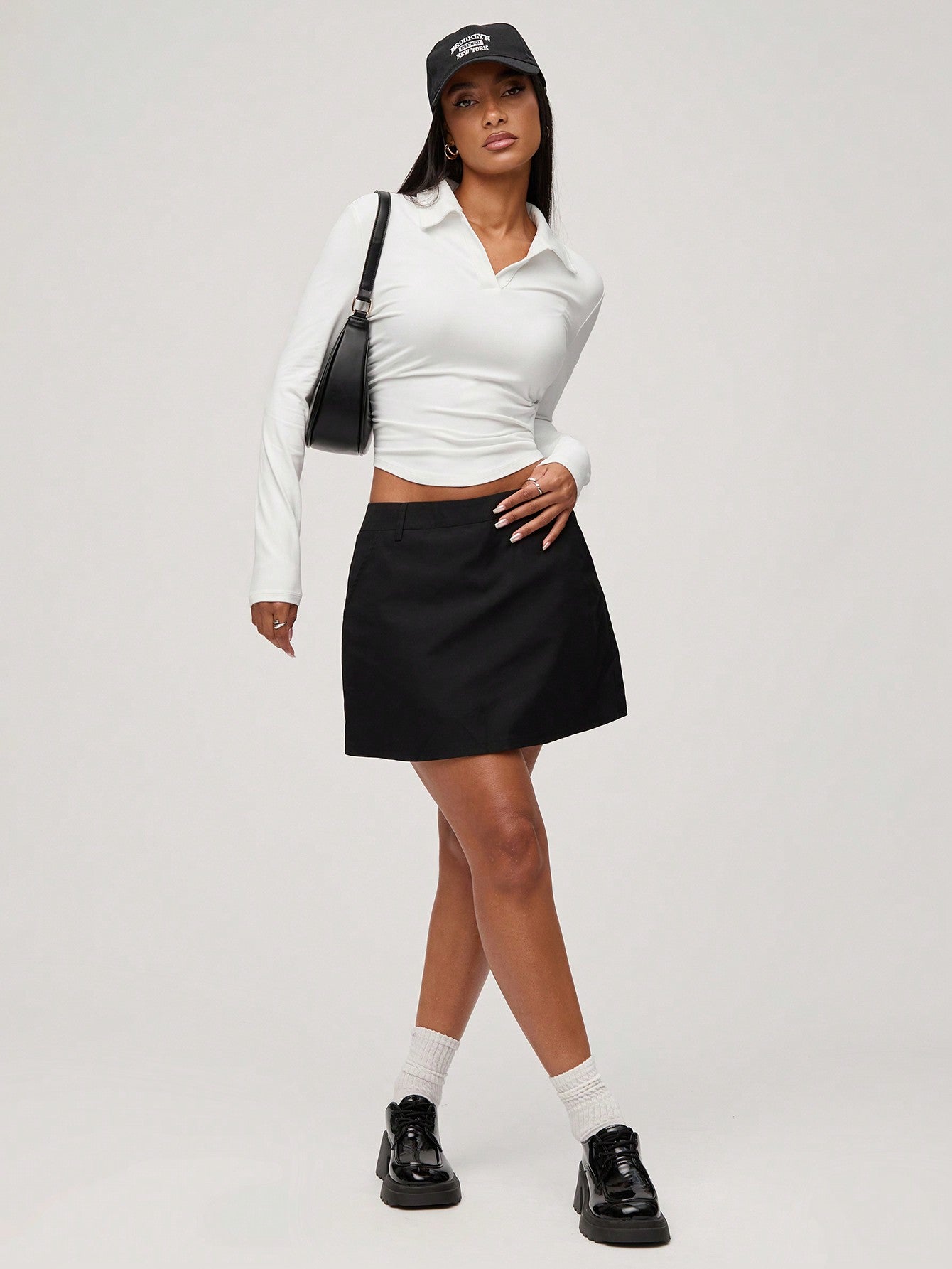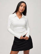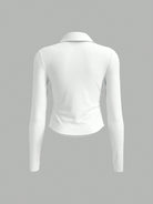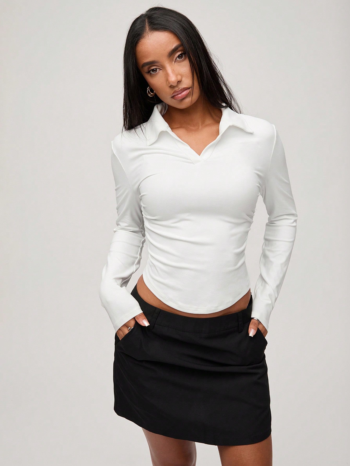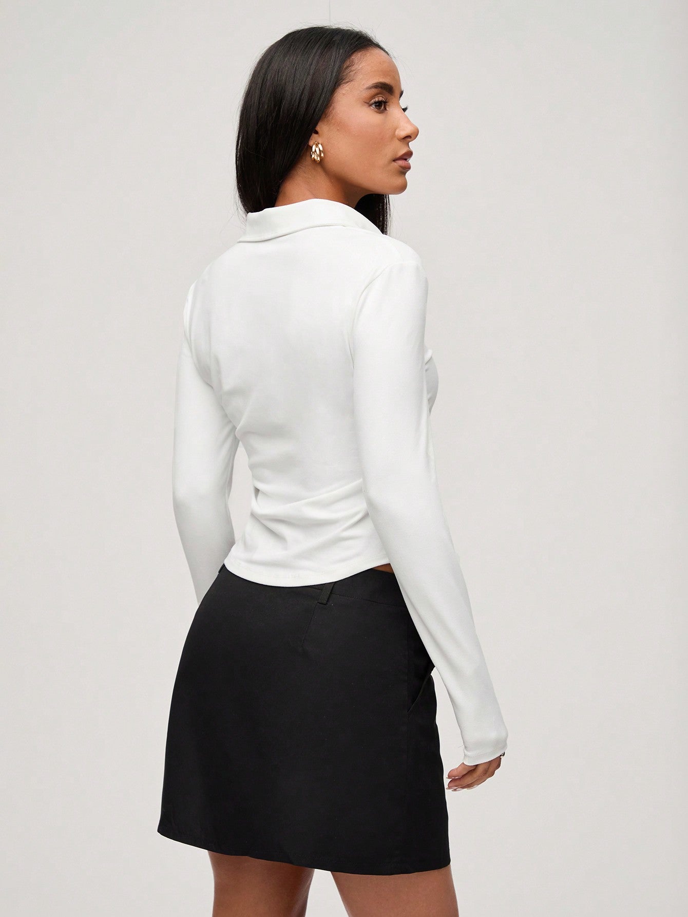 بلوزة أساسية كاجوال بلون سادة محبوكة بأكمام طويلة وياقة وأزرار أمامية نصفية وجوانب مطوية