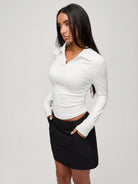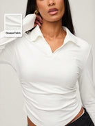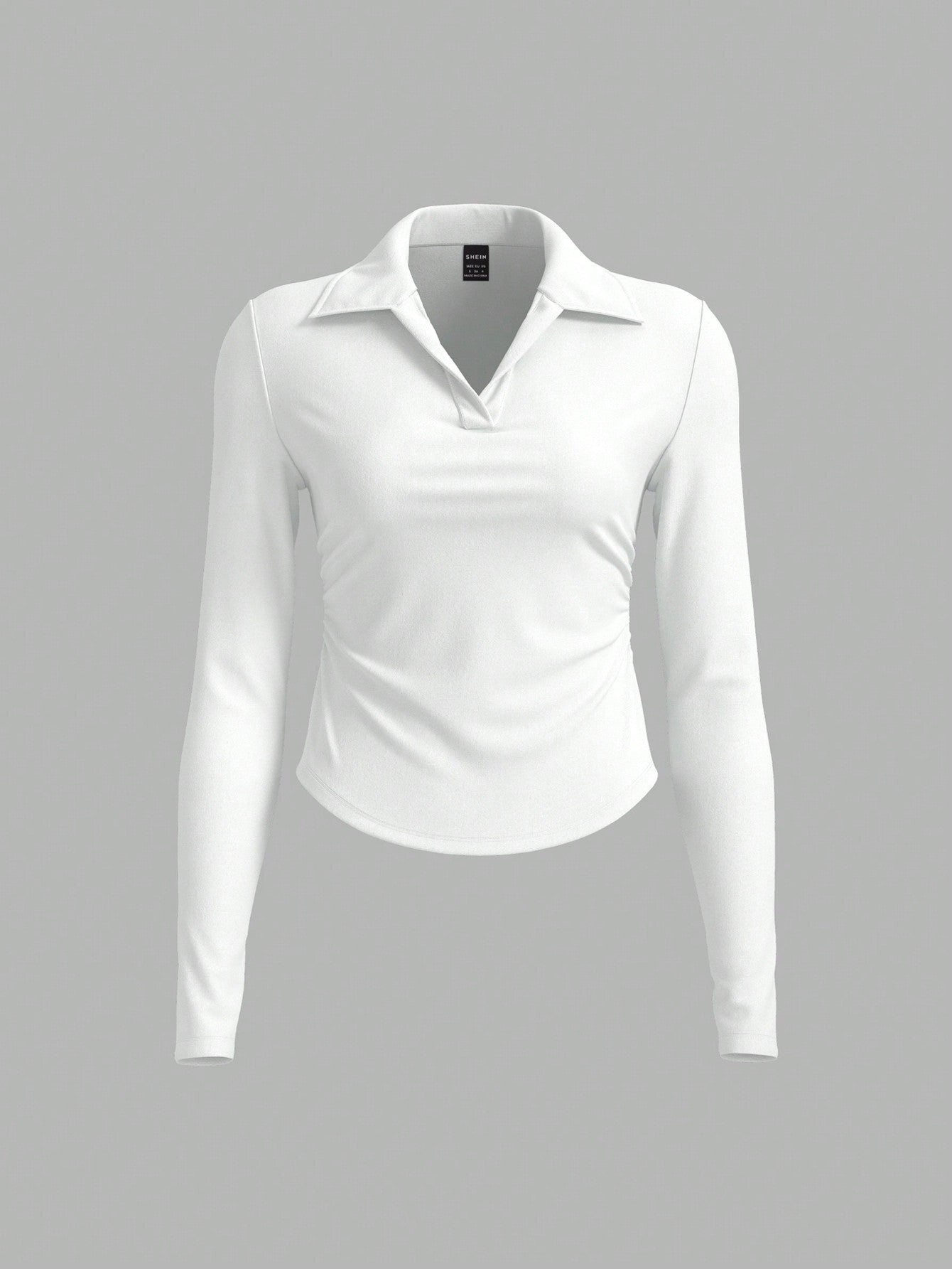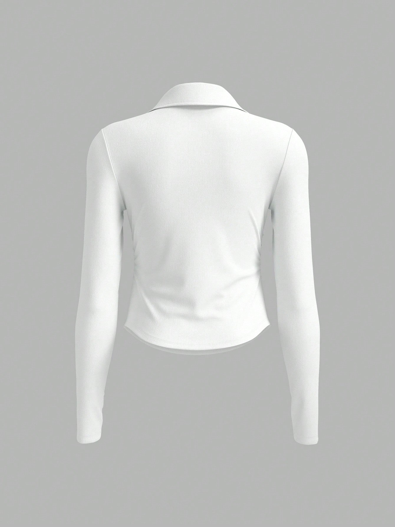 BASICS Casual Solid Color Knit Collared Half-Button Front Fitted Long Sleeve Blouse With Pleated Sides