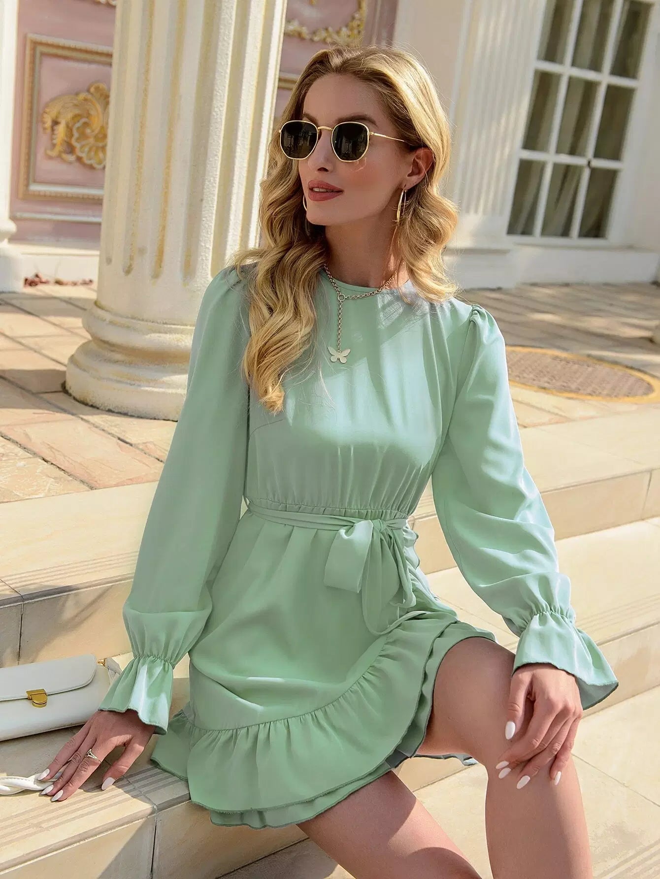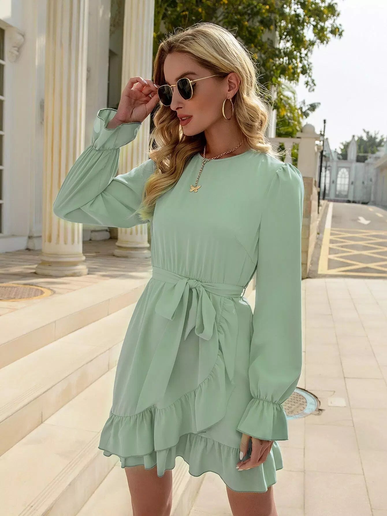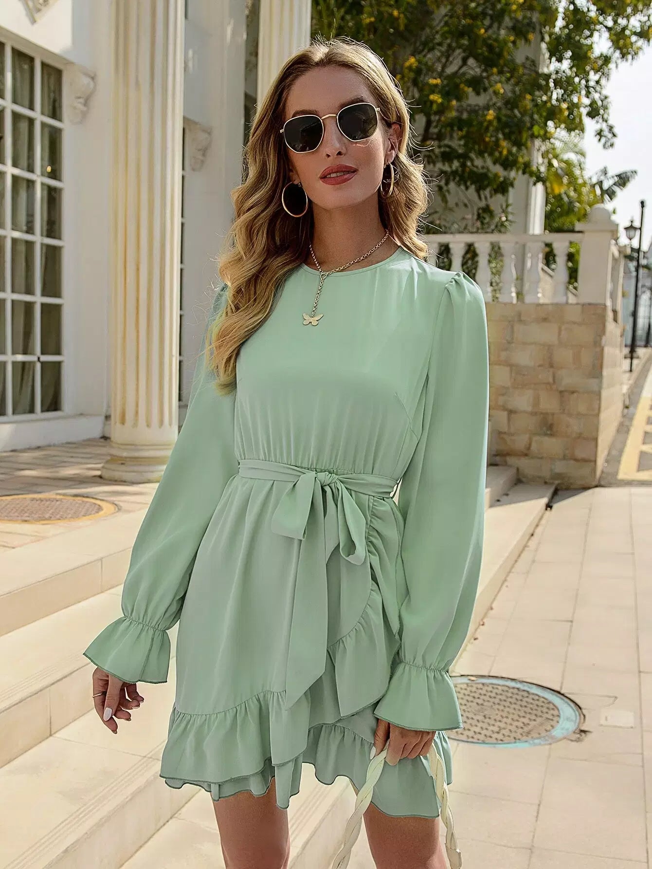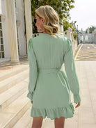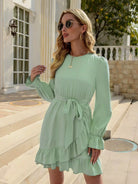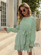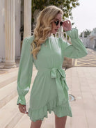 فستان بحاشية مكشكشة وأكمام جرس بدون حزام