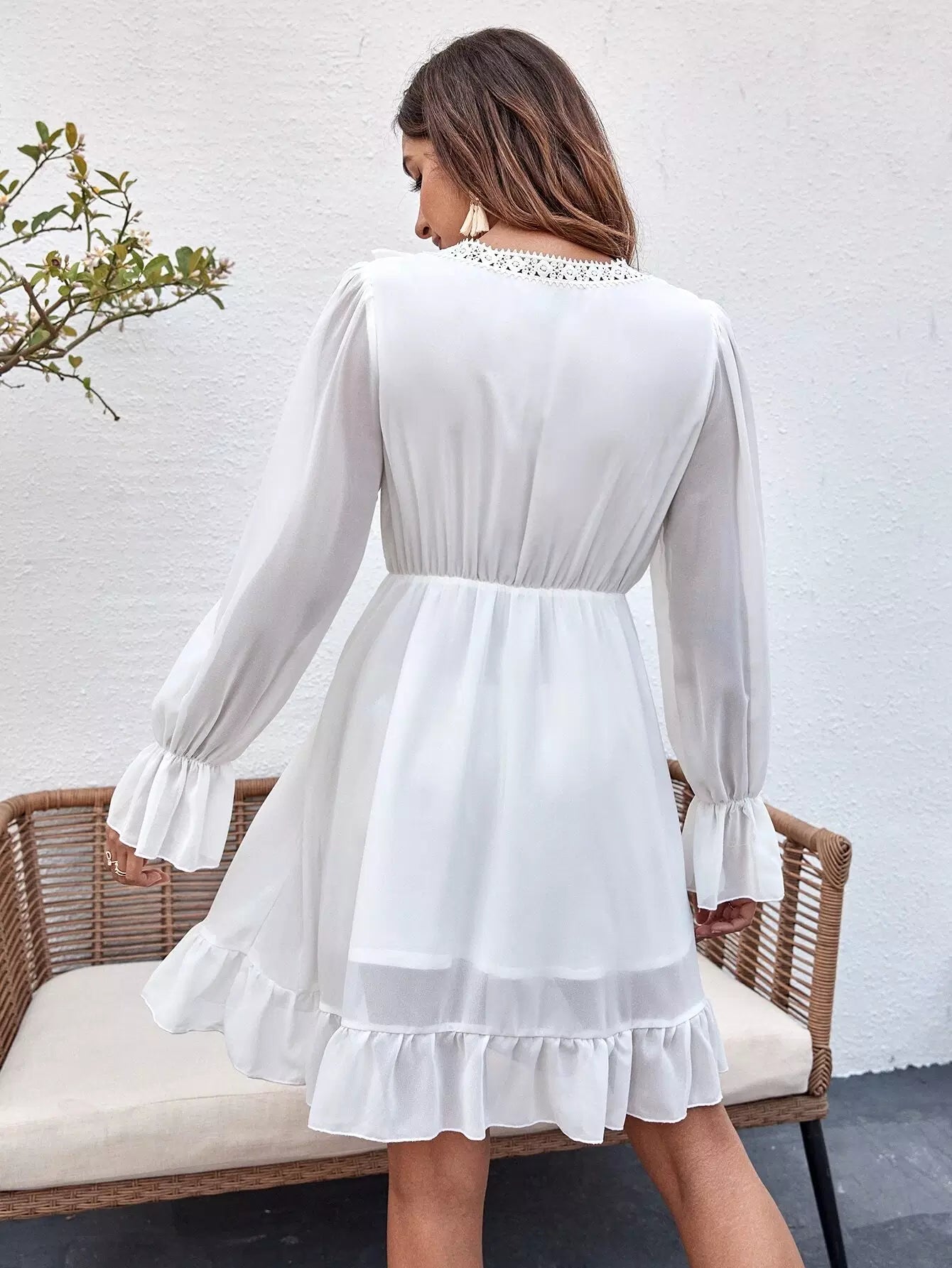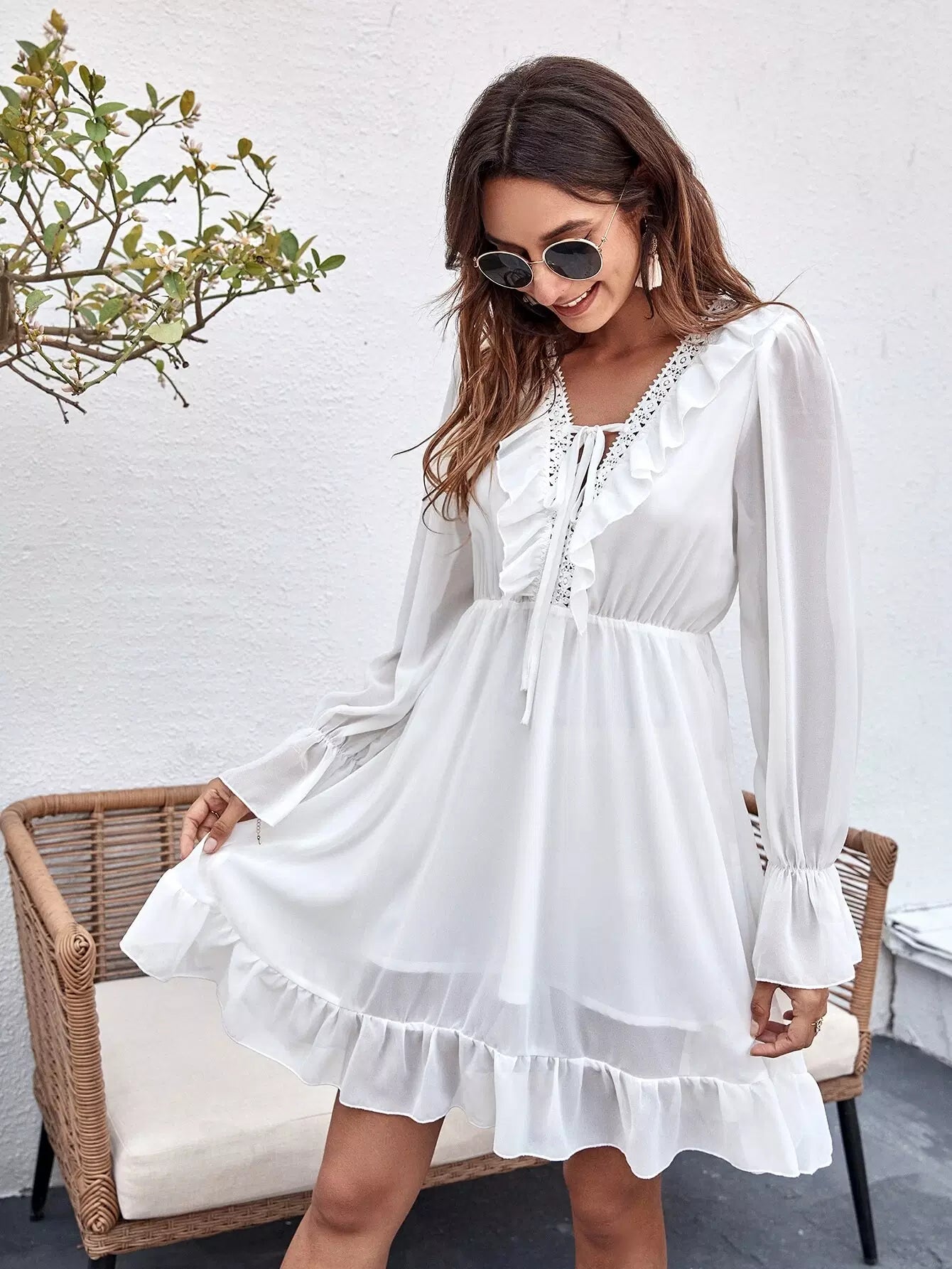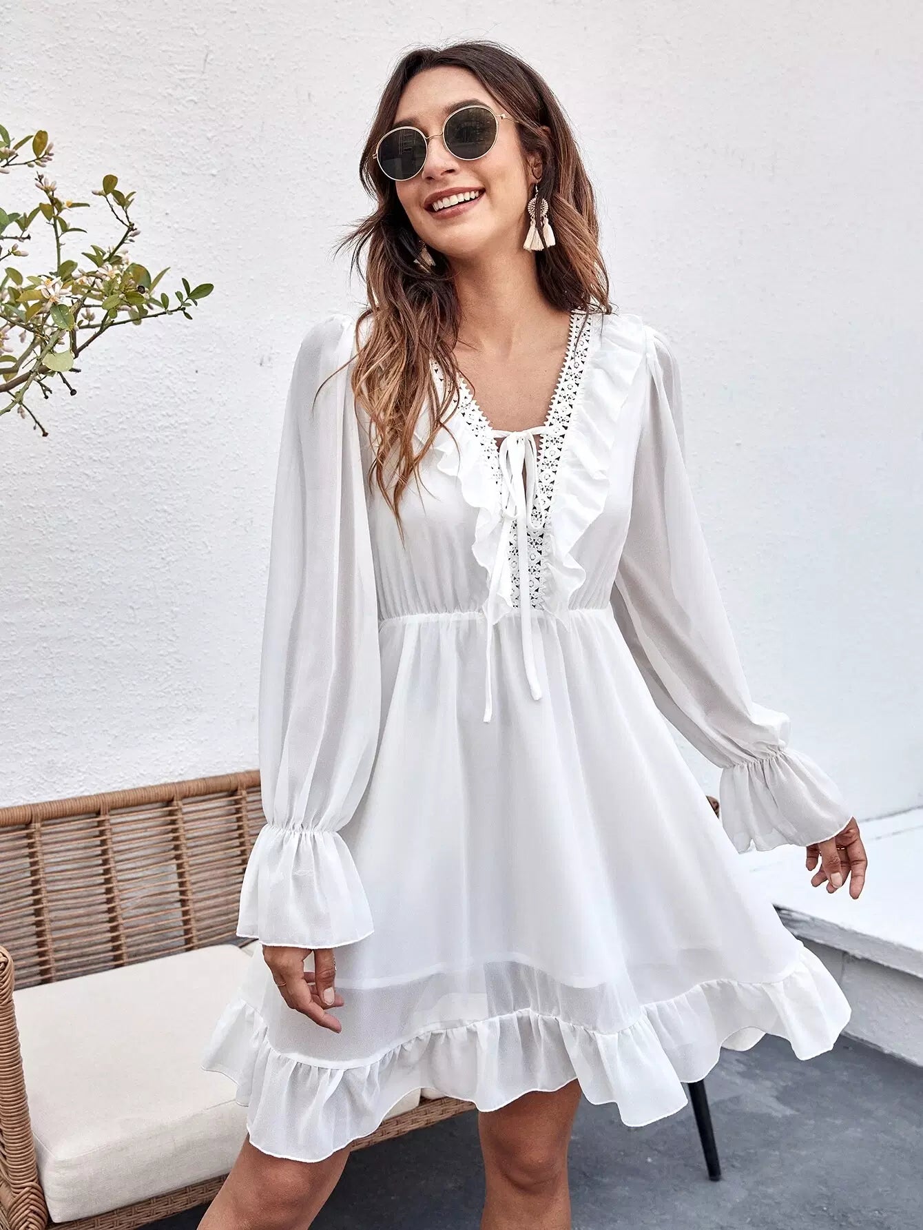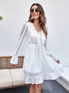فستان بأكمام جرس وربطة عنق أمامية من الدانتيل بحافة كشكش