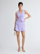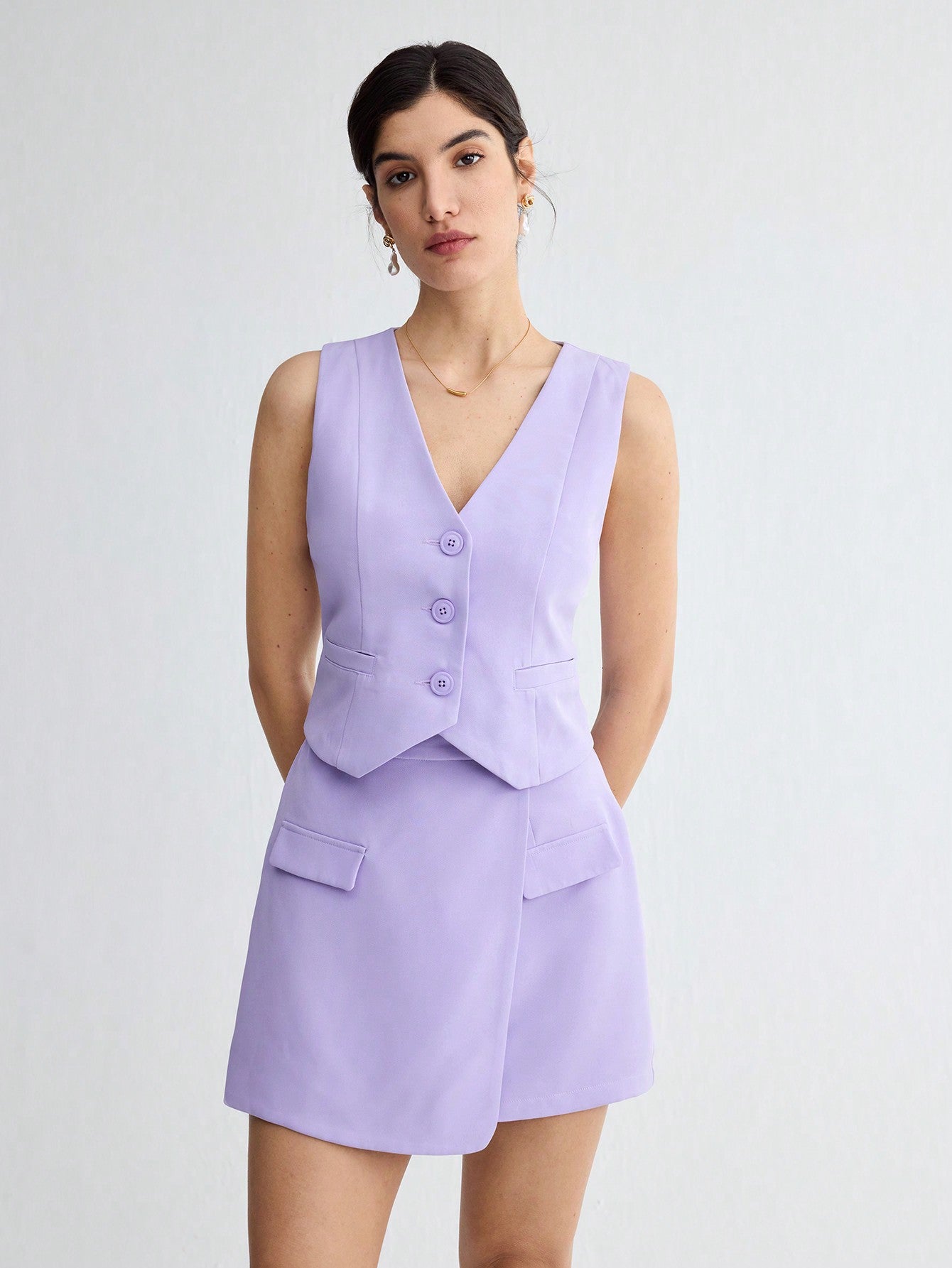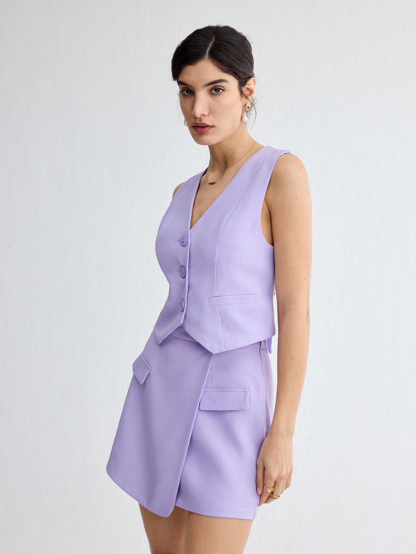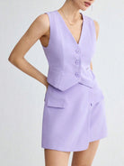 BizChic Women's Solid Color Sleeveless Suit Vest With Front Button Closure & Asymmetrical Hem Skirt With