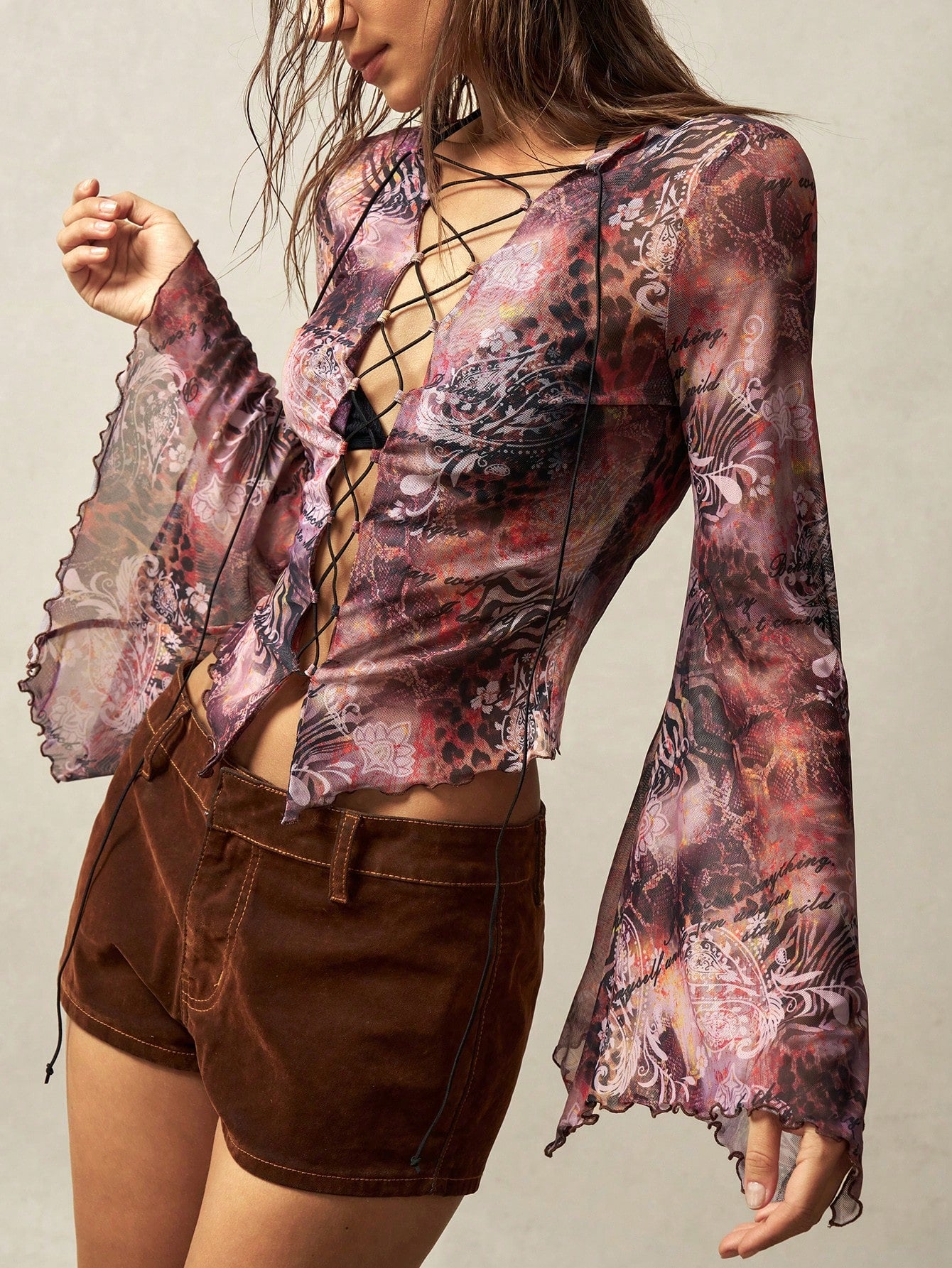 women Bohemela Boho Solid Color Knit Mesh Print Flare Sleeve Women Blouse