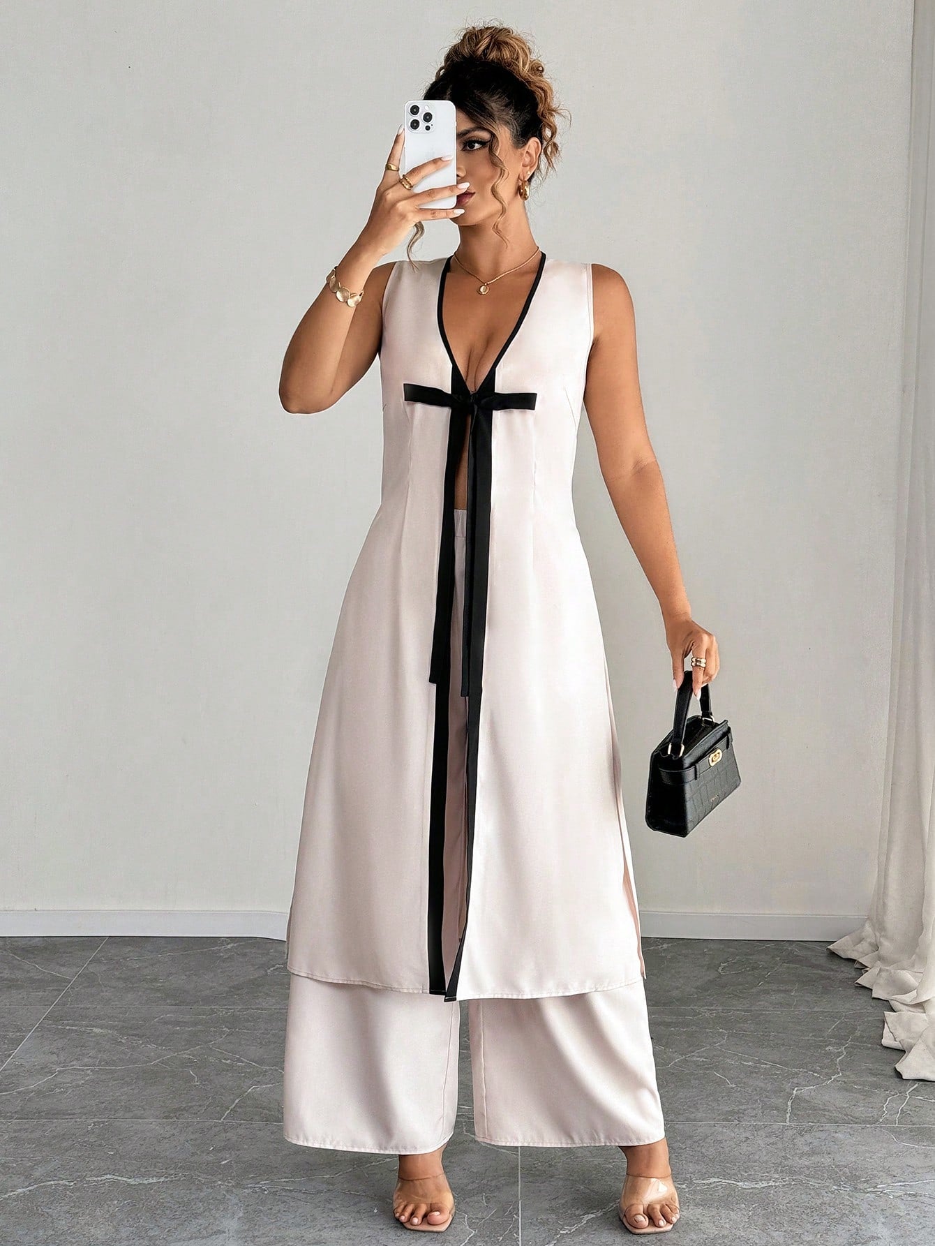 Celure 2 Pieces Elegant Casual Outfit: Sleeveless Colorblock Long Blouse Top And Wide Leg Pants Set,