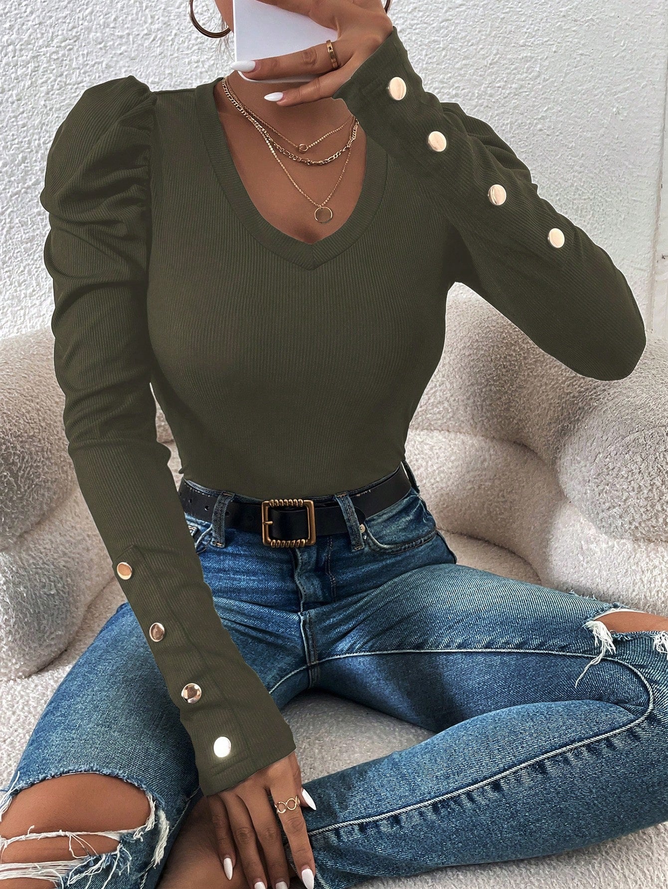 Chiquease Women's Puff Sleeve Button Decorated T-shirt
