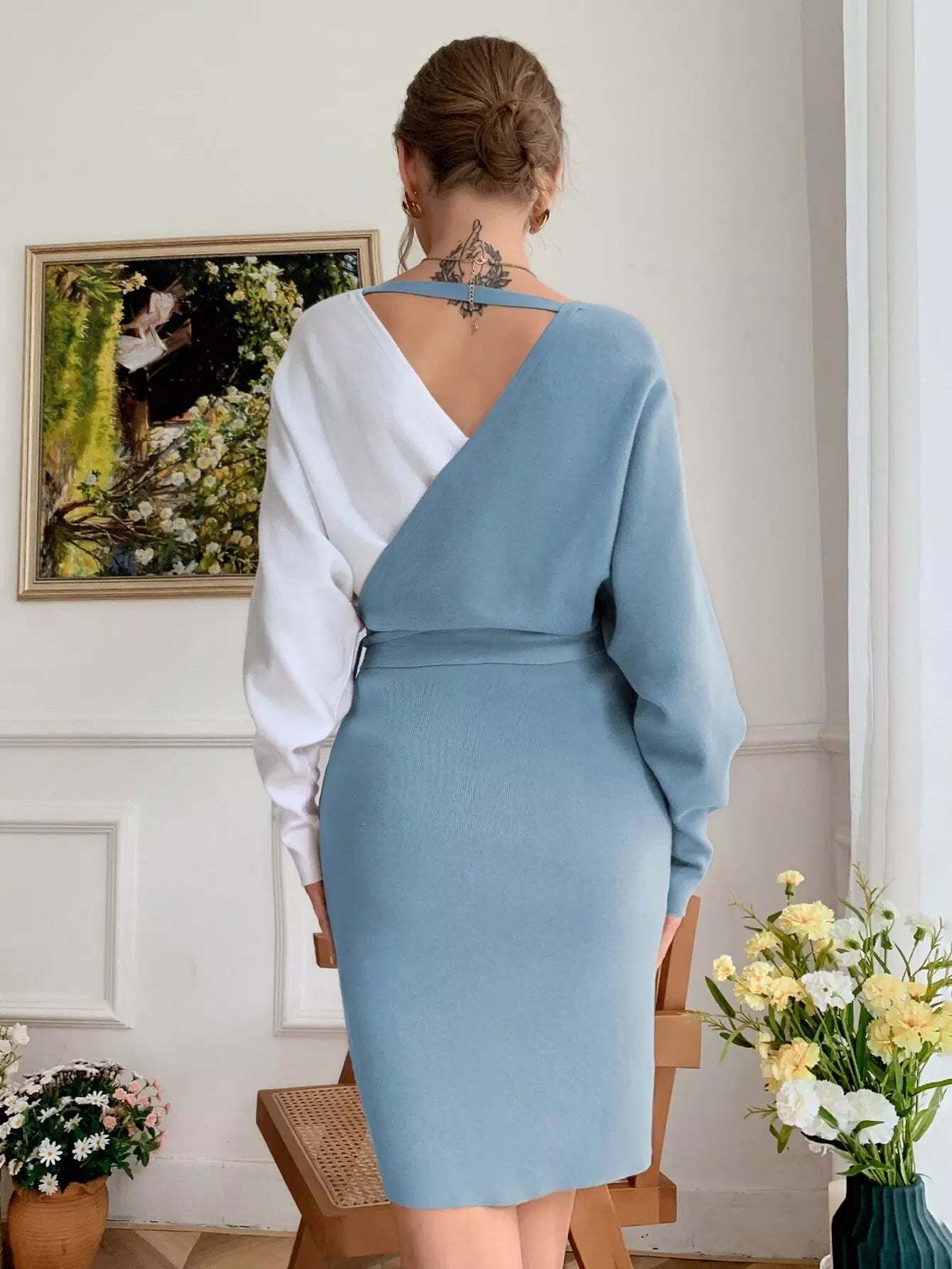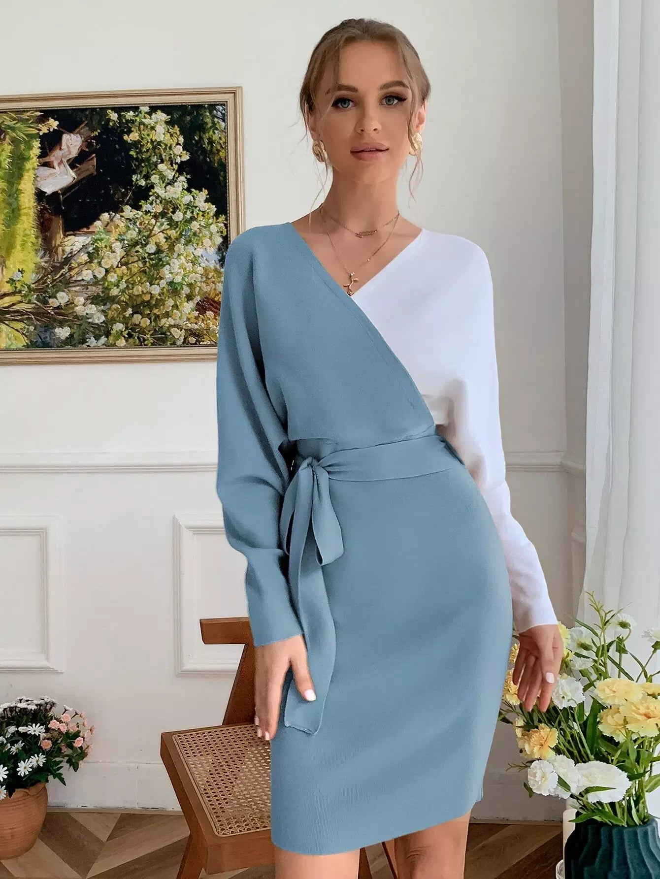 للنساء - فستان سترة بأكمام دولمان وربطة جانبية