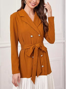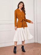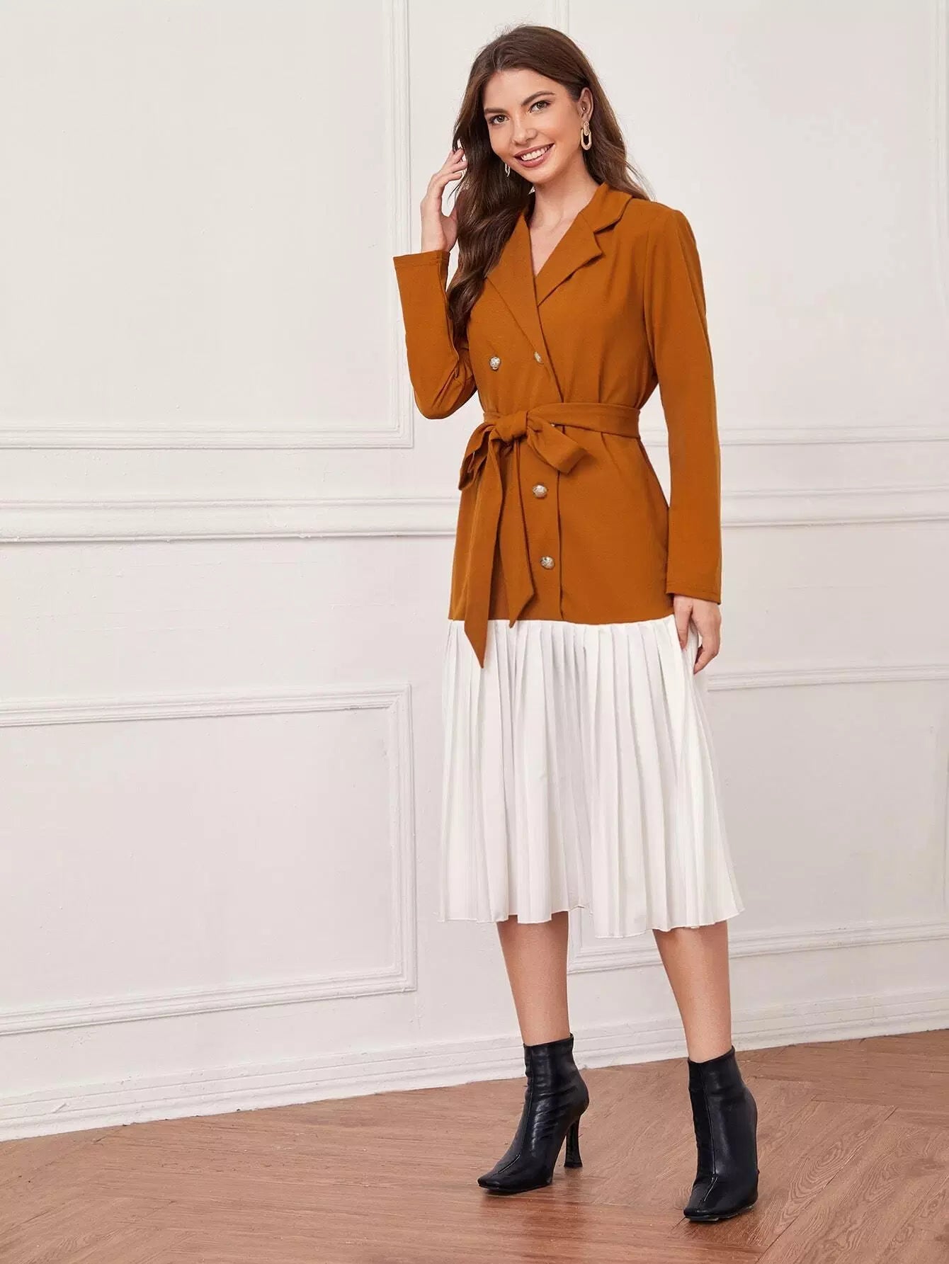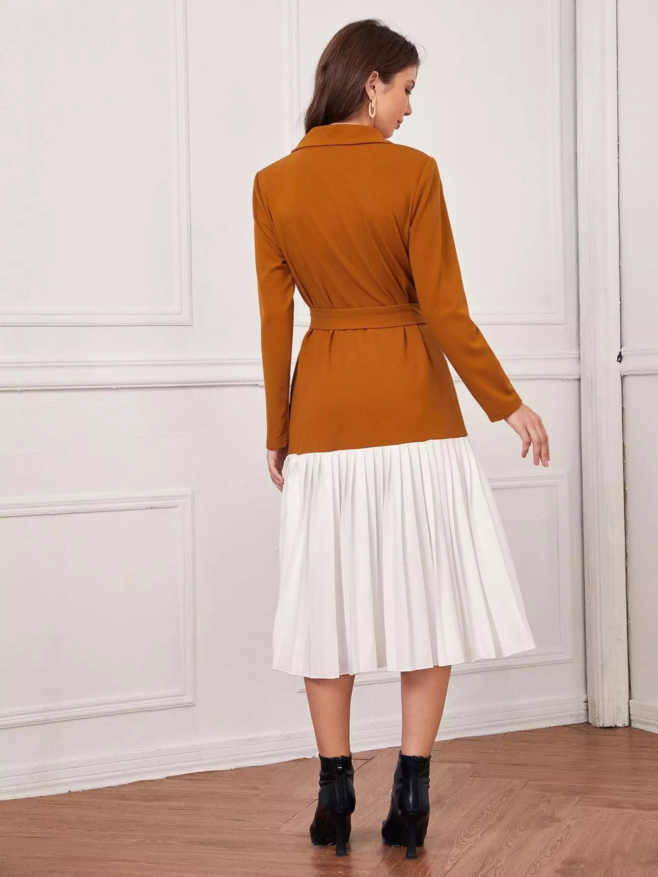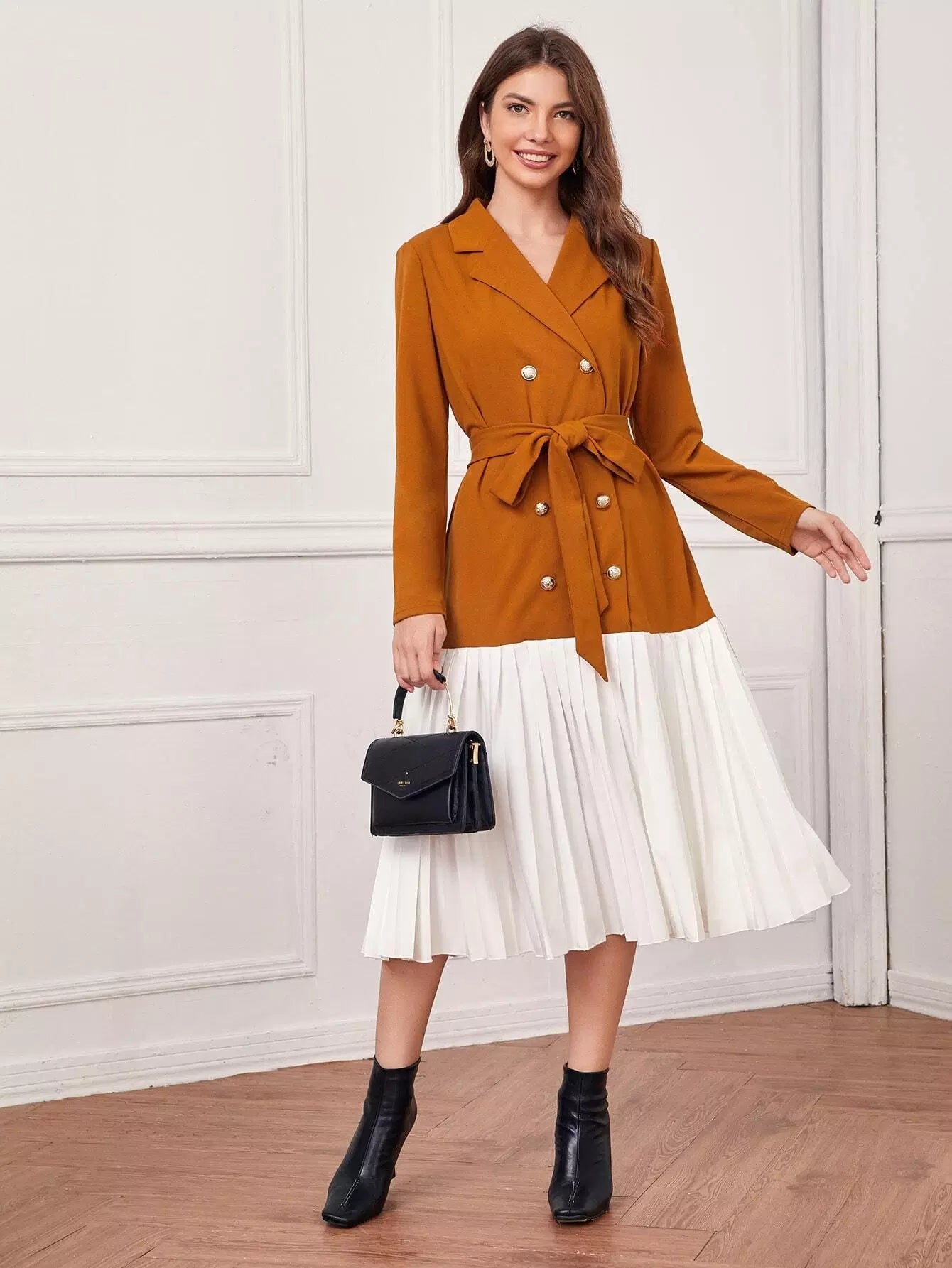 فستان ذو طيات مزدوجة الصدر وكتلة الألوان بدون حزام