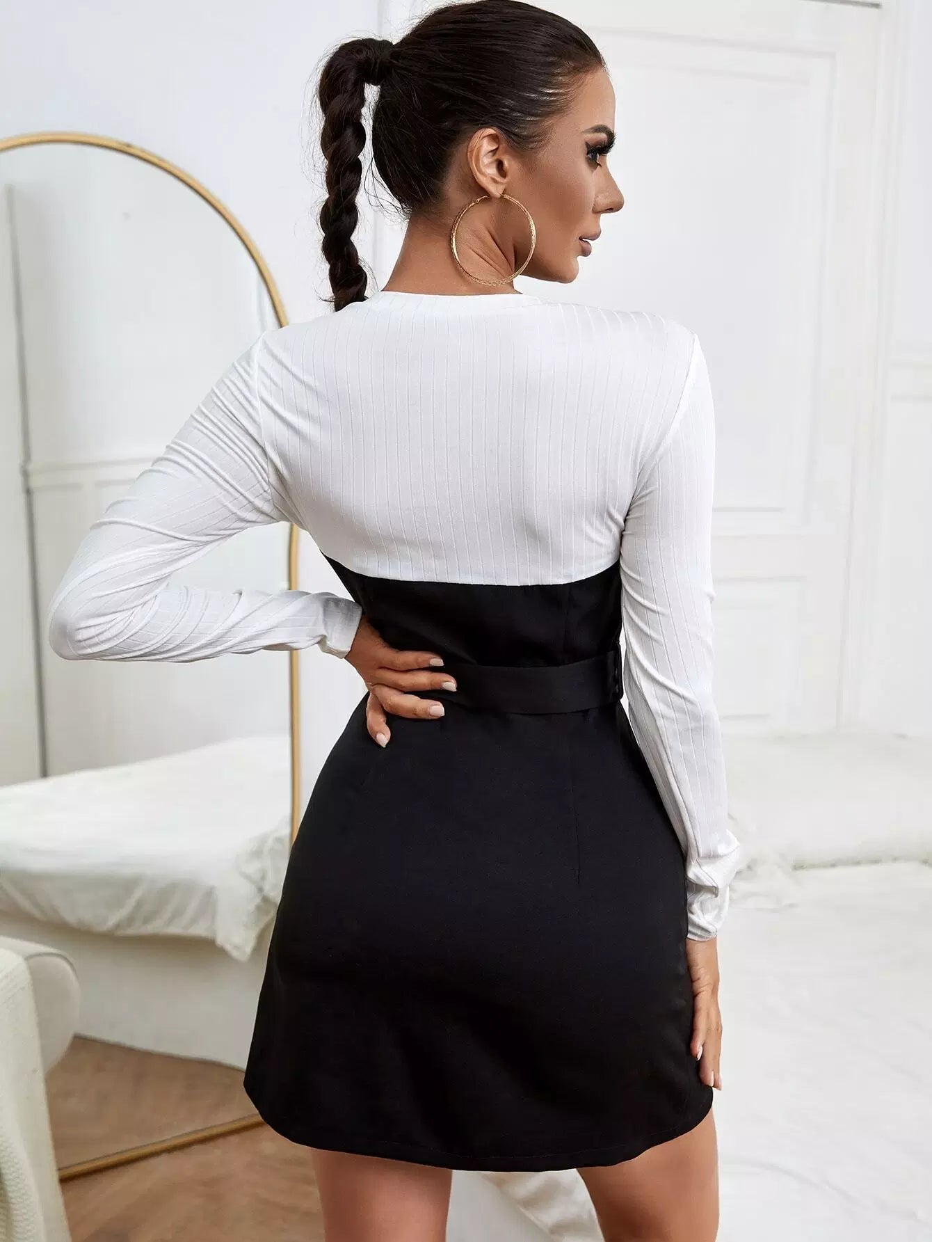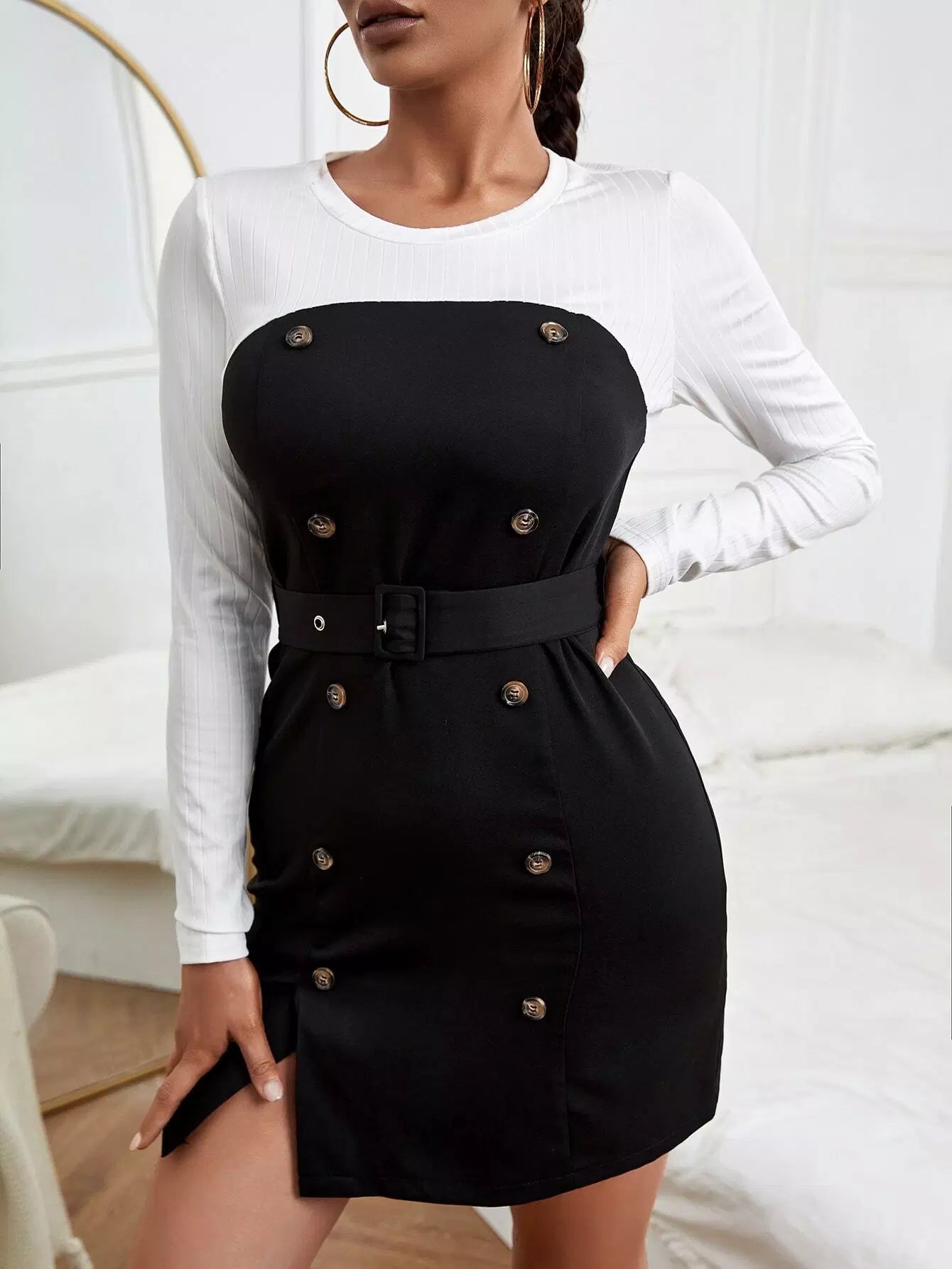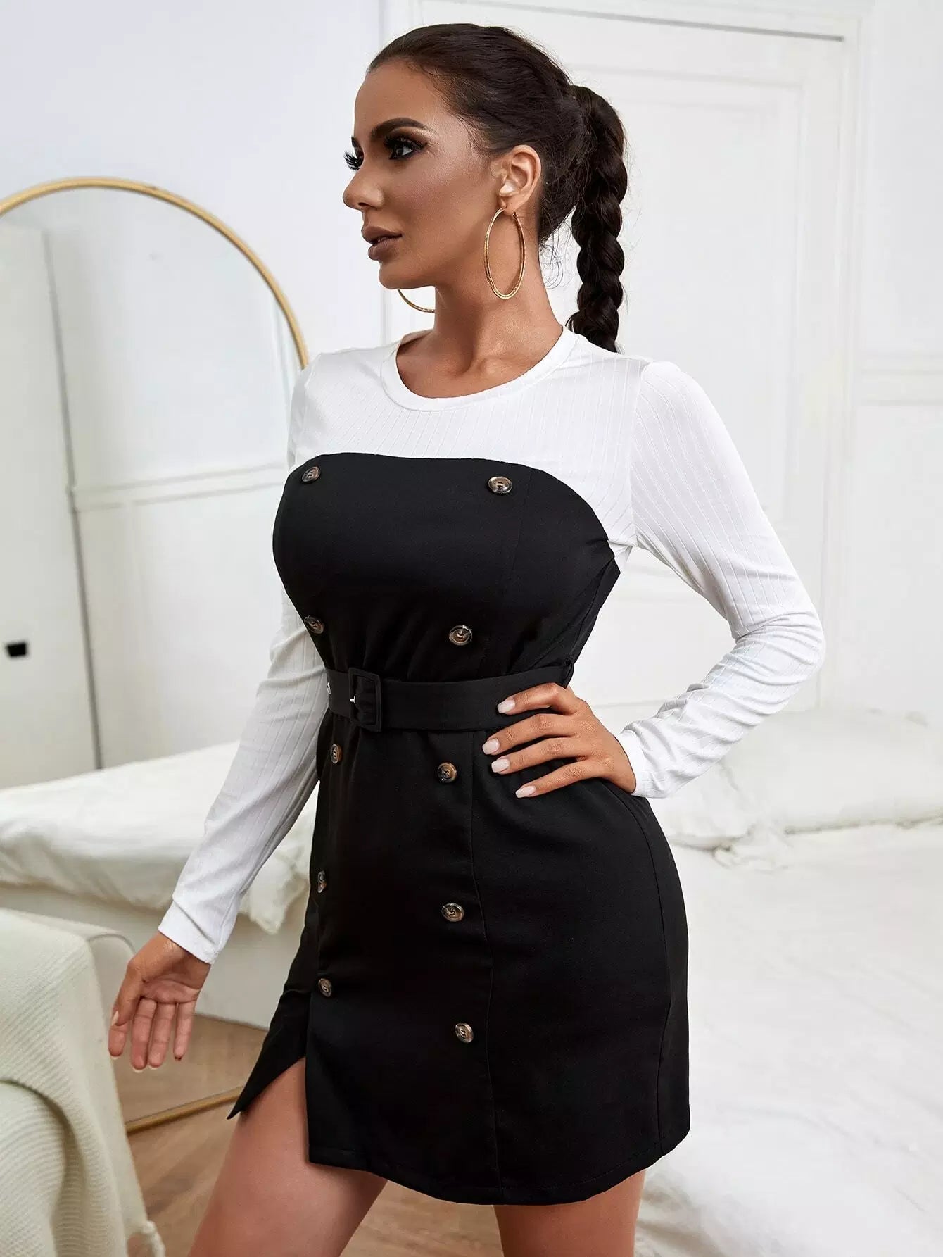فستان كولوربلوك بأزرار مزدوجة بدون حزام