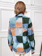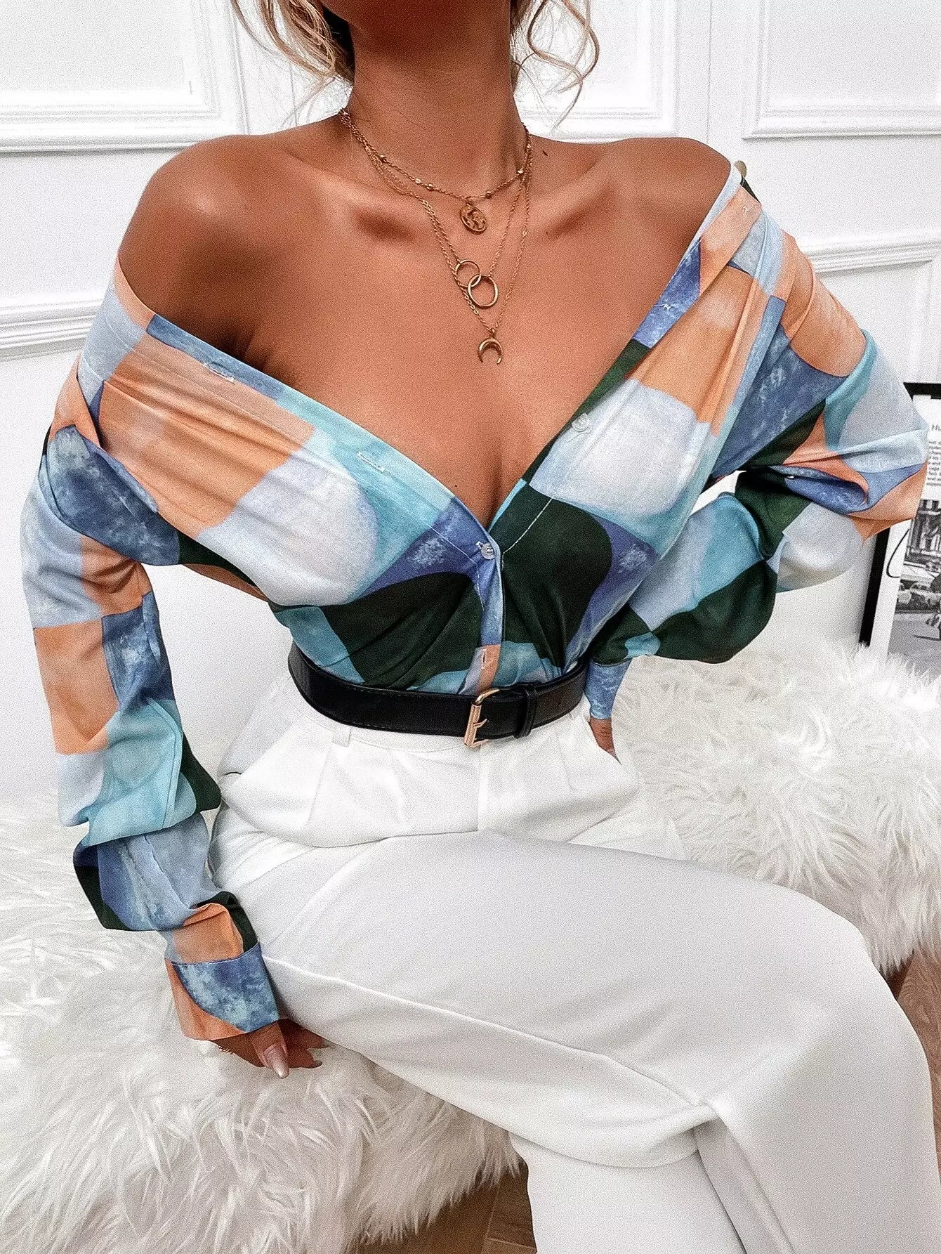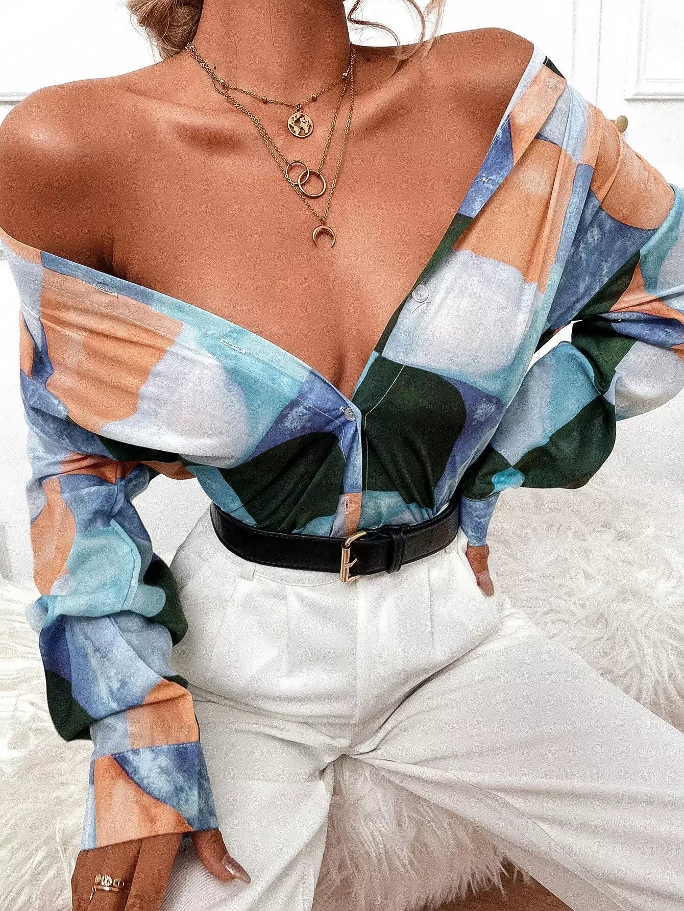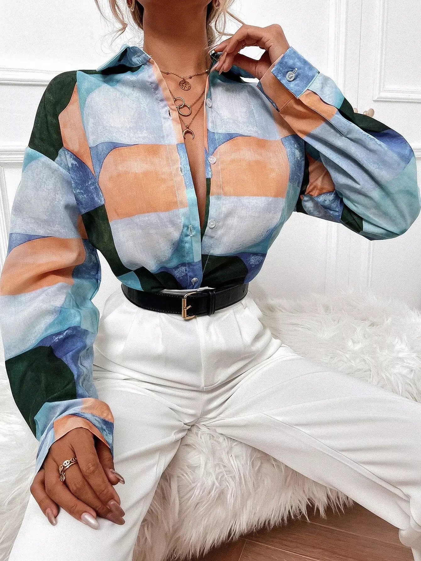 قميص بأزرار أمامية بأزرار منسدلة الكتفين ملون
