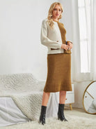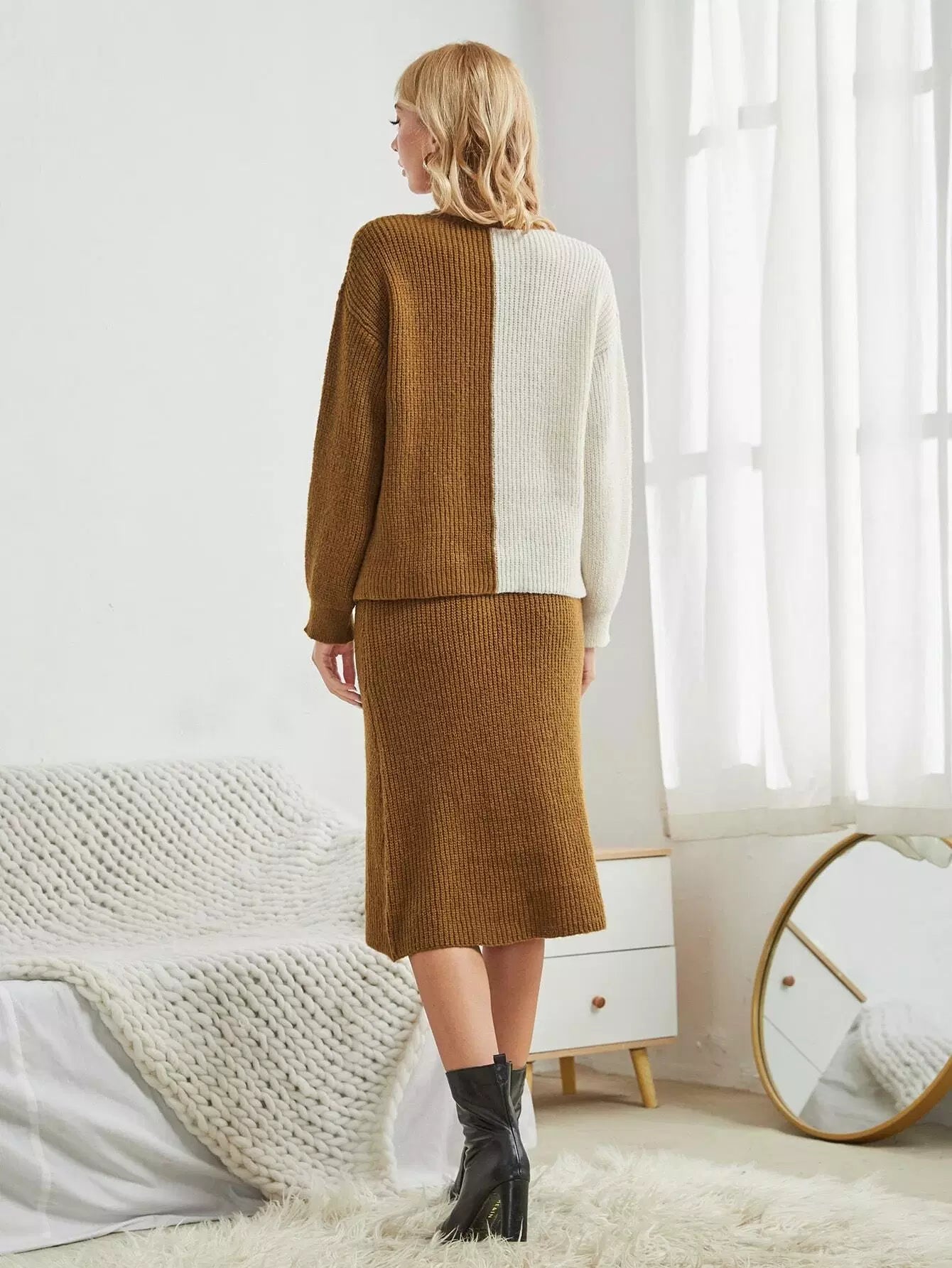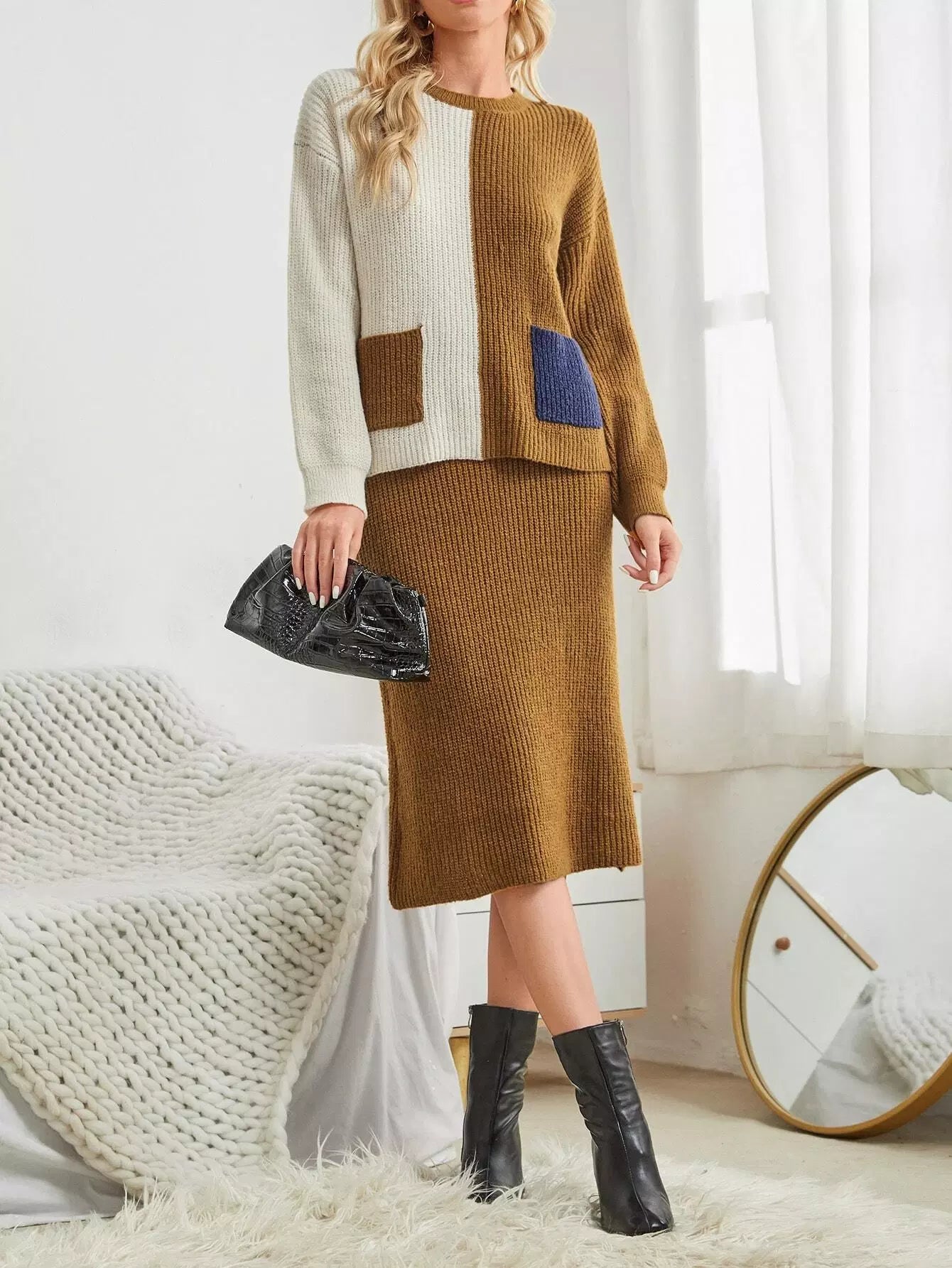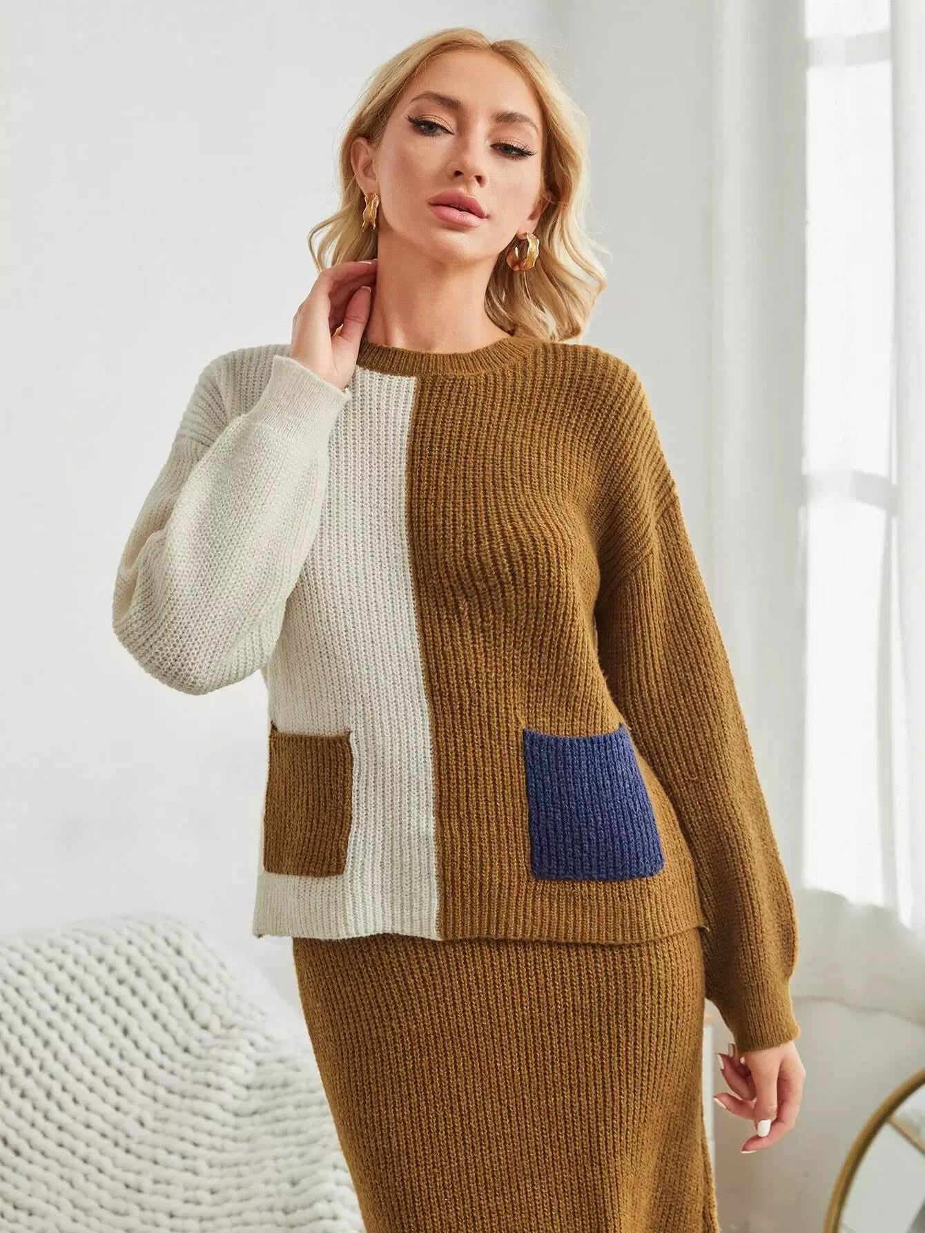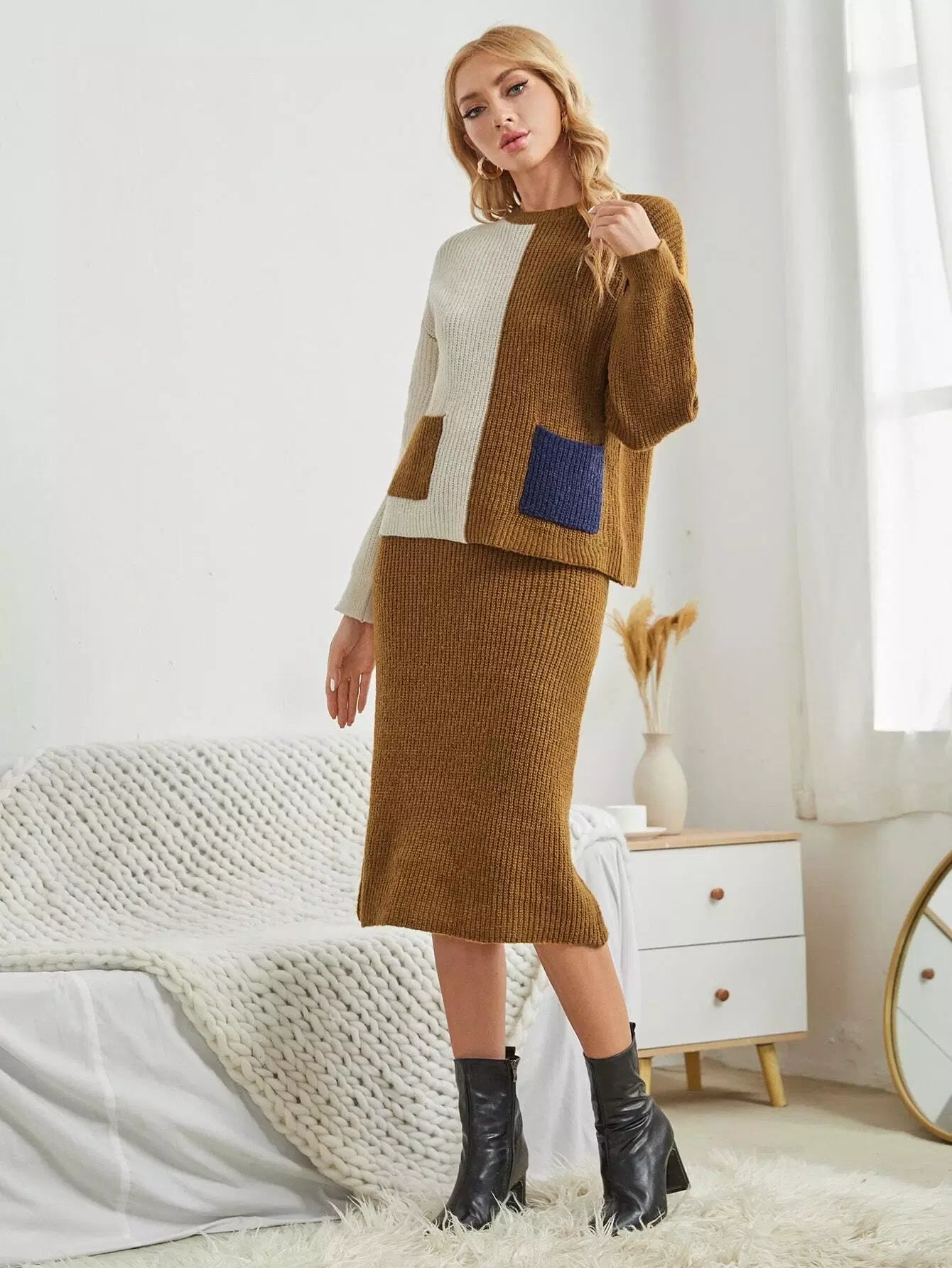 سترة مزينة بجيب ملون مقسم بالألوان وتنورة محبوكة سادة