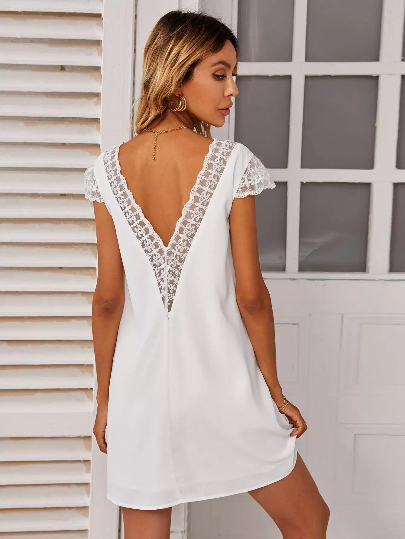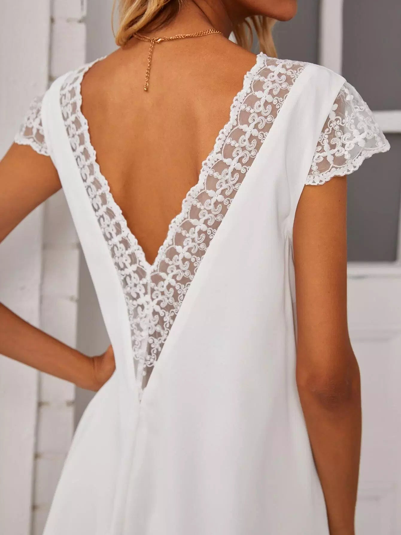 فستان برقبة مزدوجة على شكل V من الدانتيل بلون مغاير