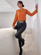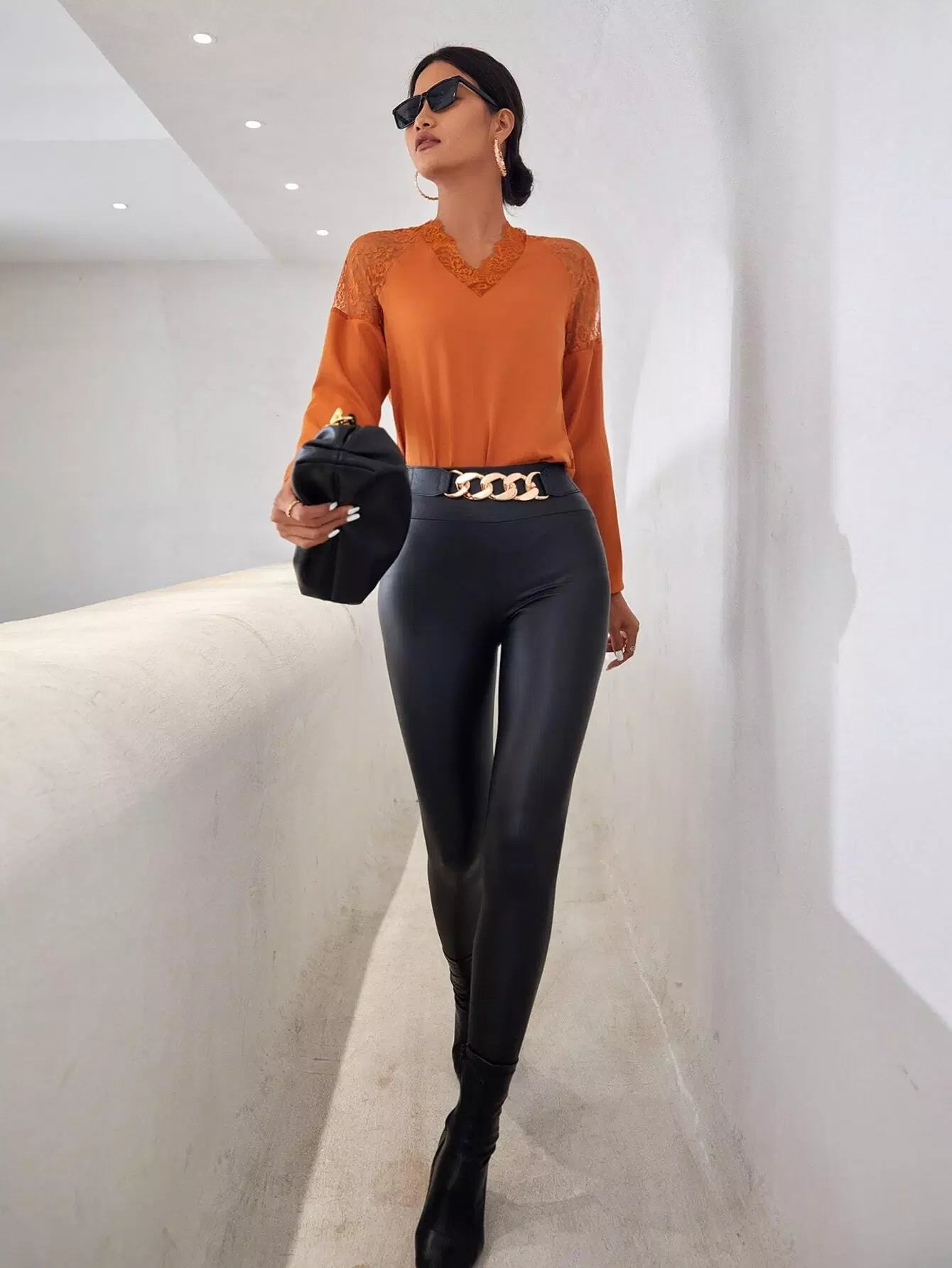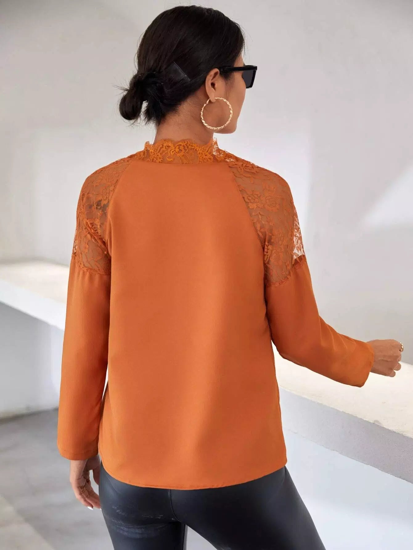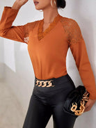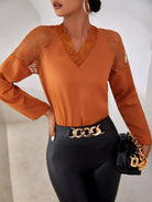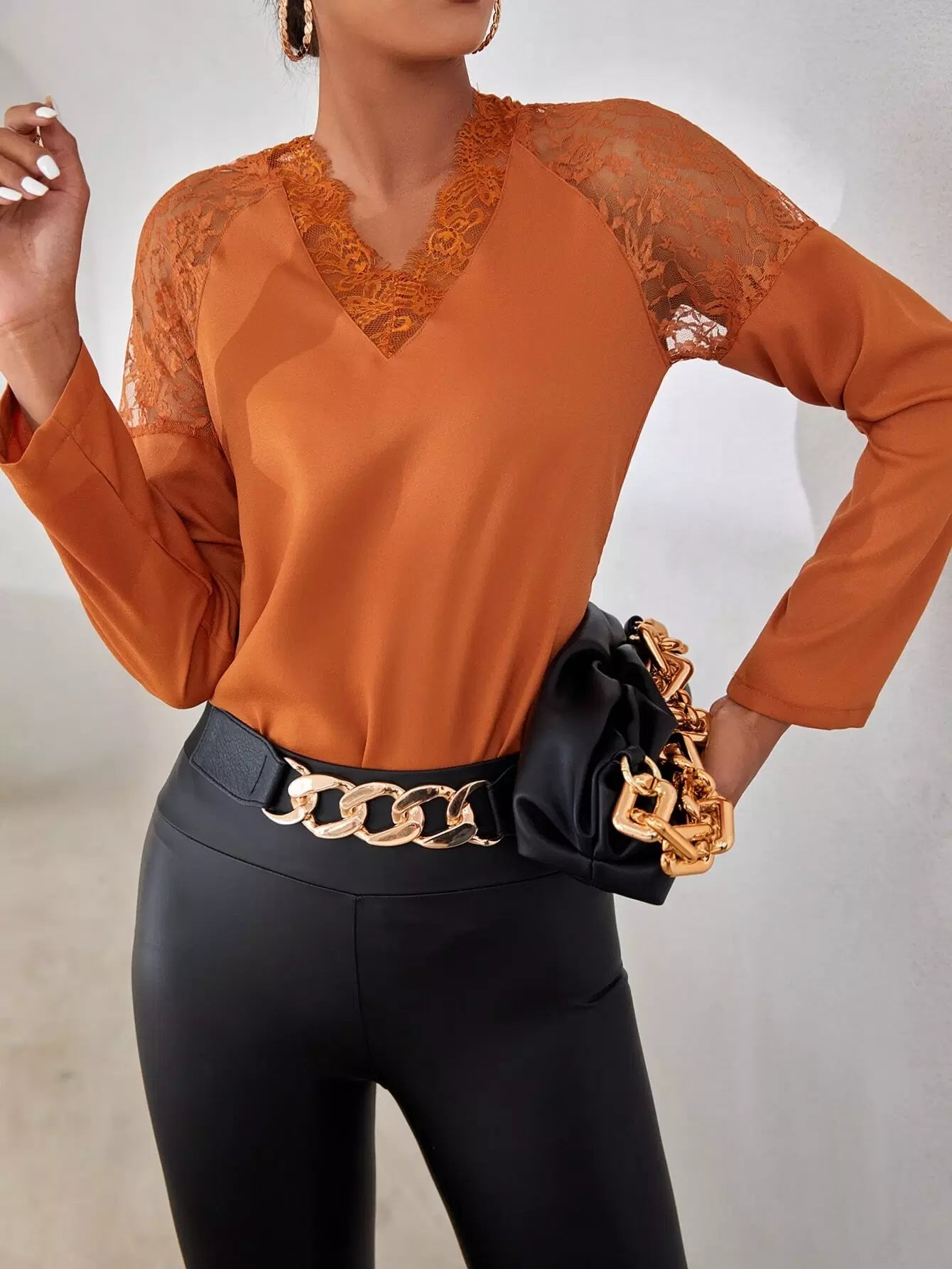 بلوزة بياقة على شكل V بياقة على شكل V دانتيل على شكل صدفة بلون مغاير