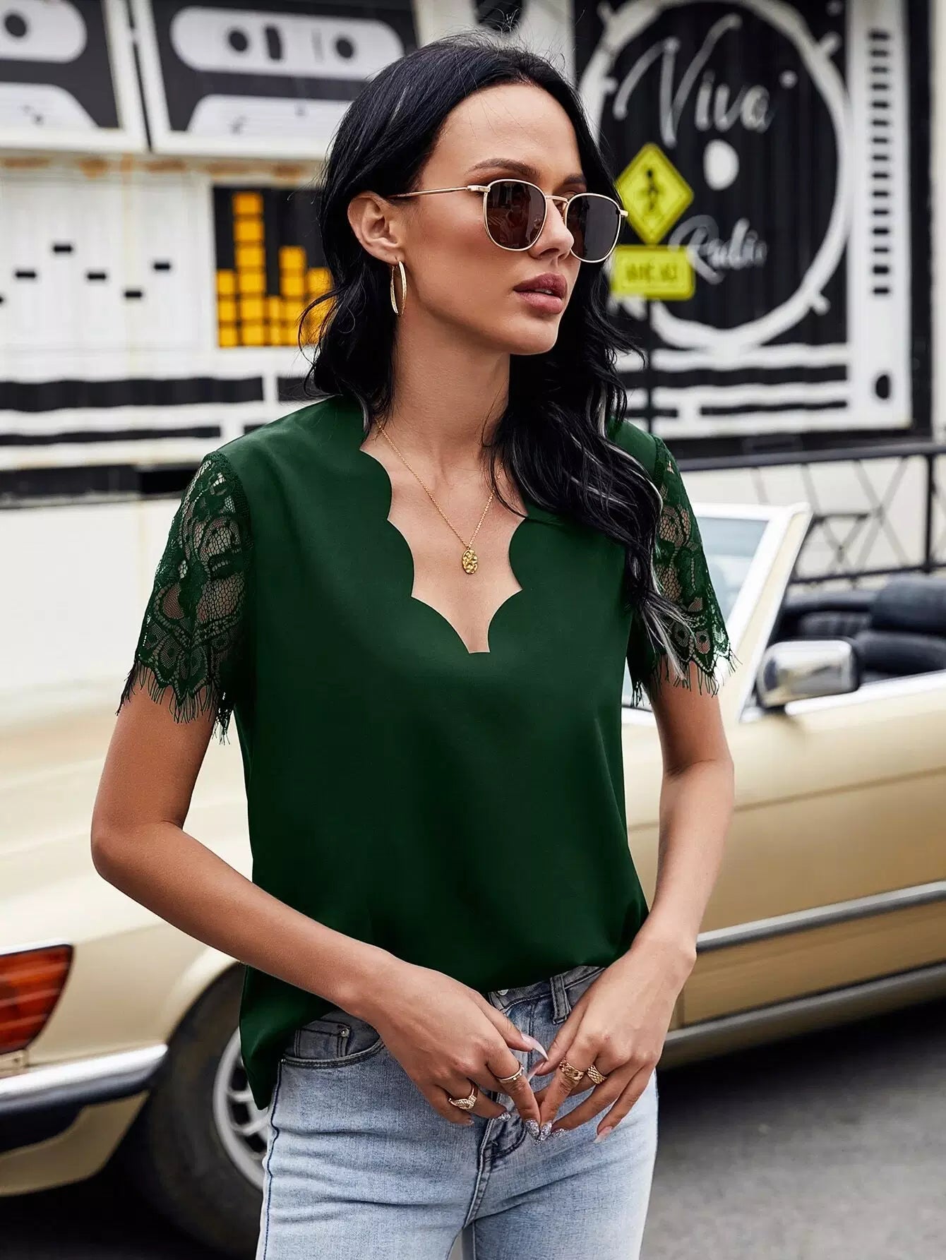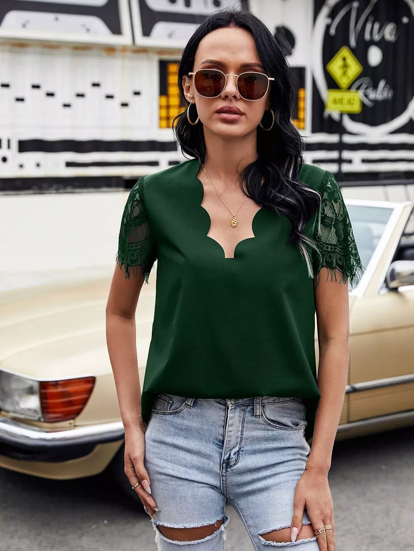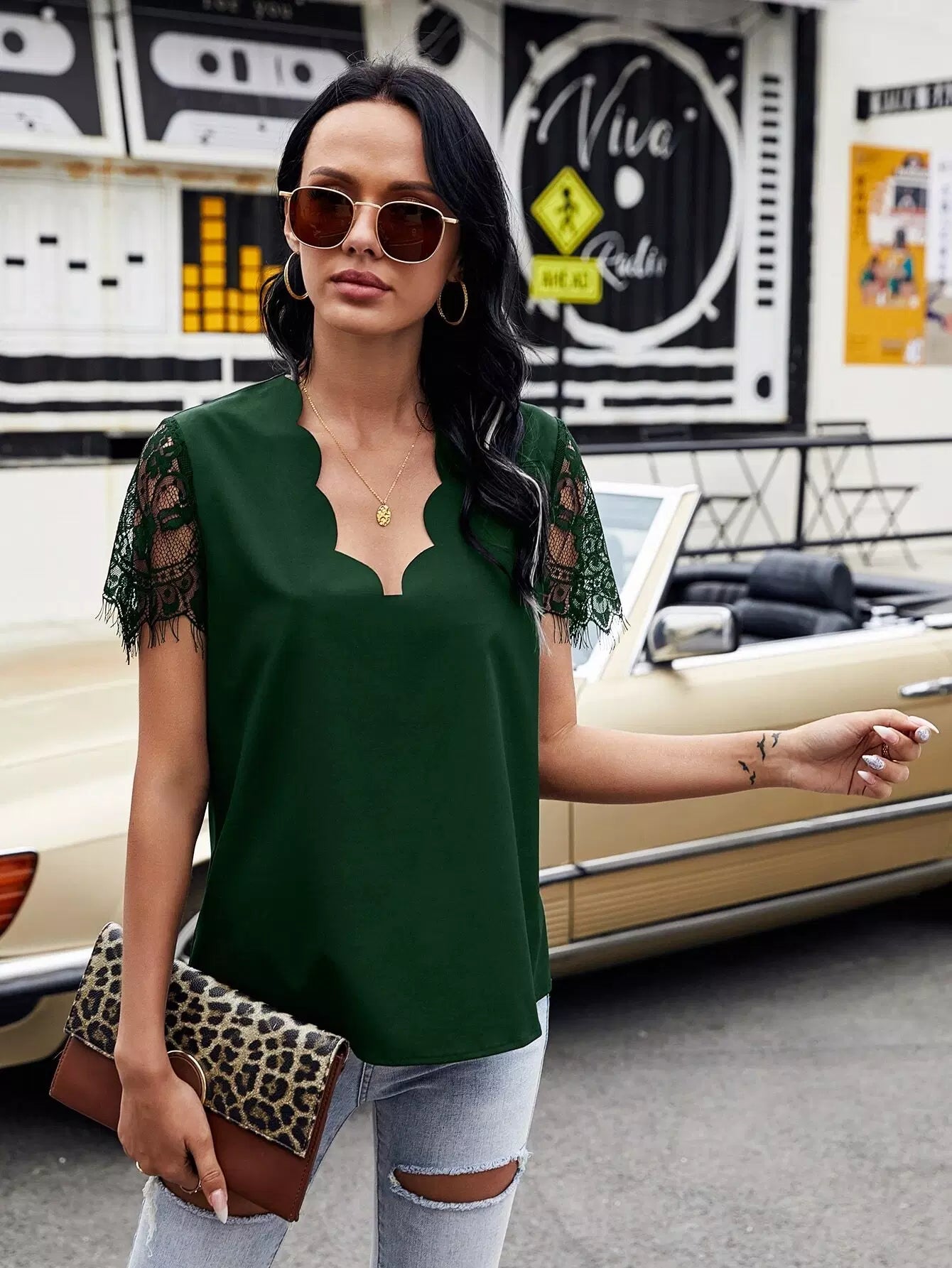 للنساء - بلوزة ذات أكمام دانتيل متباينة ورقبة صدفية