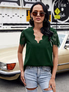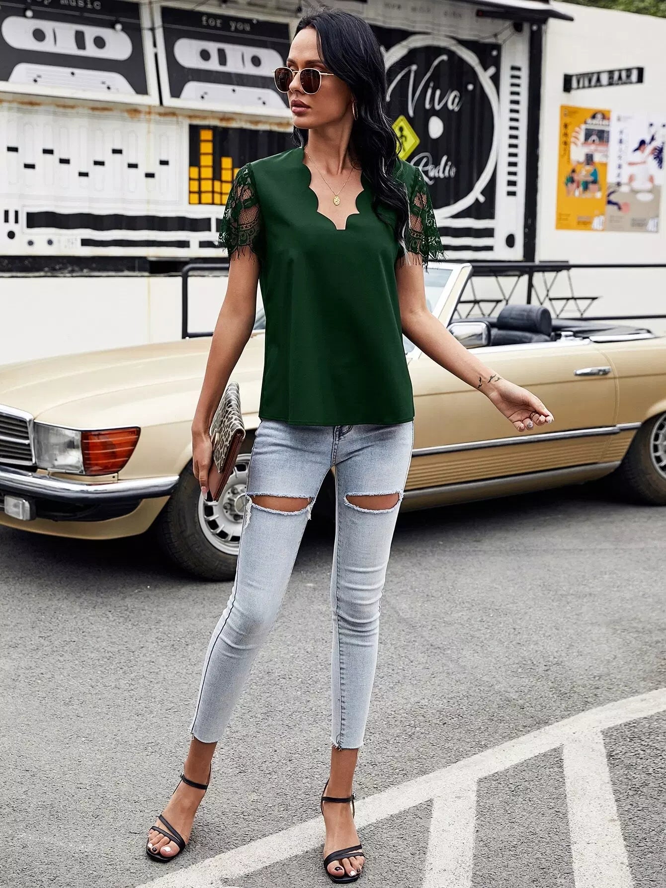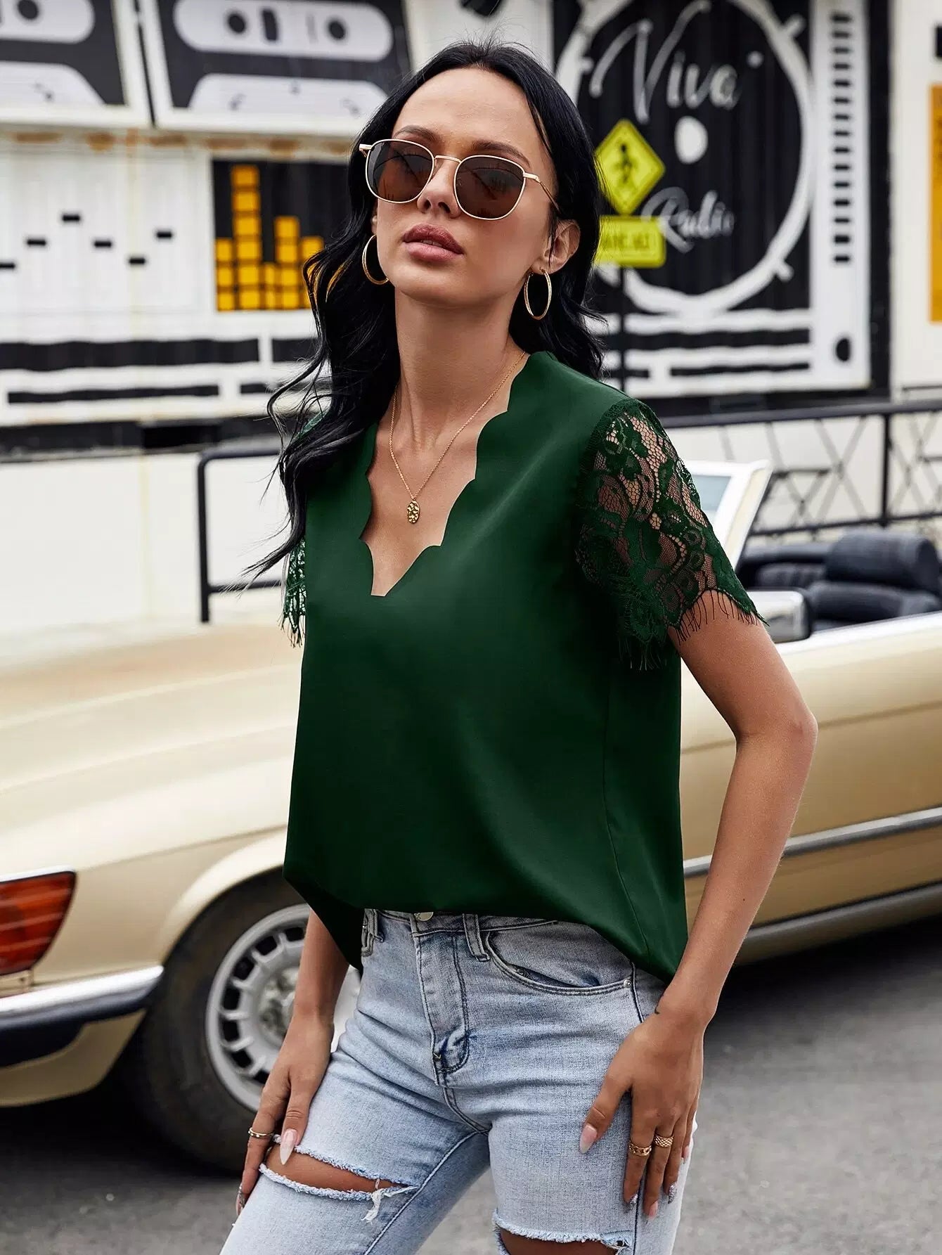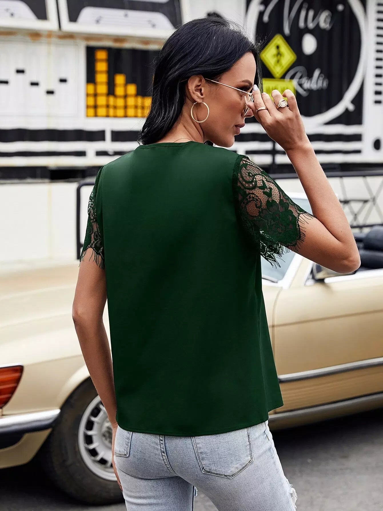 للنساء - بلوزة ذات أكمام دانتيل متباينة ورقبة صدفية