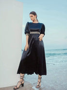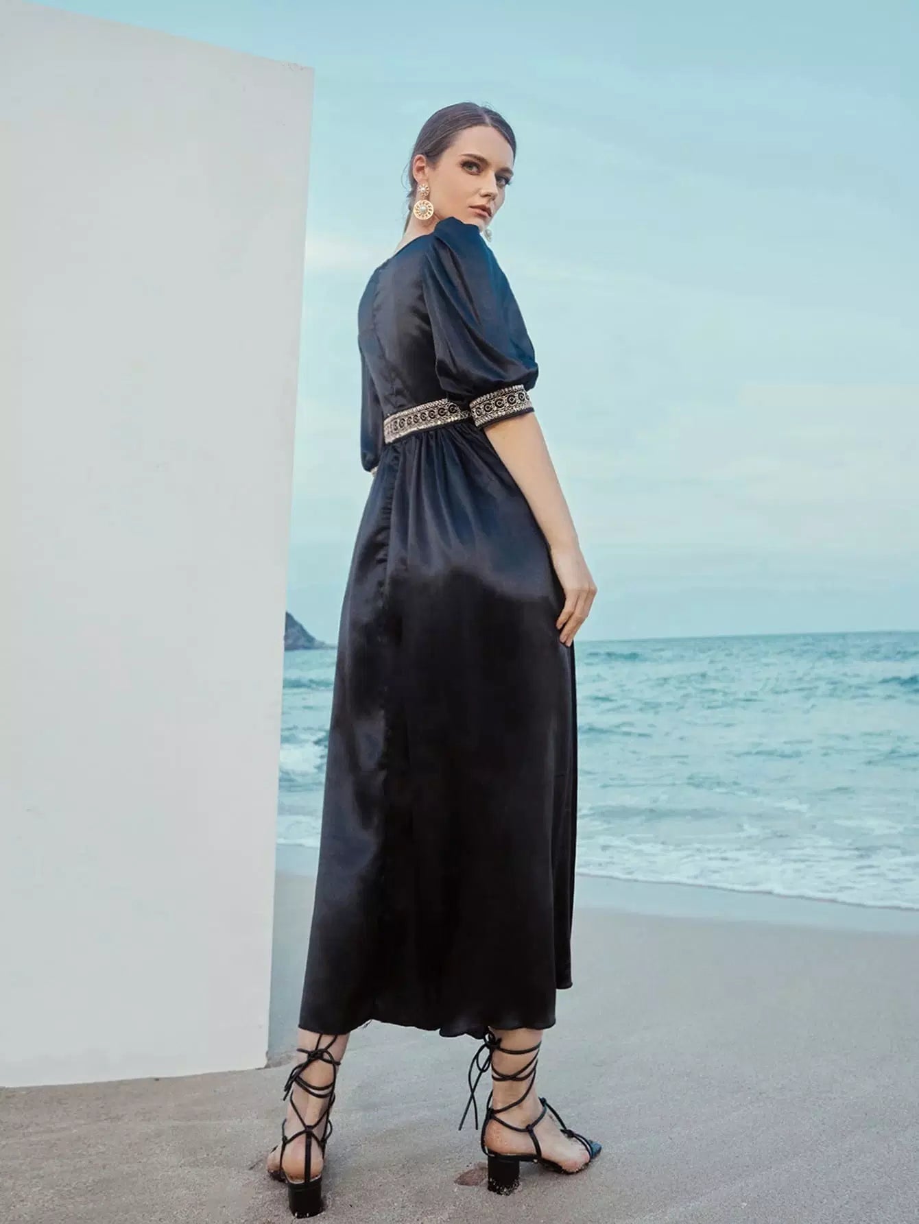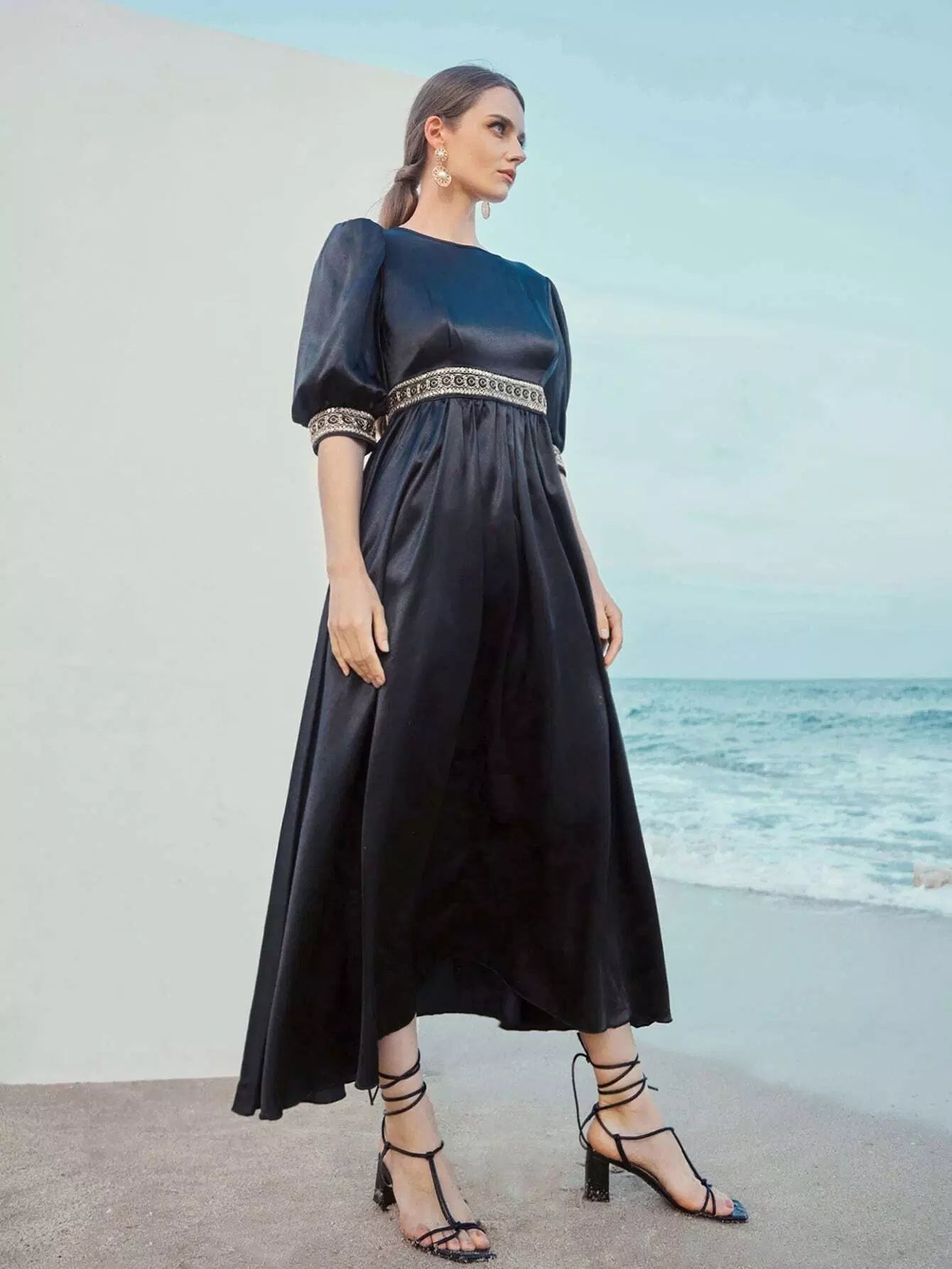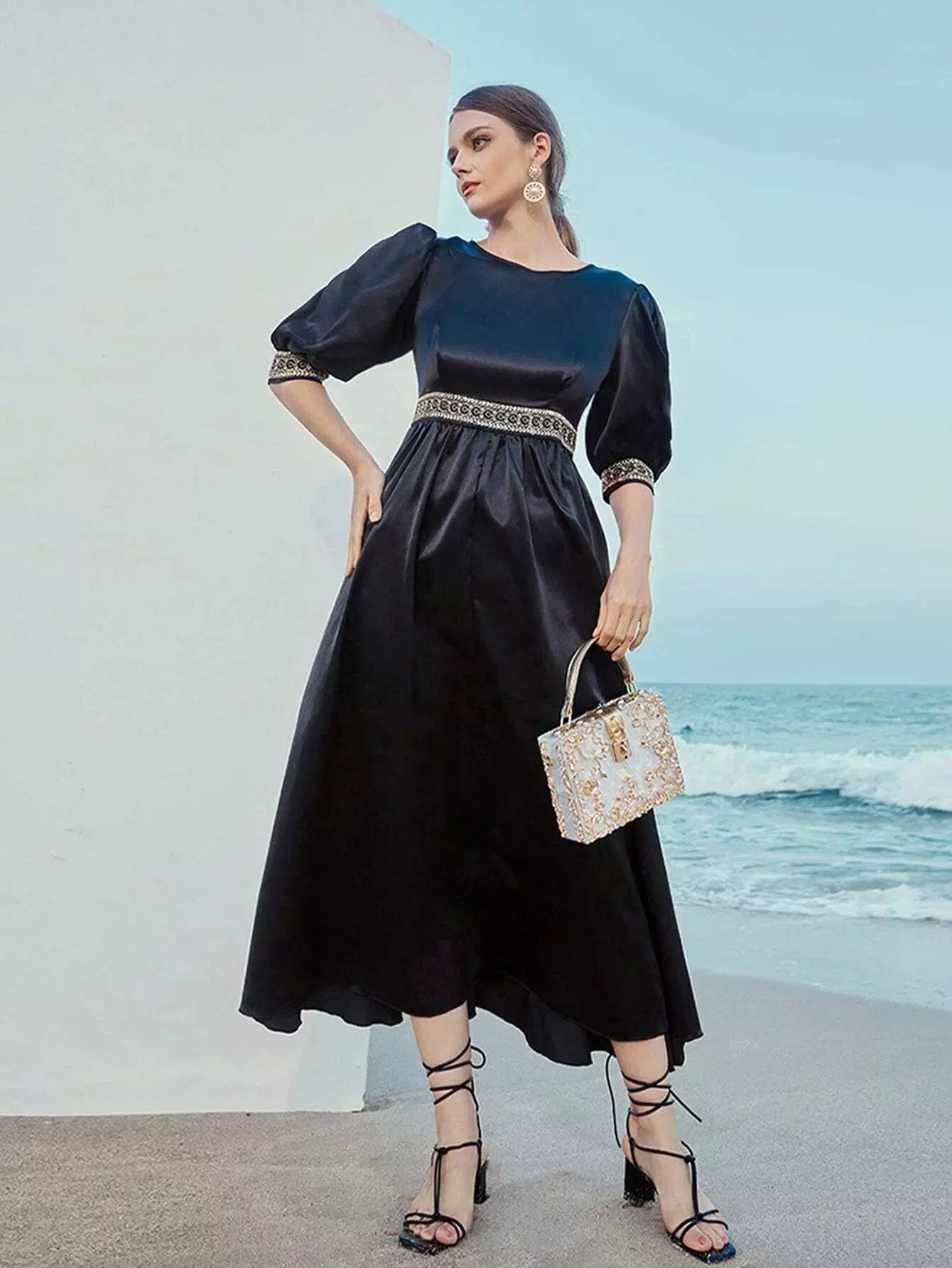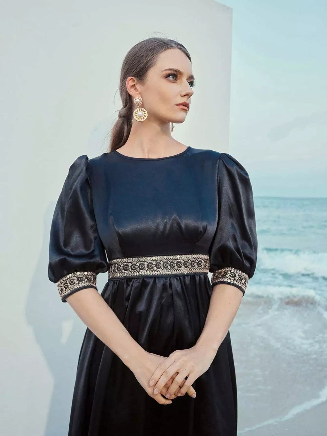 فستان بأكمام منفوشة من الساتان بأكمام منفوشة بلون مغاير على شكل حرف A