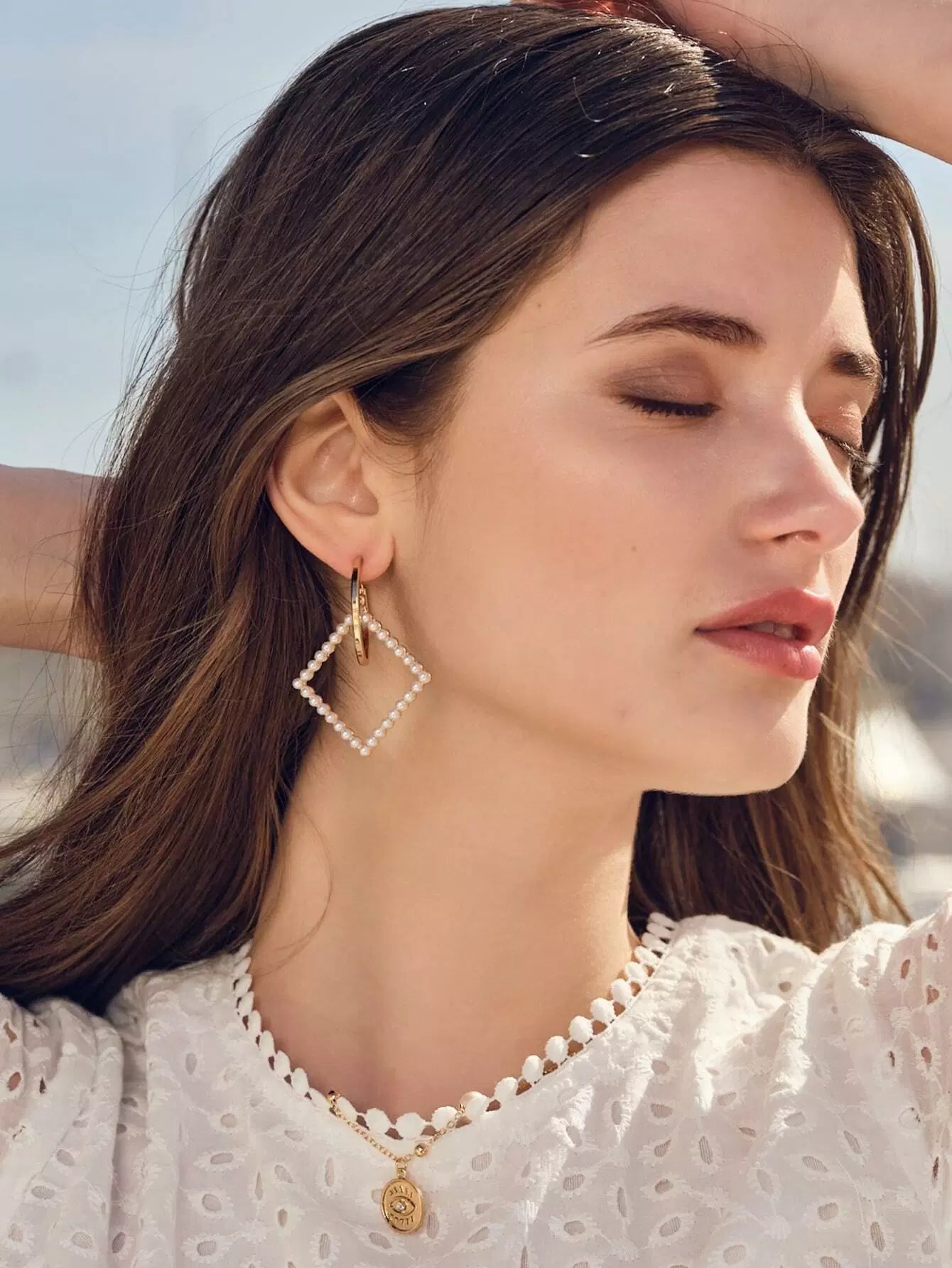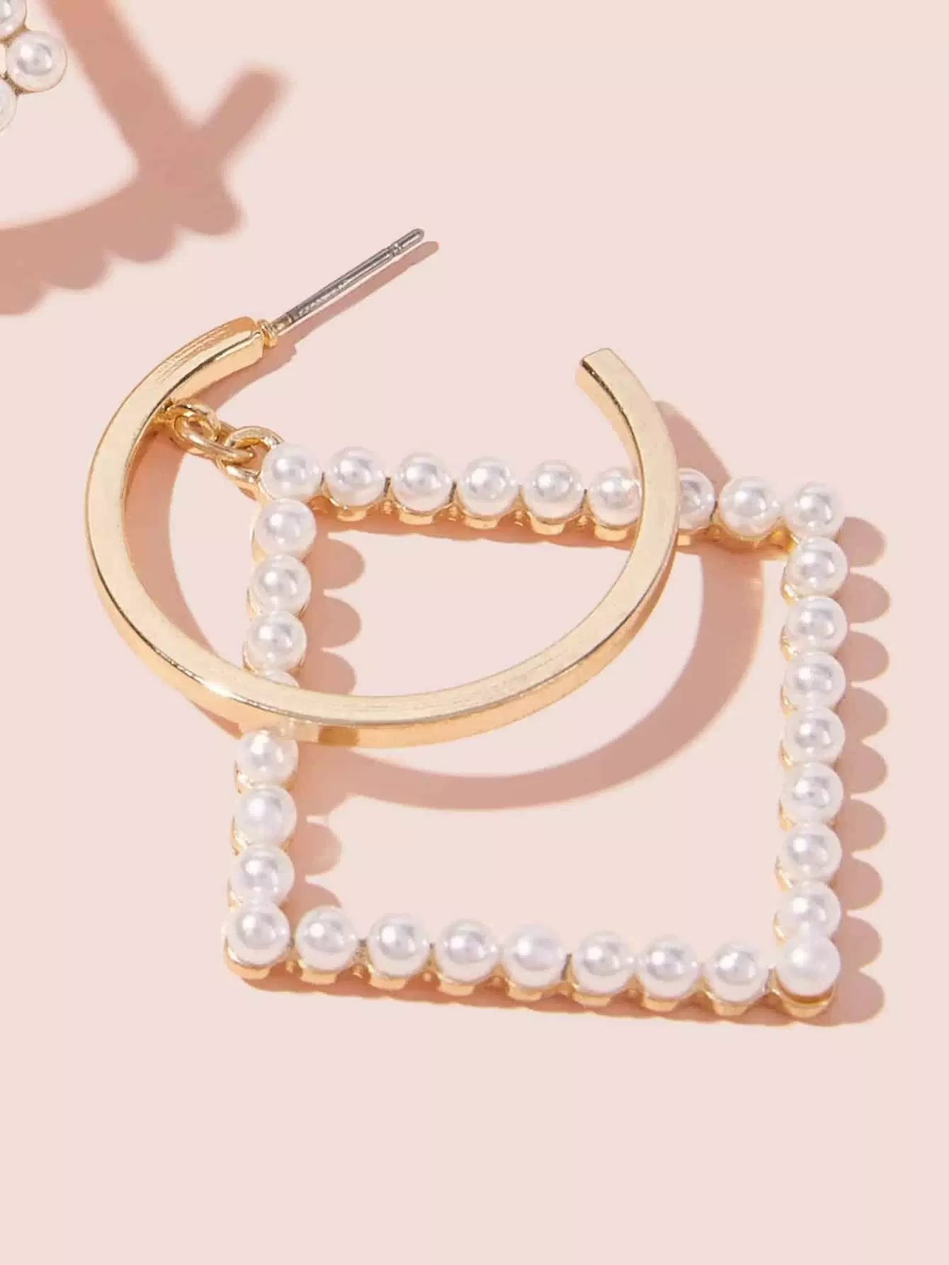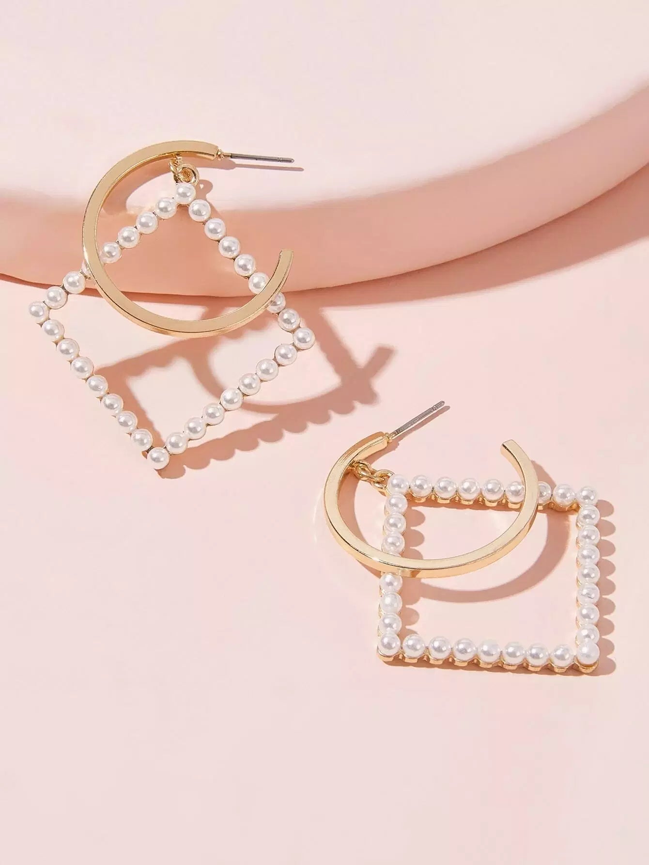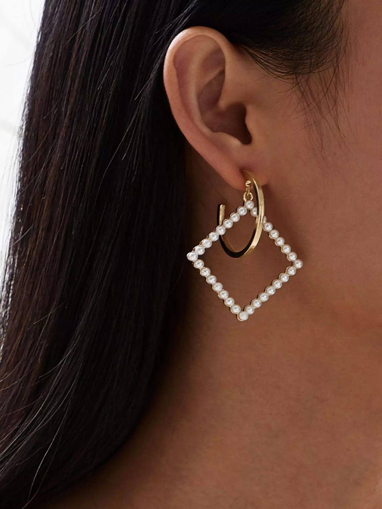 أقراط متدلية هندسية مزينة باللؤلؤ الصناعي على شكل حلقة، زوج واحد